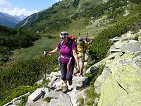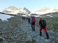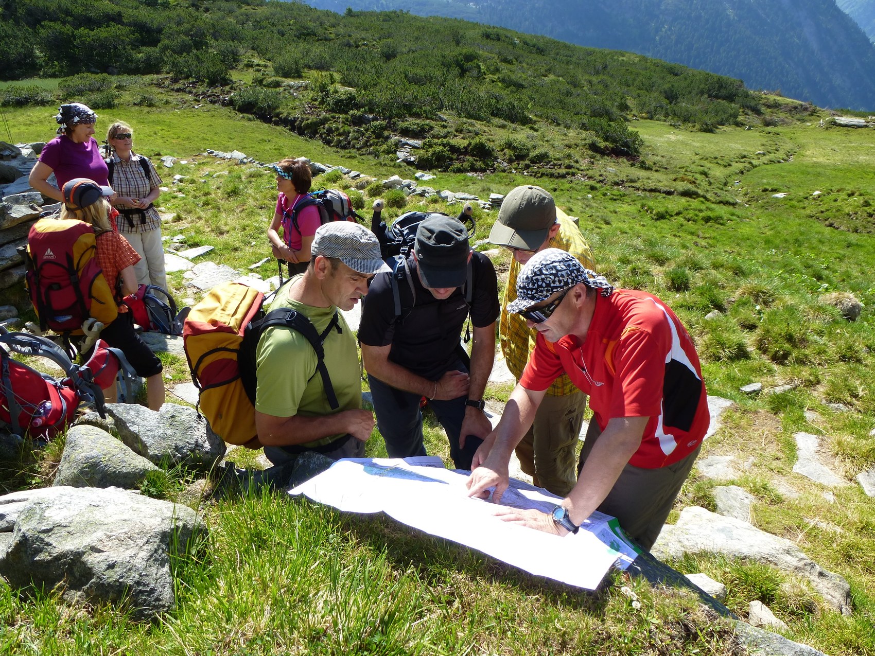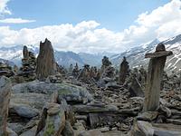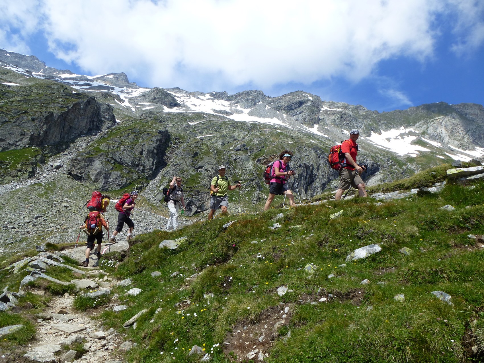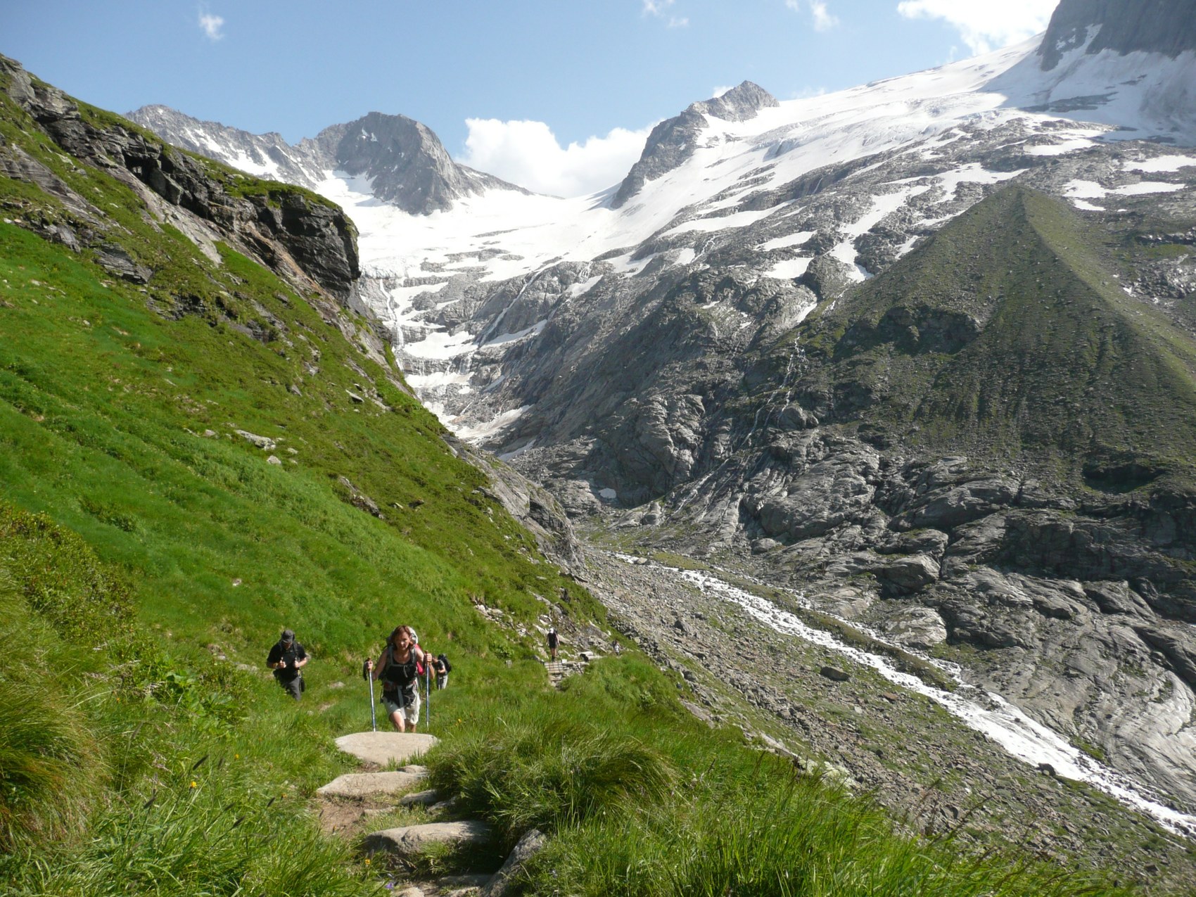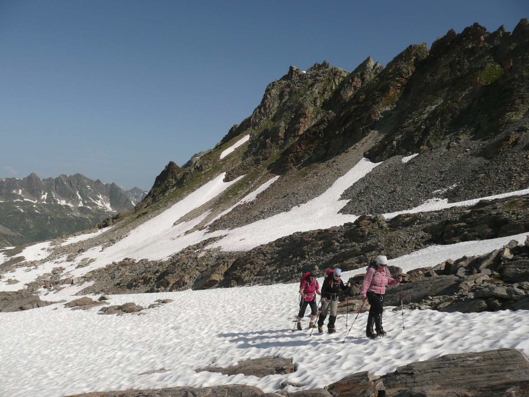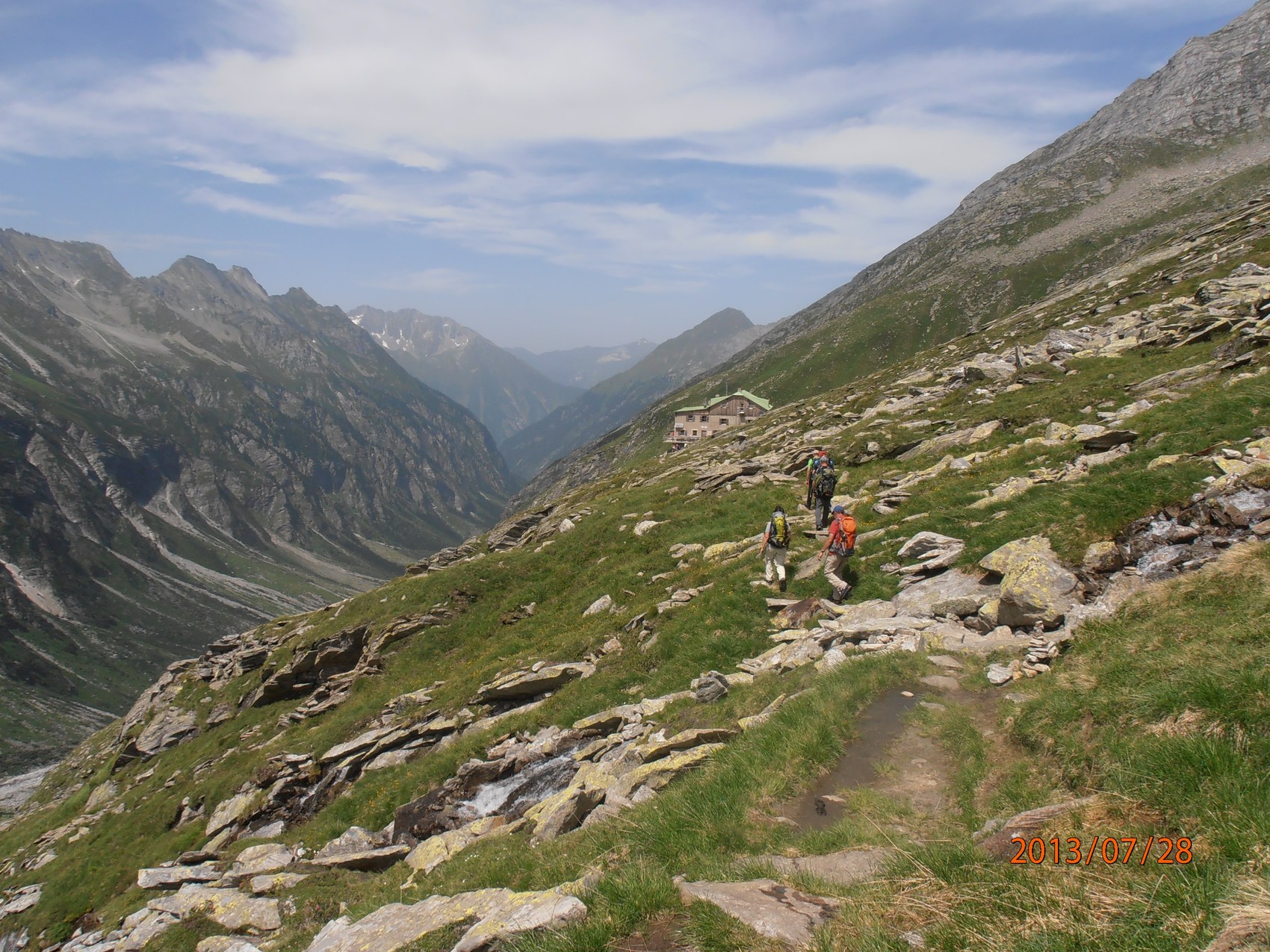 Vom Schlegeisspeichersee ging es über das Friesenberghaus nach einer kurzen Kaffepause zum eher unscheinbaren Petersköpfel in der Nachbarschaft des Hohen Rifflers (3 231 m). Auf dem Gipfel erwartete unser ein wahrer Wald aus Stoamandln unterschiedlicher Größe und Form. Beim Gang durch diesen mystischen Garten wurden die Teilnehmer vom Zauber dieses Ortes sehr berührt. Möglicherweise wurden sie in der Tradition jüdischer Grabsteine von jüdischen Bergsteigern errichtet, die auf dem Friesenberghaus in der Zeit des Nationalsozialismus eine Zuflucht gefunden hatten, vielleicht sind sie aber auch viel älter. Nach der Übernachtung im Friesenberghaus, einem geschichtsträchtigen Ort, ging es auf einen Teilstück des Berliner Höhenweges. Während des gesamten Wegverlaufes bot sich ein grandioser Blick auf den Schlegeisgletscher mit dem großen Möseler, sowie auf die atemberaubende Staumauer des Speichersees. Nach einer Rast in der neu erbauten Olpererhütte ging es hinab ins Tal. Hier kühlten sich noch ein paar Teilnehmer von der Hitze der Sonne im eiskalten Gletscherwasser des Stauses ab.