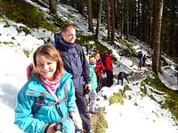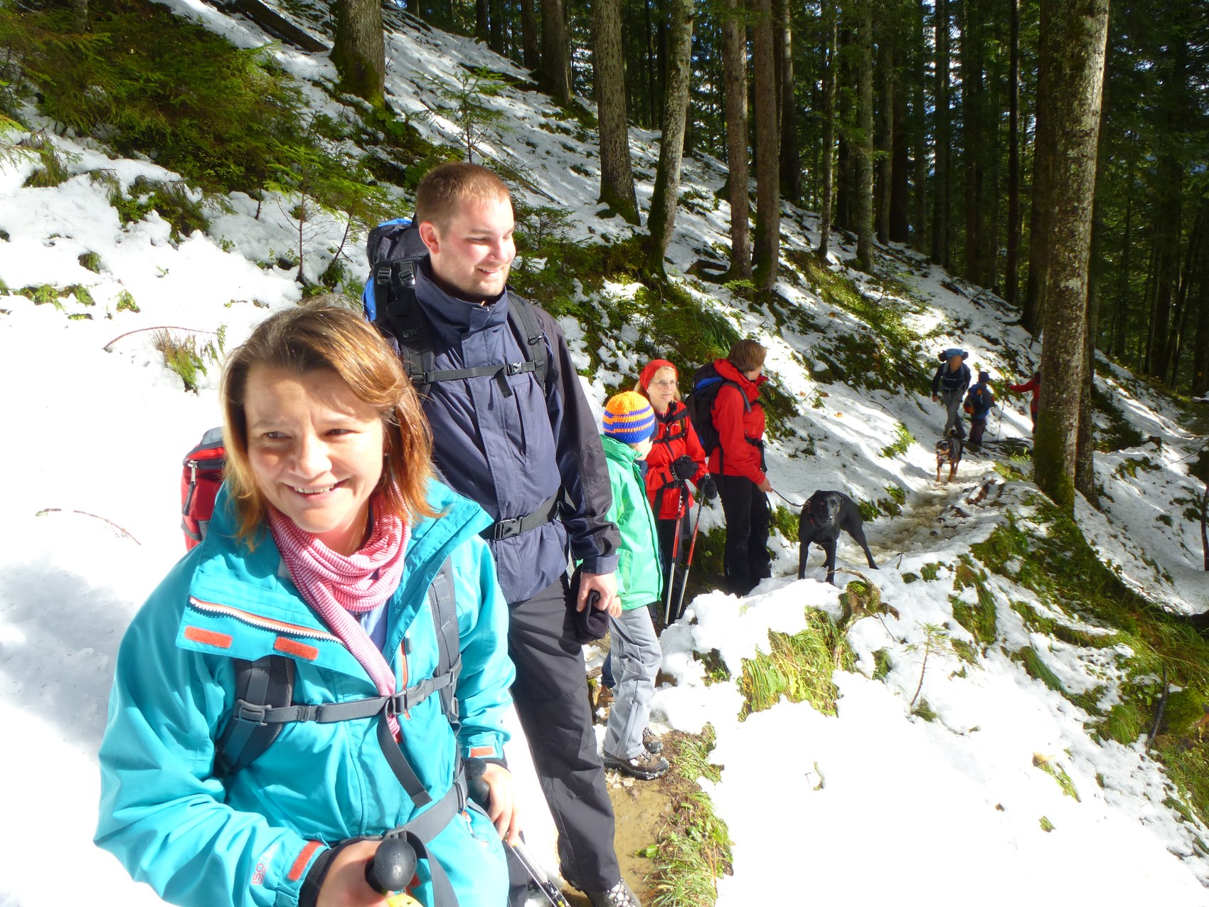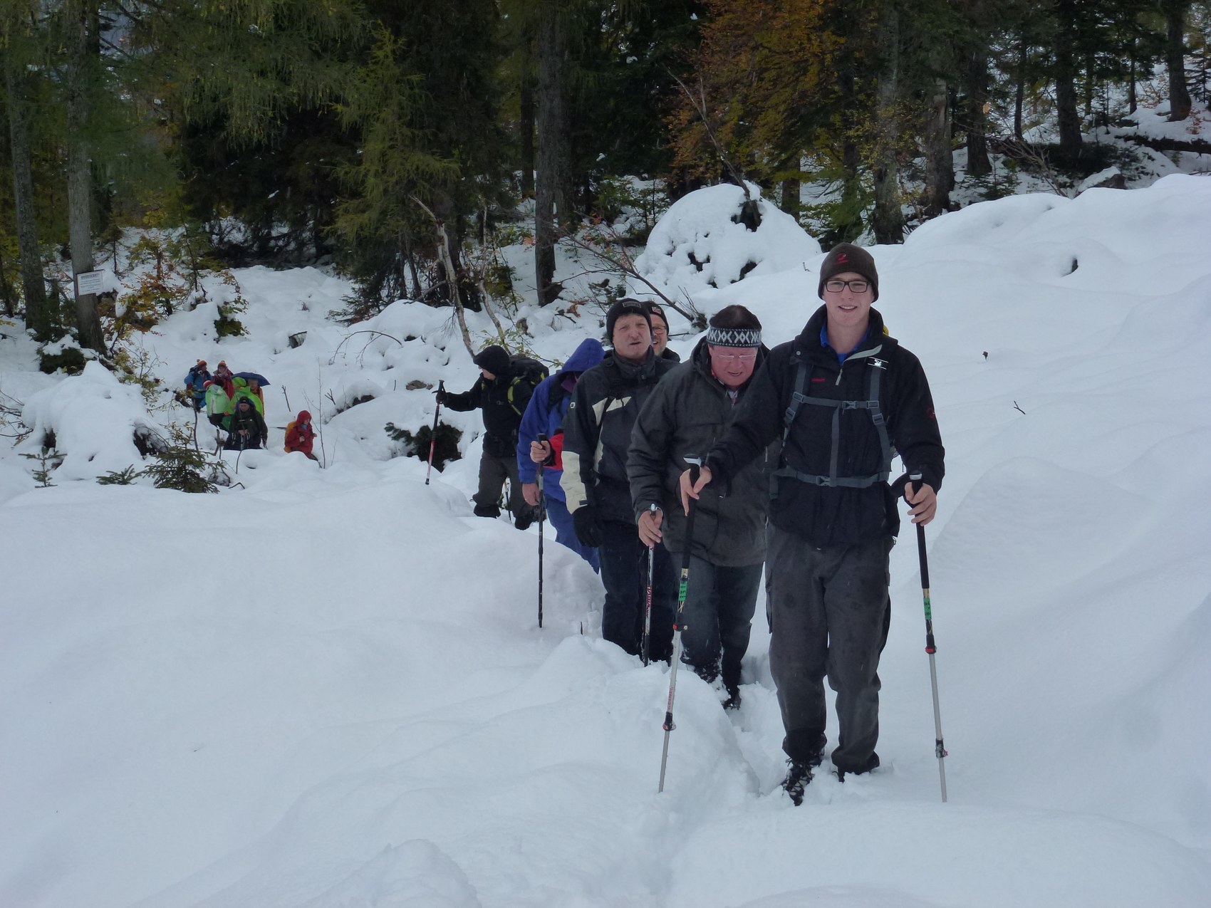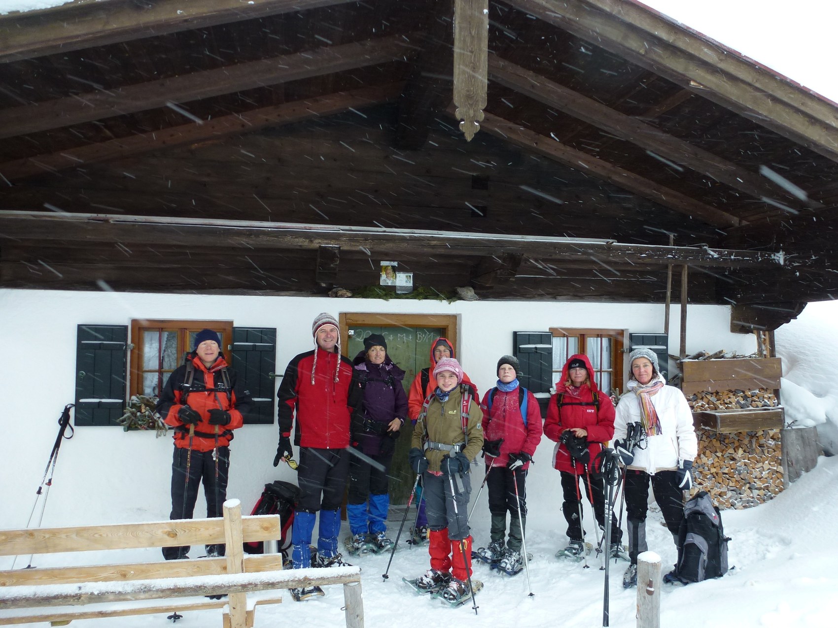 Das Verschieben der Tour von Samstag auf Sonntag brachte Neuschnee bei durchwachsenen Wetter. Wir starteten vom Parkplatz bei Huben mit Sonnenschein, der jedoch im Laufe des Aufstieges immer weniger wurde. Durch frisch verschneite Almwiesen zogen wir unsere Spur über die Schreckalm. Hier wehte der Wind ziemlich bissig und kalt. Alle waren froh als wir wieder den schützenden Bergwald erreichten. In der Priener Hütte konnten sich alle aufwärmen und mit heißer Suppe stärken. Über die Forststraße wanderten wir windgeschützt wieder zu Tale.