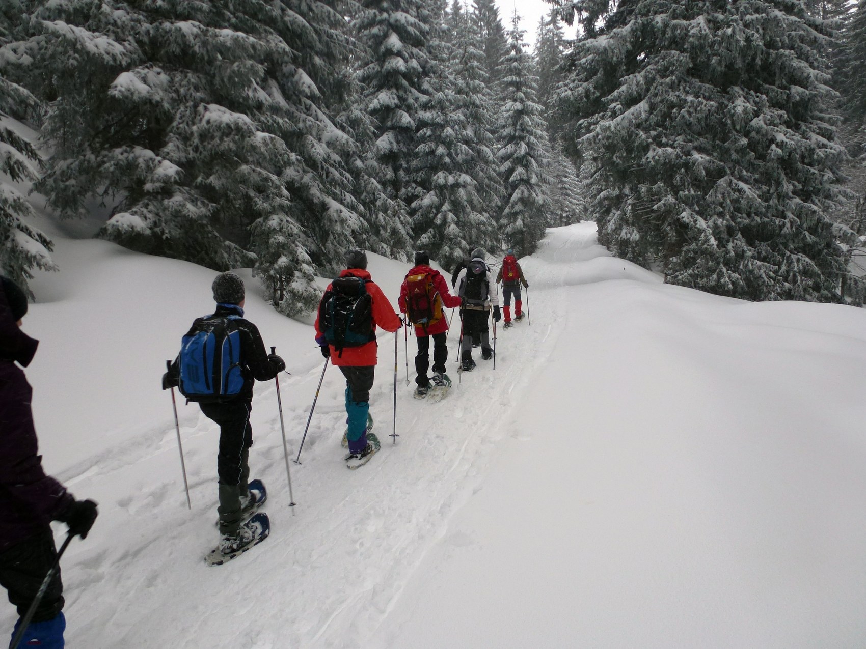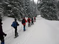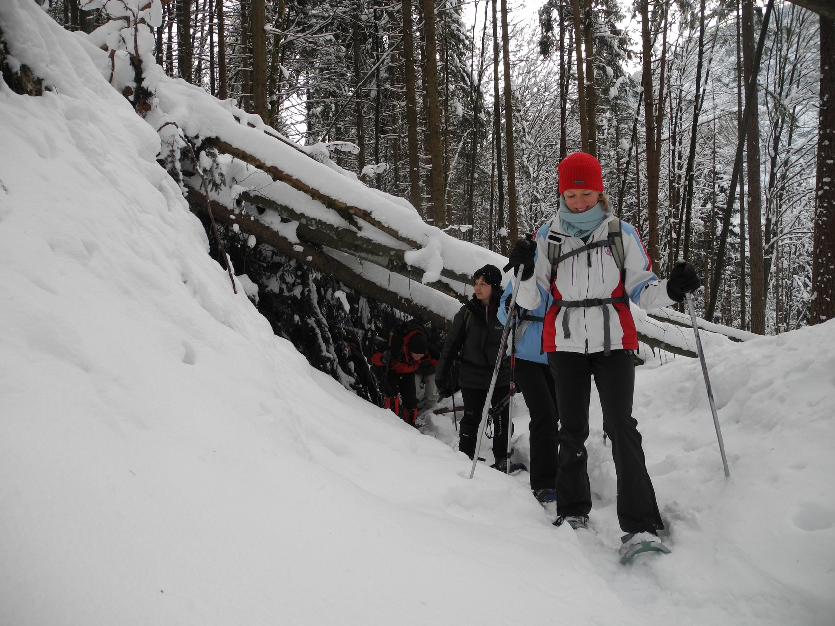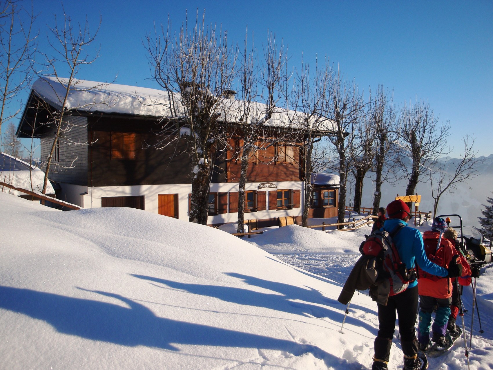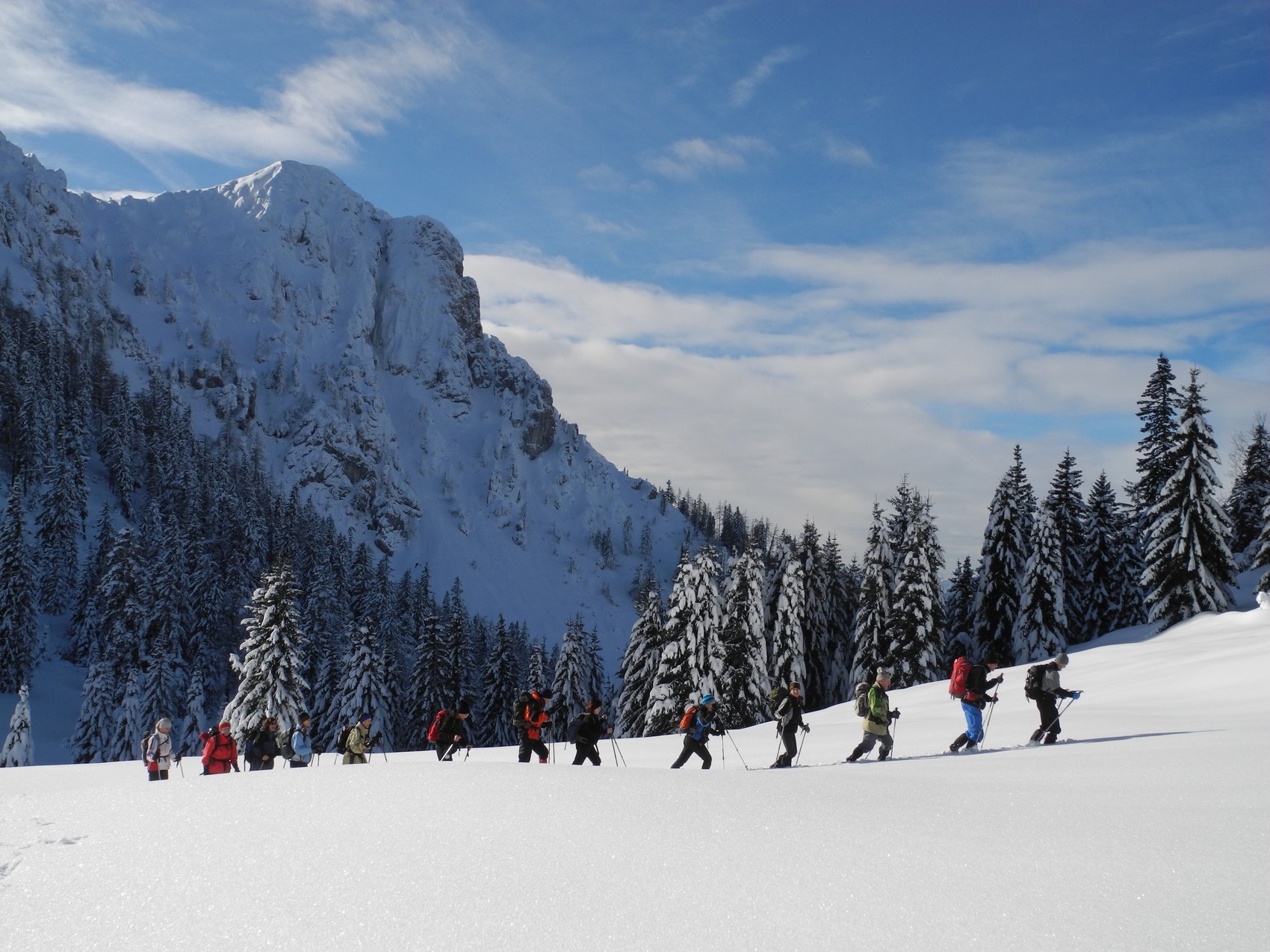 Das Verschieben der Tour von Samstag auf Sonntag brachte Neuschnee bei durchwachsenen Wetter. Wir starteten vom Parkplatz bei Huben mit Sonnenschein, der jedoch im Laufe des Aufstieges immer weniger wurde. Durch frisch verschneite Almwiesen zogen wir unsere Spur über die Schreckalm. Hier wehte der Wind ziemlich bissig und kalt. Alle waren froh als wir wieder den schützenden Bergwald erreichten. In der Priener Hütte konnten sich alle aufwärmen und mit heißer Suppe stärken. Über die Forststraße wanderten wir windgeschützt wieder zu Tale.