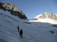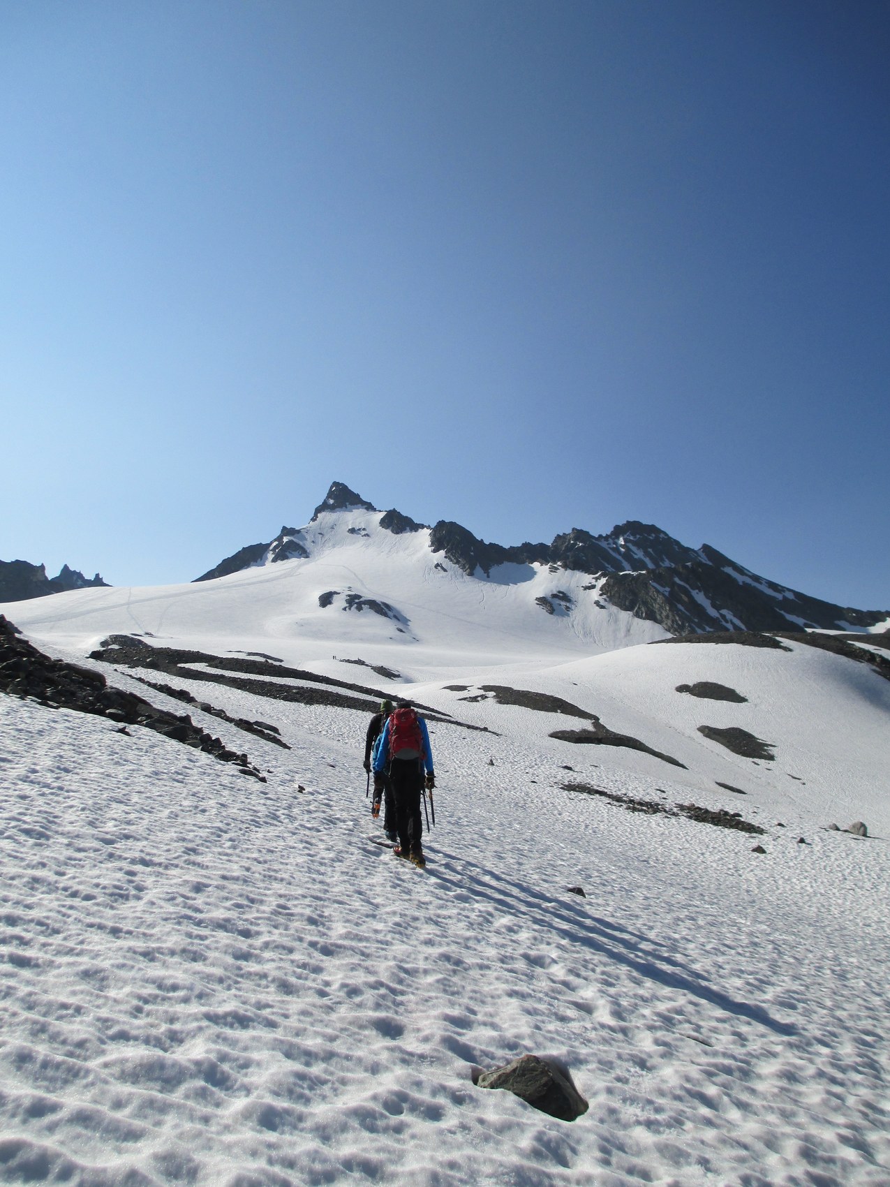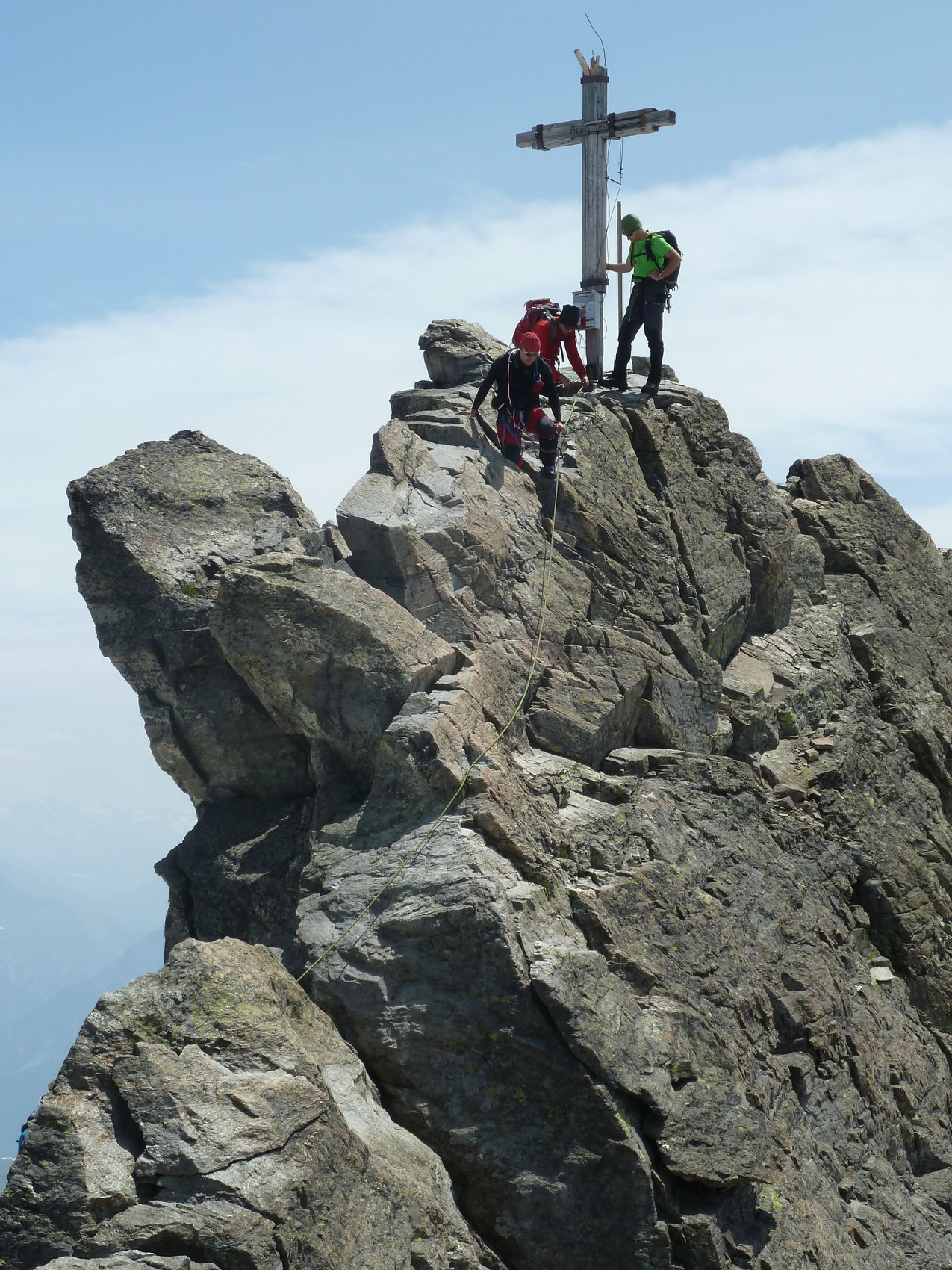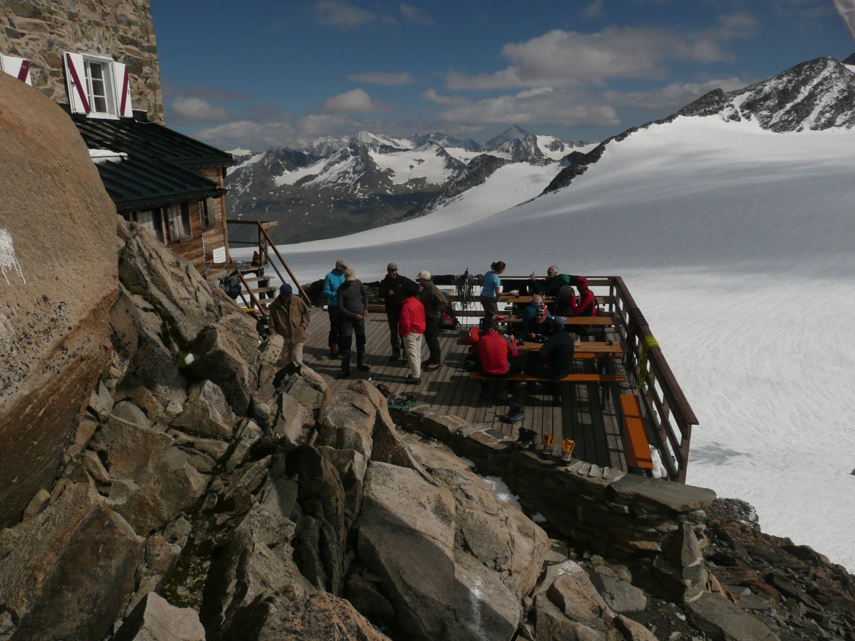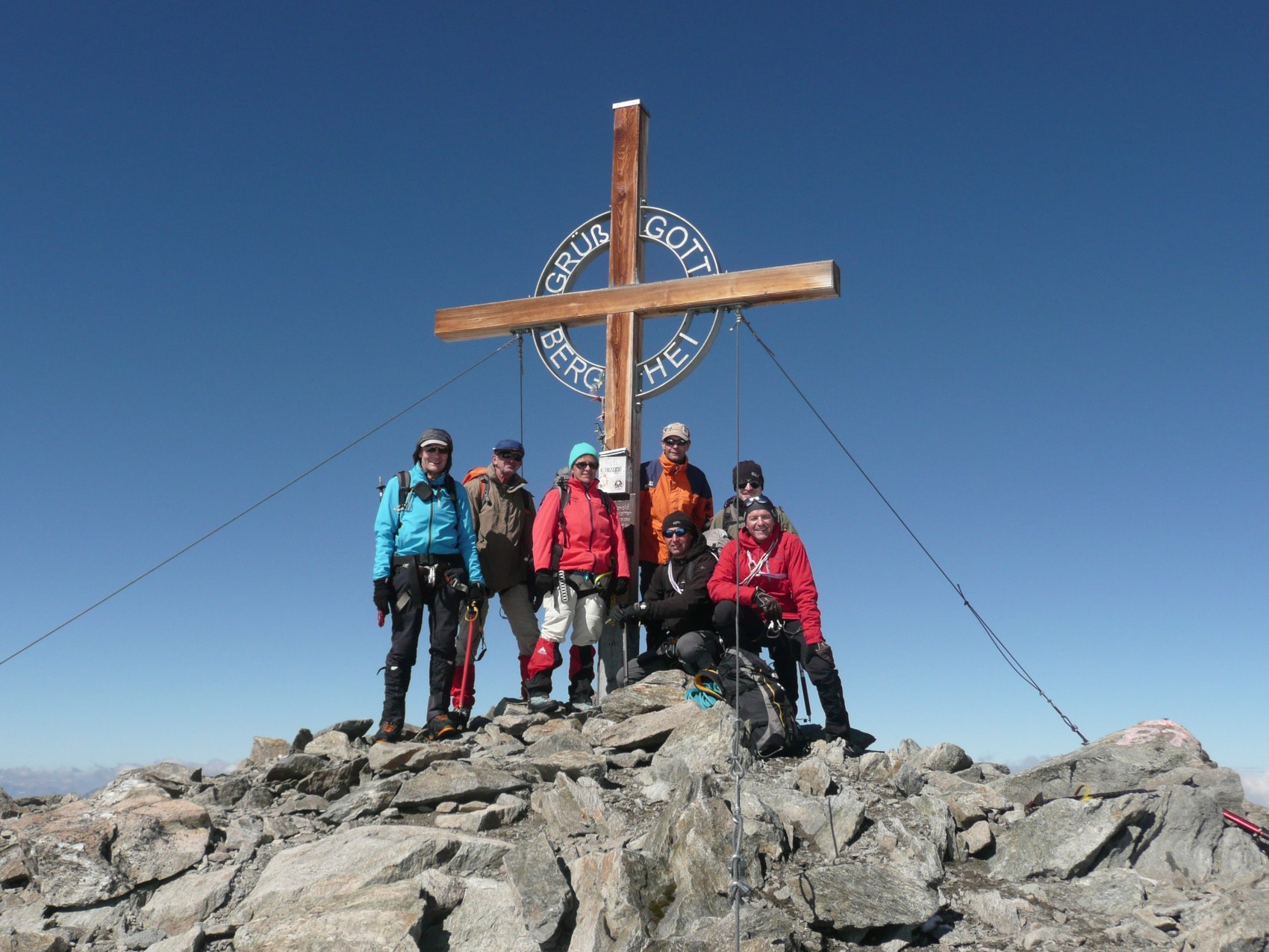 Für das Ende der Hochtourensaison 2013 haben wir uns mit der Weißseespitze inklusive einer Übernachtung in der höchstgelegenen Schutzhütte des Deutschen Alpenvereins, dem Brandenburger Haus (3 277 m), ein würdevolles Ziel ausgesucht. Am Freitagnachmittag fuhren wir ins Kaunertal und übernachteten im Gepatschhaus (1 928 m). An diesem Abend lüftete der Tourenleiter das Geheimnis, warum die 3-Tages-Tour mit mehr Höhenmeter im Aufstieg als im Abstieg ausgeschrieben wurde. Hatte es am Tag zuvor noch ordentlich geregnet, war am Samstag nichts mehr vom Regen zu sehen. Bei Sonnenschein ging es dem Gepatschferner, dem zweitgrößten Gletscher Österreichs, entgegen. Unterhalb der Rauhekopfhütte überquerten wir die Gletscherzunge und stiegen zur kleinen aber feinen Rauhekopfhütte (2 731 m) auf. Nach kurzer Stärkung ging es weiter zum Plateau des Gepatschferners. Die letzten zwei Stunden im Aufstieg waren die anspruchsvollsten dieser Tour, galt es doch im aufgeweichten Firn einen Spaltensturz zu vermeiden. Nach einer Gehzeit von insgesamt 6½ Stunden, kamen wir am Brandenburger Haus an. Das zusätzliche Tagesziel der Fluchtkogel (3 500 m) fand bei allen Teilnehmern kein Interesse mehr. Die „Schneestapferei“ im kniehohen Firn bremste unsere Euphorie stark ein, aber den eisfreien Hausberg die Dahmannspitze (3 401 m) statteten wir natürlich noch einen Besuch ab. Am Sonntag querten wir fast komplett den Gepatschferner und bestiegen unser großes Gipfelziel, die Weißseespitze. Nach 3-stündiger Gehzeit standen wir voller Stolz auf dem Gipfel der Weißseespitze. Der kalte Wind lud uns nur zum kurzzeitigen Verweilen am Gipfel ein. Unseren Abstieg absolvierten wir über den Westgrat bei leichter Blockkletterei. Der untere Teil unseres Abstiegs verlief über das Steileis der Nordwand. Hier errichteten wir im Eis einige Seilgeländer und Abseilpisten. Die letzten Meter zum Endpunkt der Kaunertal-Hochgebirgsstraße (2 750 m), welche über den Kaunertal-Gletscher verliefen, waren nicht die schönsten, da das Skigebiet hier seine tiefen Spuren mit Liftanlagen, etc. hinterließ. Doch bei dieser Wegstrecke wuchs bei allen Teilnehmern die Freunde über die erbrachte Leistung. Ein großer Dank gilt Erwin Ruhland, welcher sich als zweiter Tourenleiter zur Verfügung stellte.