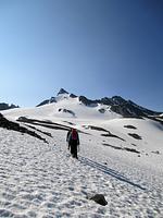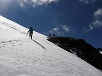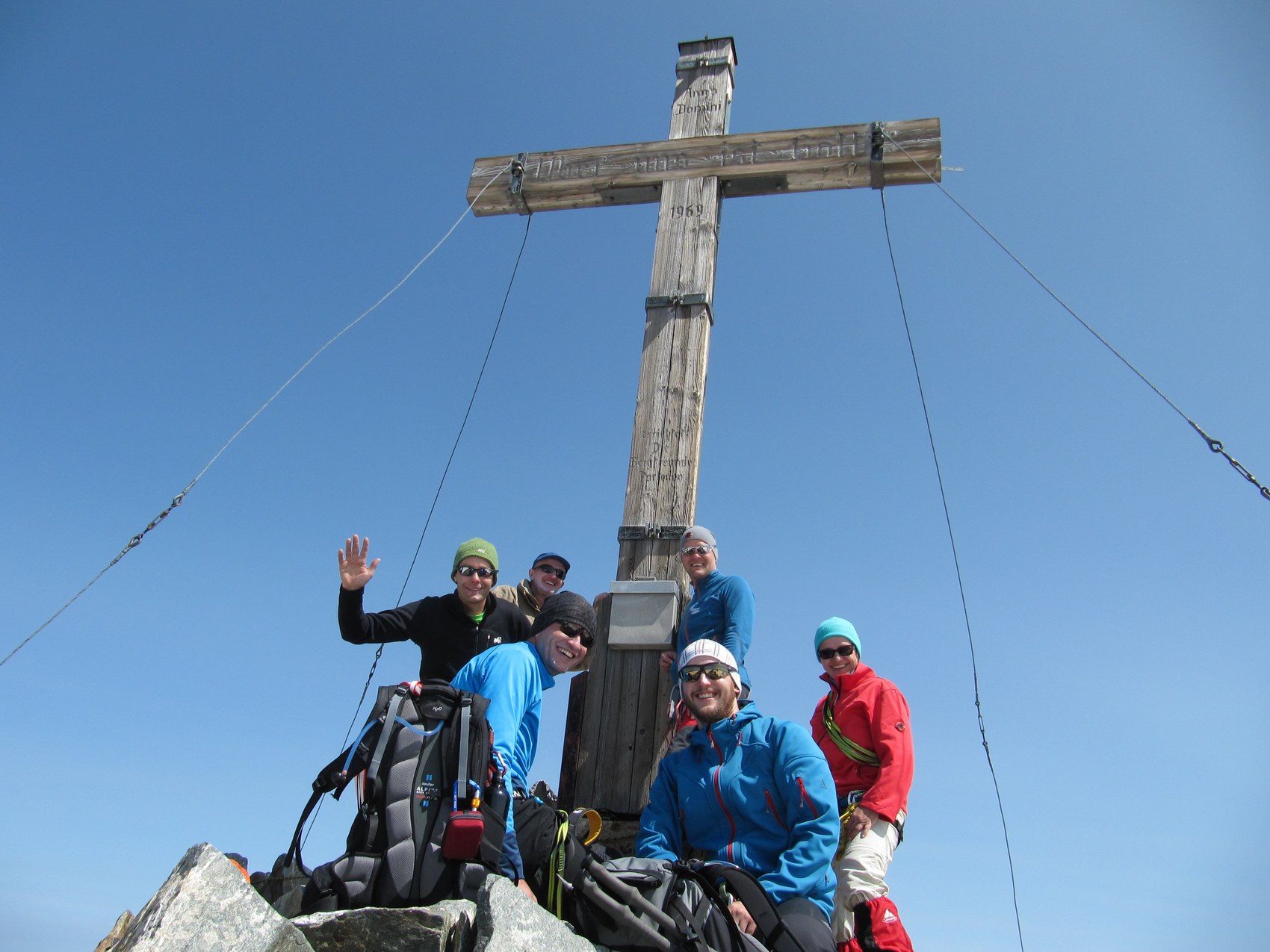 Am „Gipfeltag“ herrschten fast ideale Bedingungen, wolkenfreier Himmel und warme Temperaturen, die allerdings die Schneedecke übernacht nicht gefrieren lies. Nach einer Stunde erreichten wir den Floitenkees und stapften knöcheltief im Schnee dem Triebbachsattel (3 028 m) entgegen. Ab hier gesellten wir uns den Gipfelkarawanen zu, welche von der Scharzensteinhütte aus aufwärts kamen. Nach schweißtreibenden vier Stunden, in denen wir 1 150 Höhenmeter absolvierten, standen wir bei „T-Shirt-Wetter“ auf dem Gipfel des Schwarzensteins. Leider ließen die südseitig einziehenden Wolkenfenster nur ein paar Blicke ins Tal und auf die umliegende Bergwelt zu. Doch gleich hinterm Triebbachsattel waren wir bei unserem Abstieg wieder wolkenfrei. An der Greizer Hütte angekommen, durfte der Tourenleiter seine erste Gipfelbesteigung ohne einen Spaltensturz feiern.