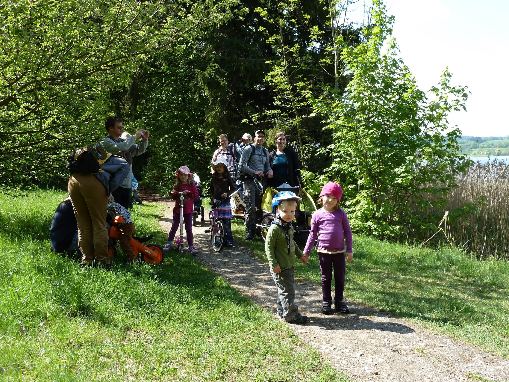 Schönes Wetter hatten wir uns ausgesucht, für unsere Auftaktwanderung am Ostufer des Tachinger Sees. In Tettenhausen, dort wo die Verbindung vom Tachinger zum Waginger See besteht, begann unsere Wanderung. Direkt am Seeufer, im Schatten des dichten Buchenwaldes, ging es gemütlich mit Laufrad, Wagl, etc. dahin. Das Seeufer lud stetig die kleinen Wanderer zum „Steine schmeißen“ in den See ein. Natürlich blieb der ein oder andere bei dieser Aktion nicht ganz trocken! Nach dem Armeinsatz waren die Beine gefragt. Ein kurzes knackiges Steilstück von 100 Höhenmetern galt es zu überwinden. Oben angekommen, ließen sich Klein und Groß die mitgebrachte Brotzeit schmecken. Nach der „Gummibärausgabe“ ging es leicht bergab über gut ausgebaute Feldwege unserem End- und Ausgangspunkt entgegen. Die meisten Kinder legten fast selbständig eine Entfernung von ca. 6 km zurück, was schon eine beachtliche Leistung für die kleinen Haxen ist! Als Belohnung gab es eine ordentliche Menge an Eis im Standcafé in Tettenhausen und ein Fußbad im Waginger See. Nur mit „Steine schmeißen“ ins Wasser konnten wir die Kinder vom tollen Spielplatz in die Autos locken.