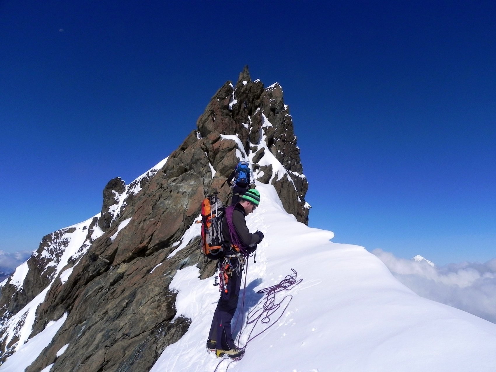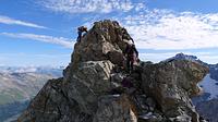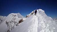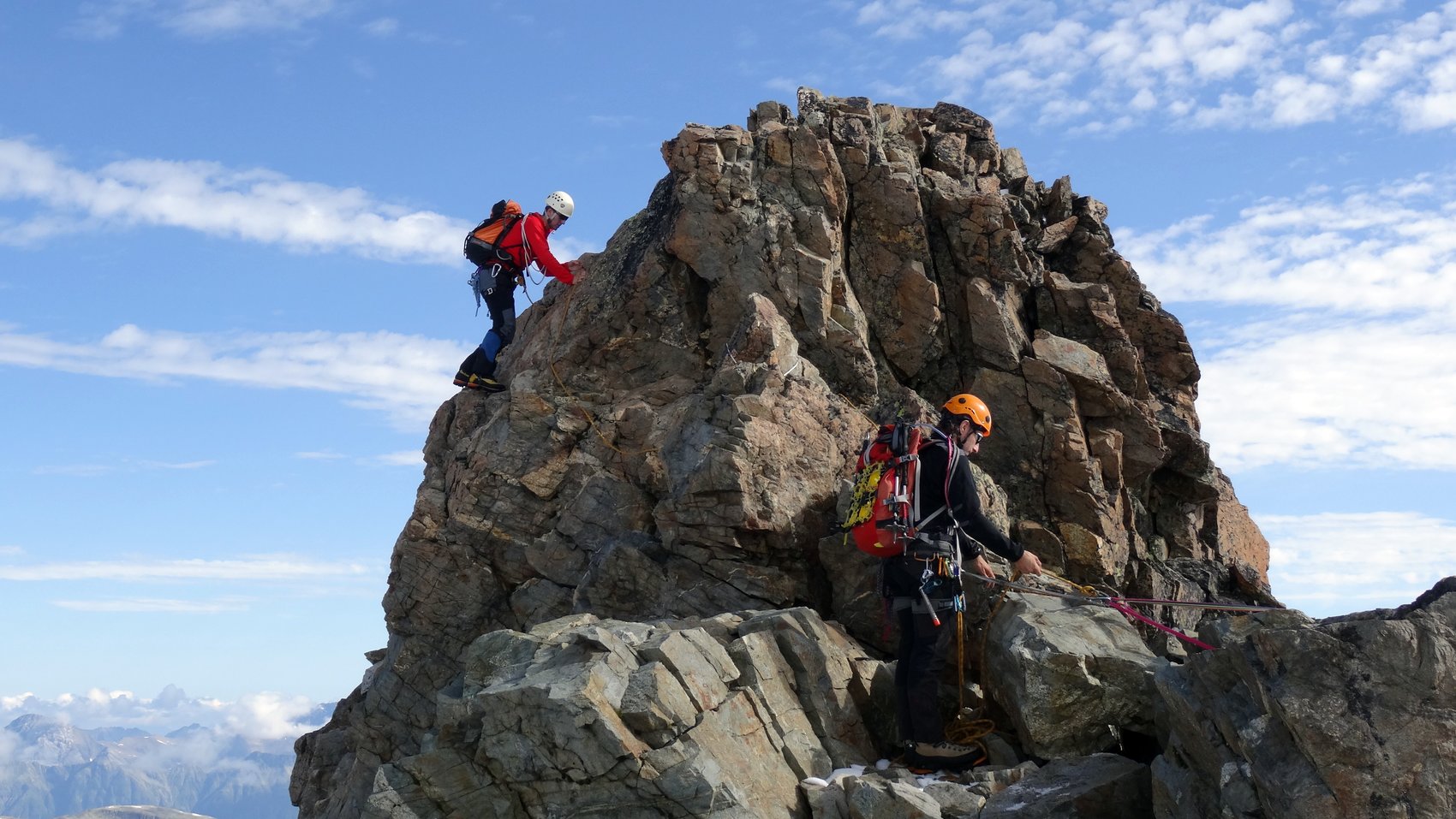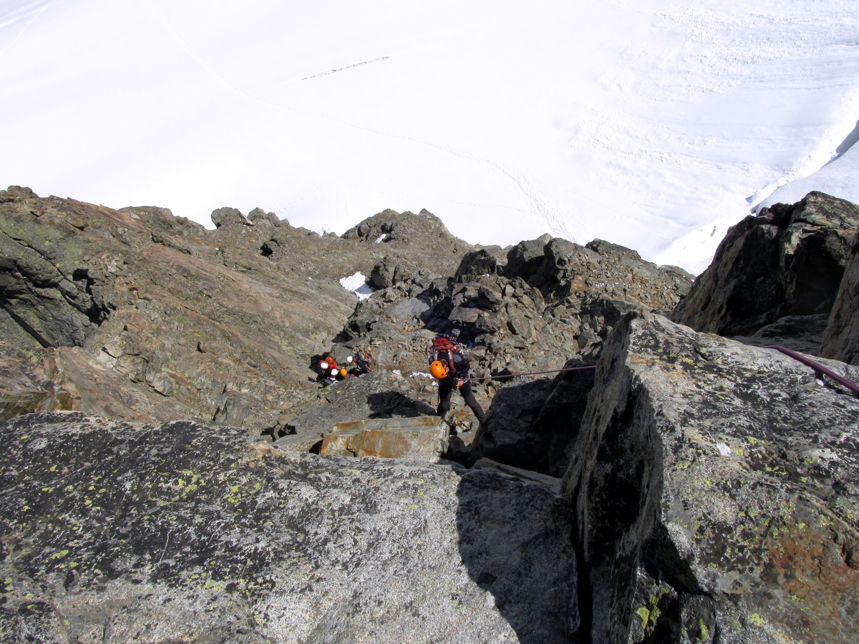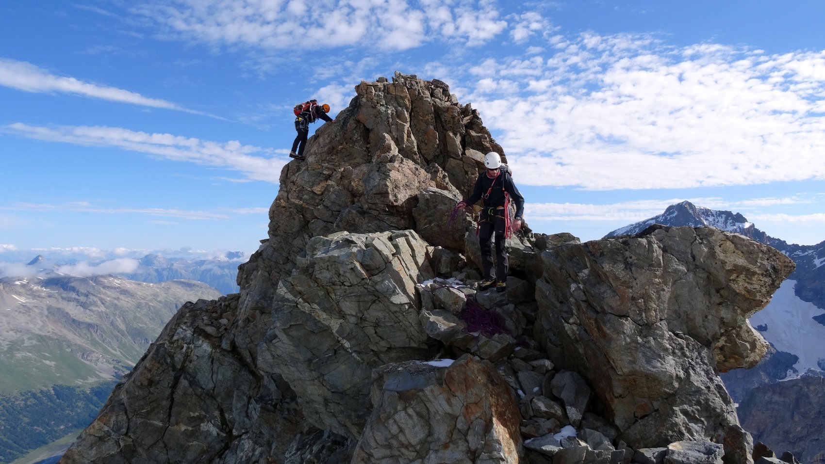 Schneefreier, griffiger Fels erwartete uns bei der Kletterei am ausgesetzten Felsgrat. Weiter ging es über teils steile Firnhänge auf die Schneekuppe, den Vorgipfel des Piz Roseg.