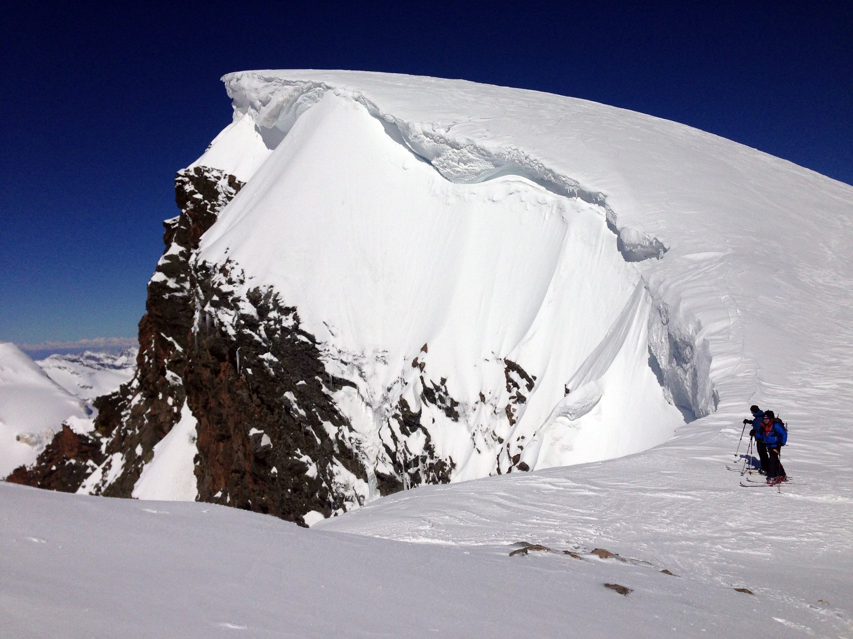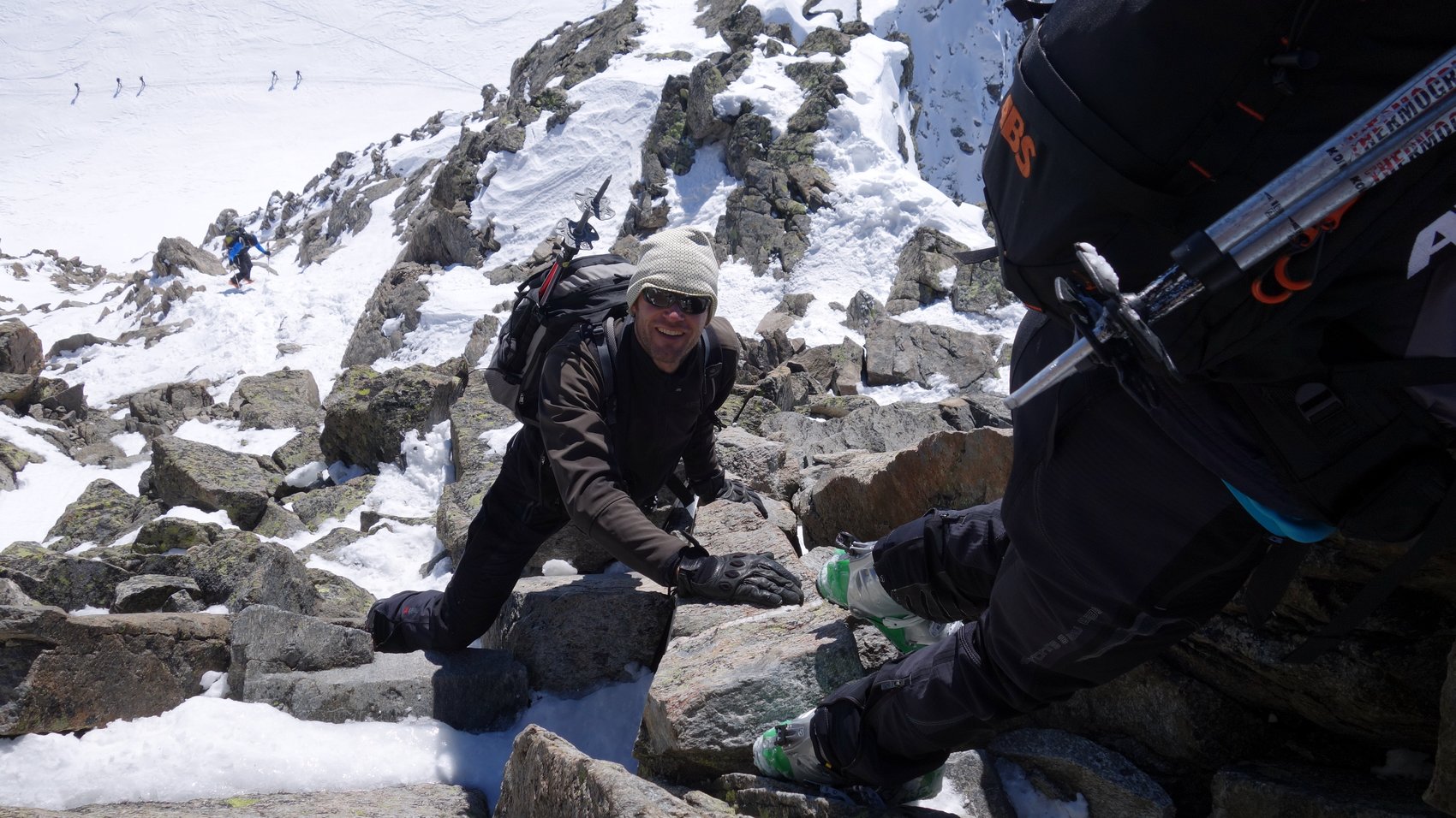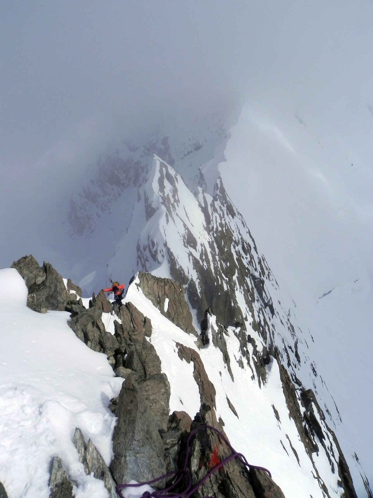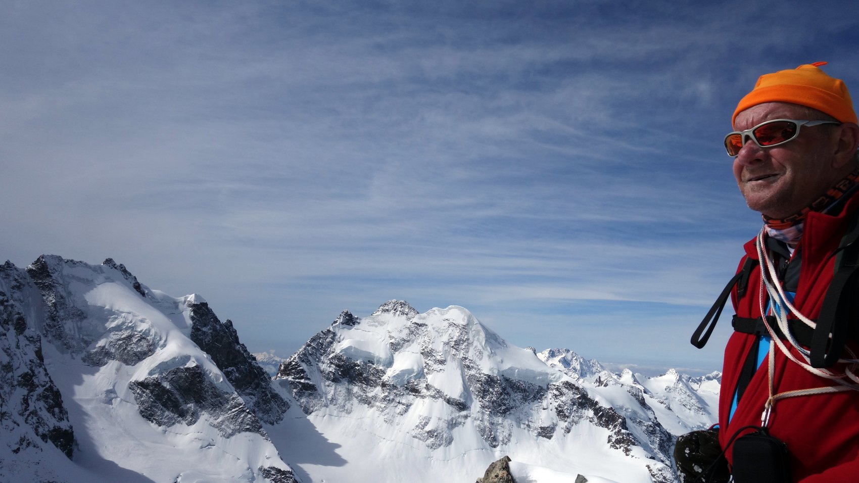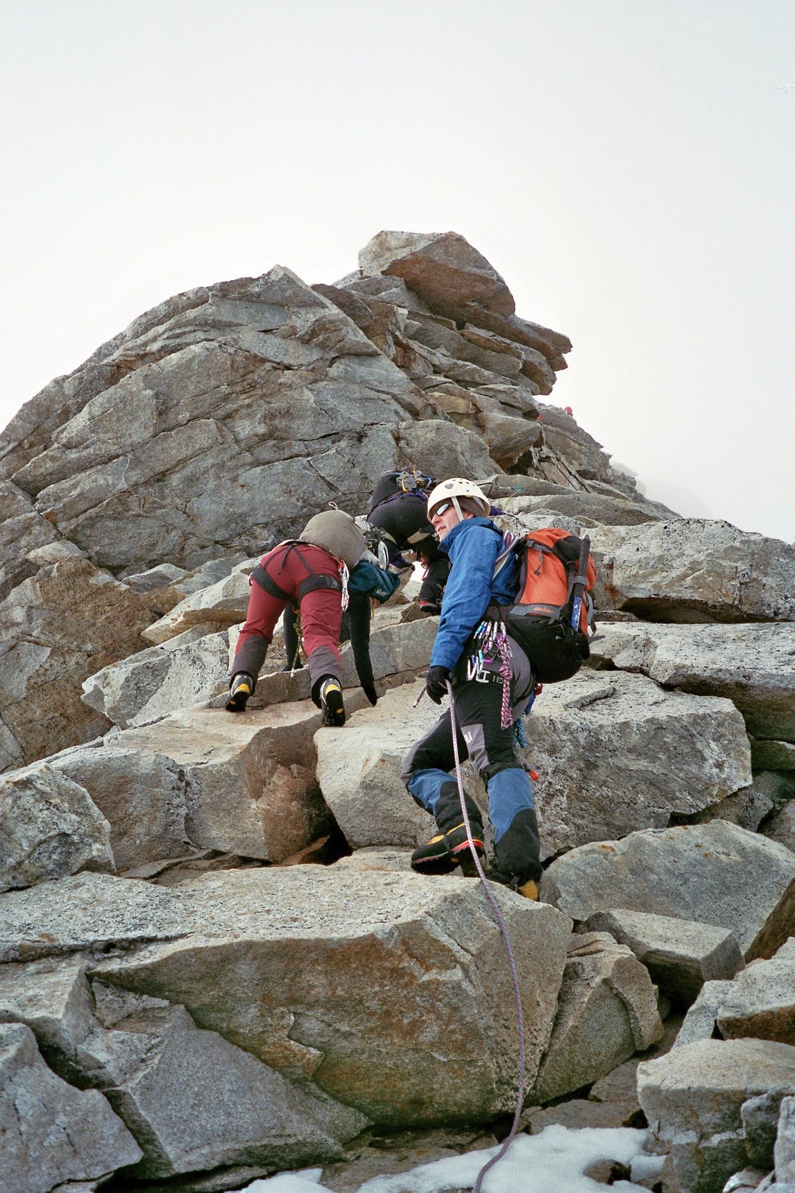 Schneefreier, griffiger Fels erwartete uns bei der Kletterei am ausgesetzten Felsgrat. Weiter ging es über teils steile Firnhänge auf die Schneekuppe, den Vorgipfel des Piz Roseg.