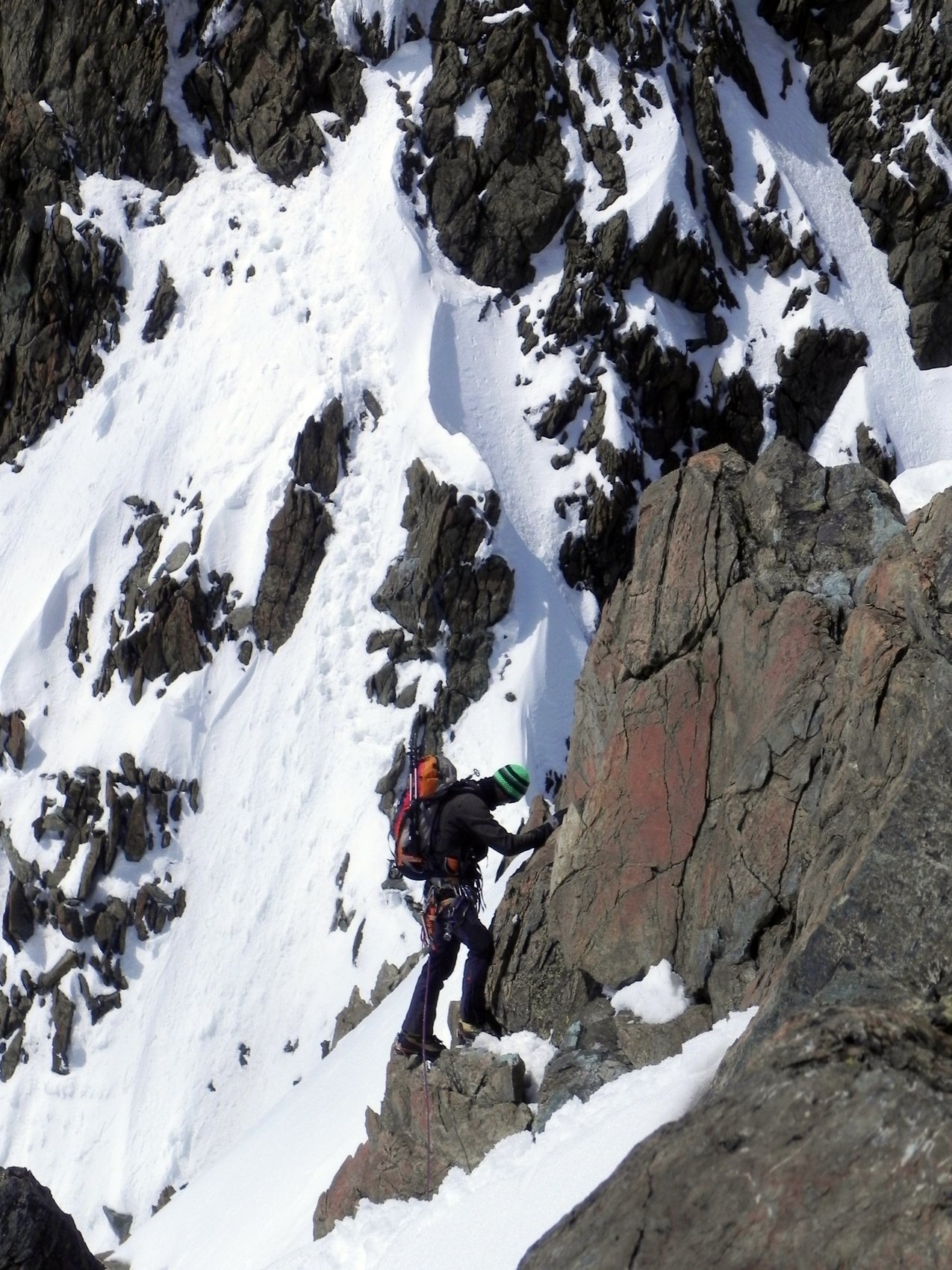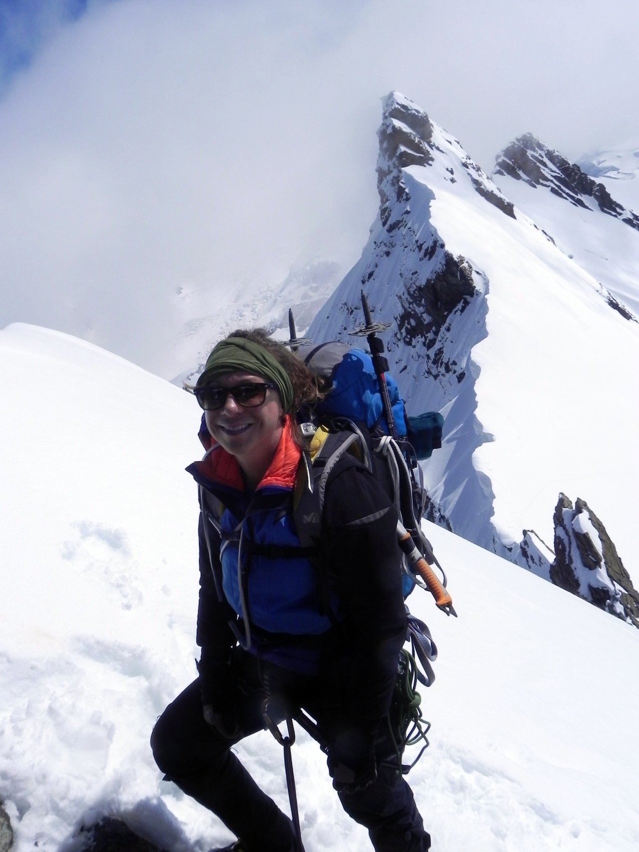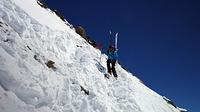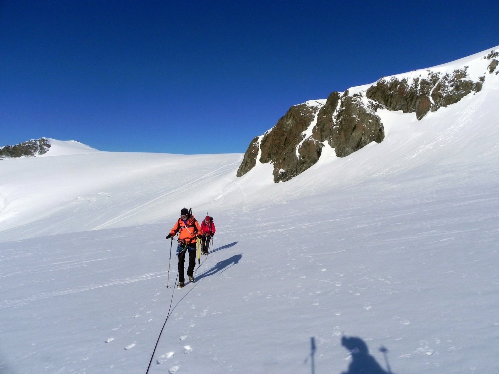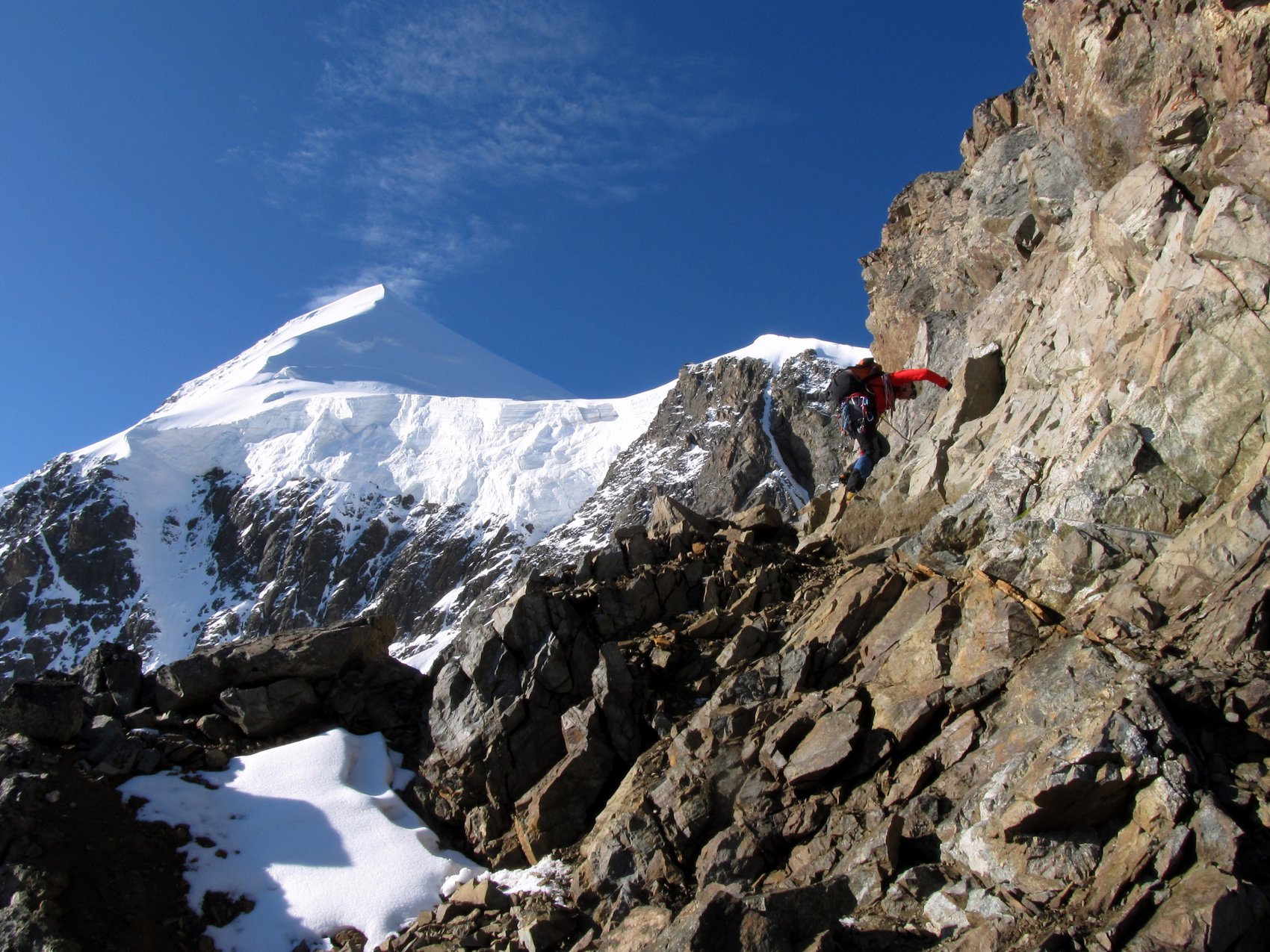 Schneefreier, griffiger Fels erwartete uns bei der Kletterei am ausgesetzten Felsgrat. Weiter ging es über teils steile Firnhänge auf die Schneekuppe, den Vorgipfel des Piz Roseg.