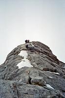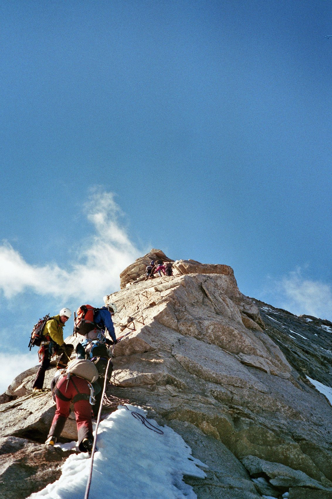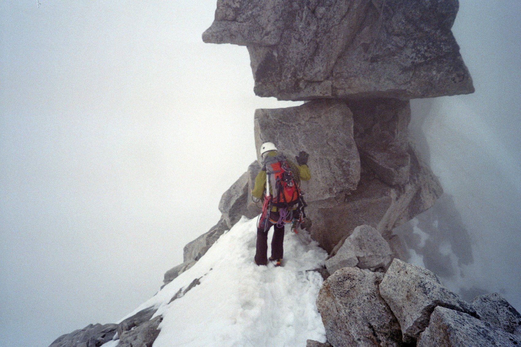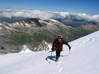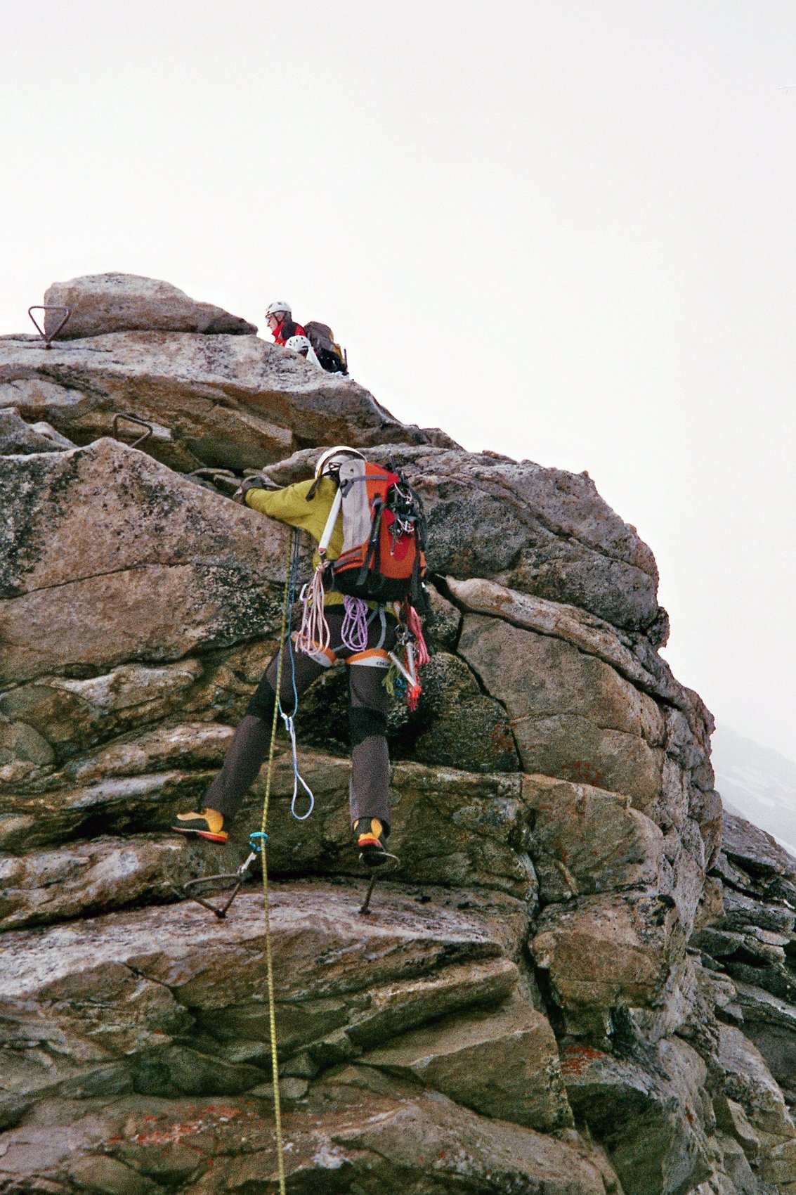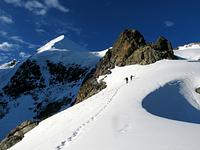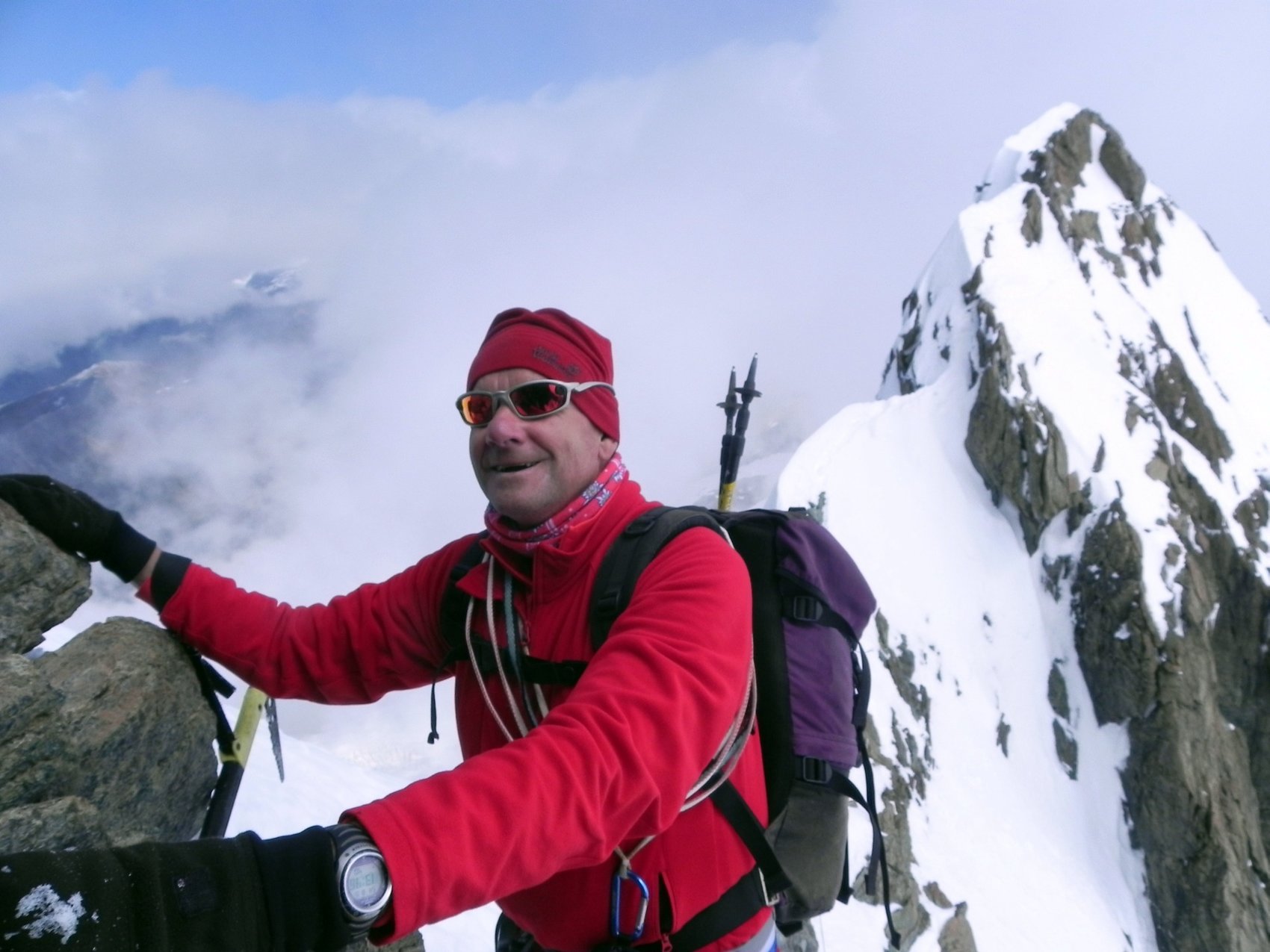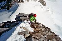 Schneefreier, griffiger Fels erwartete uns bei der Kletterei am ausgesetzten Felsgrat. Weiter ging es über teils steile Firnhänge auf die Schneekuppe, den Vorgipfel des Piz Roseg.