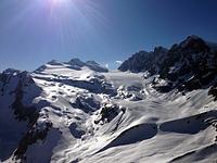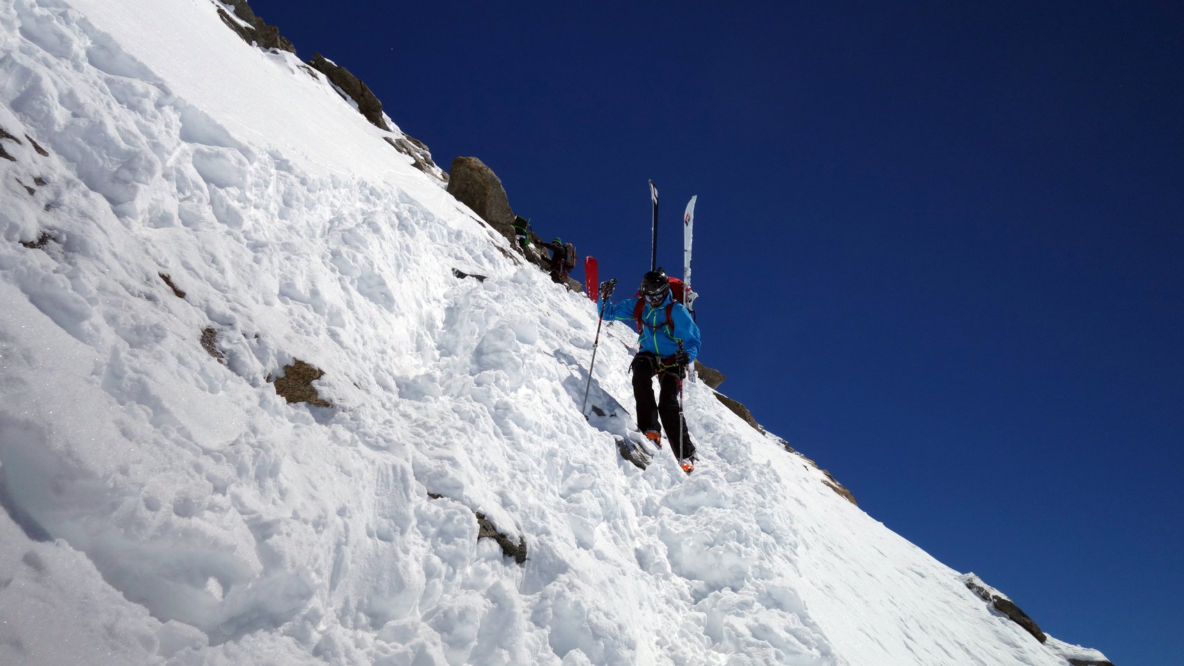 Der erste Tourentag brachte uns die berühmte Piz-Palü-Überschreitung und den Übergang auf die unbekannte italienische Seite der Bernina. Im gemütlichen, typisch italienischen Refugio Marinelli feierten wir dann den ersten Dreitausender unseres Jungspunds. Was wünscht man sich mehr als eine Piz-Palü-?Überschreitung als Auftakt für einen Skibergsteiger. Weiter führte unser Weg auf der Südseite des Piz Roseg vorbei im steilen Anstieg auf den Piz Sella. Traumhaft pulvrige Hänge erwarteten uns bei der Abfahrt zur Coaz-Hütte, wo wir uns zu Mittag ein Schweizer Rösti schmecken ließen. Für den Nachmittag stand der schweißtreibende Übergang zur Tschierva-Hütte auf dem Programm. Nach einer gemütlichen Nacht im Winterraum machten wir uns am frühen Morgen auf zum Piz Morteratsch. Über die Fuorcla da Boval ging es noch auf ein letztes Bier runter zur Boval-Hütte und weiter zum Endpunkt der Tour, der Station Morteratsch der Berninabahn.