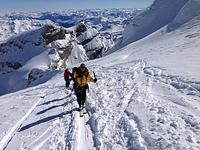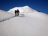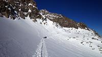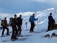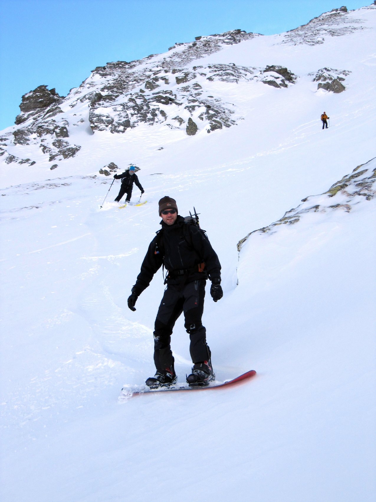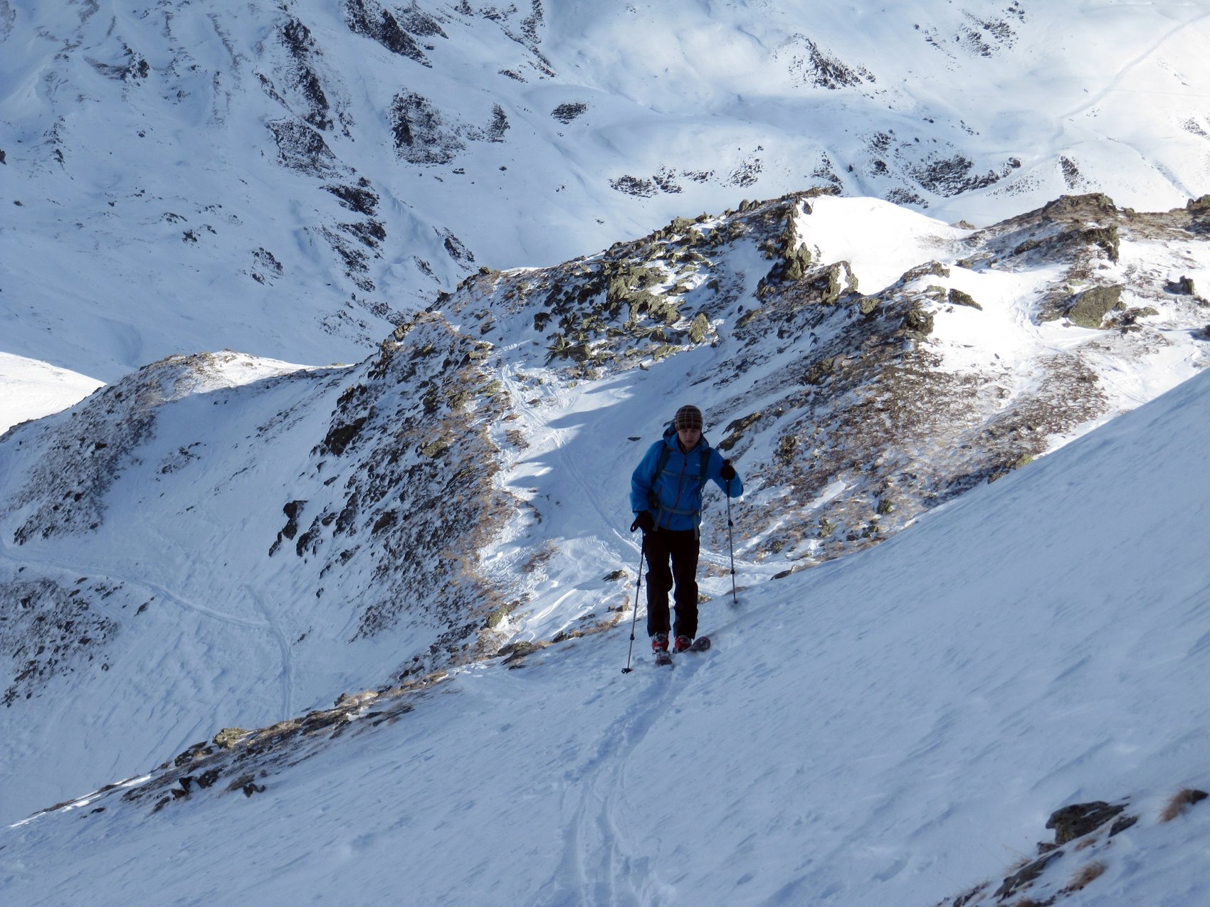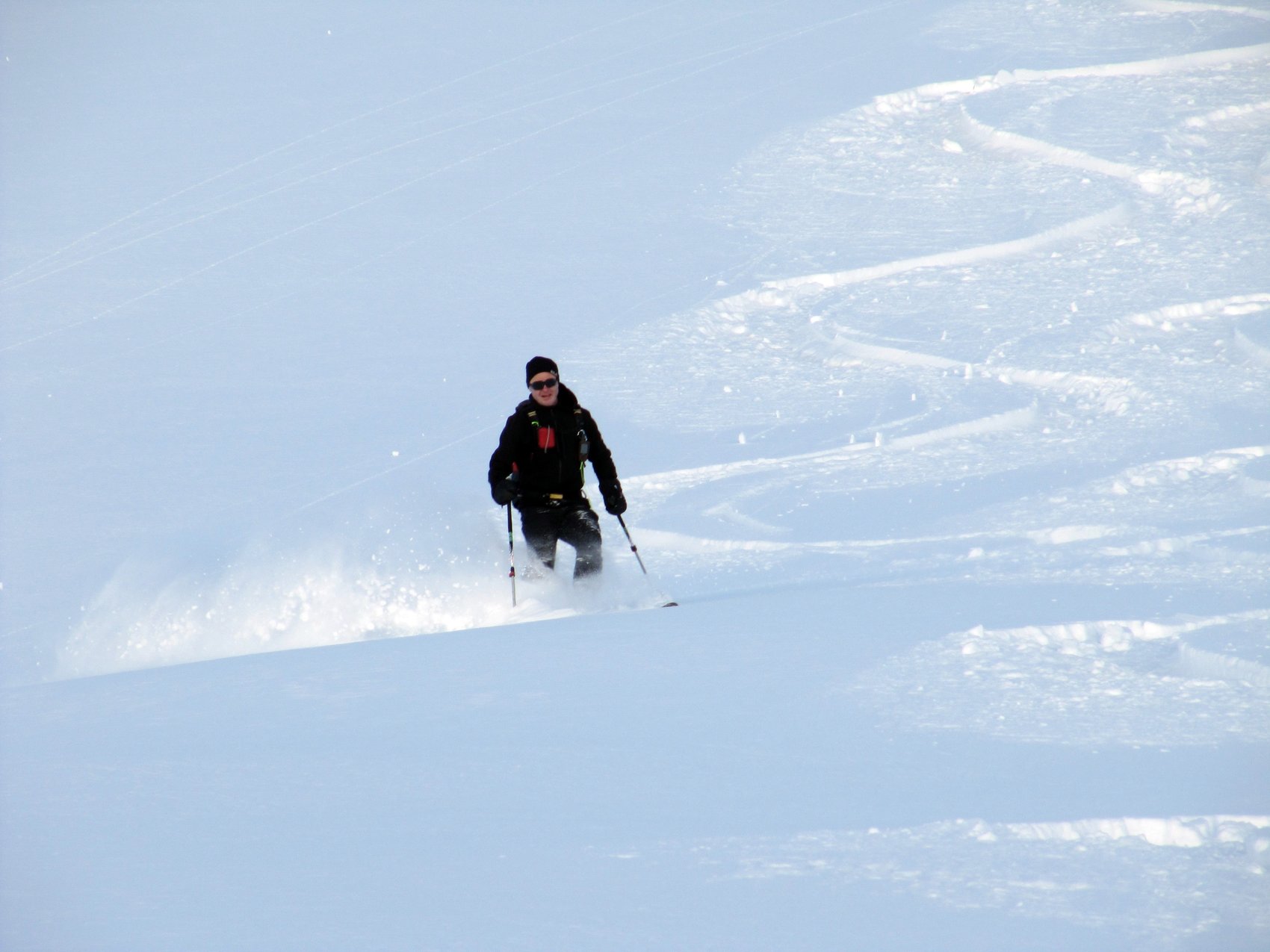 Der dritte Tag sollte uns wieder eine tolle Tour bieten. Durch ein einsames Tal gingen wir Richtung Piz Schumbraida. Wegen der vorangeschrittenen Zeit und der starken Schneeverfrachtungen am Gipfelkamm entschieden wir uns aber auf den Passo dei Pastori (2 771 m) auszuweichen. Über das Val Döss Radond suchten wir uns dann die schönsten Tiefschneehänge für die Abfahrt. Die etwas kürzere Abschlußtour auf den Monte Serraglio (2 664 m) vom Ofenpaß aus war nicht minder beeindruckend. Wieder allein auf dem Gipfel, genossen wir das beeindruckende Panorama über den Schweizer Nationalpark, bevor wir über das Engadin unsere Heimreise mit dem Alpenvereinsbus und unserem Chauffeur Reinhard antraten.
