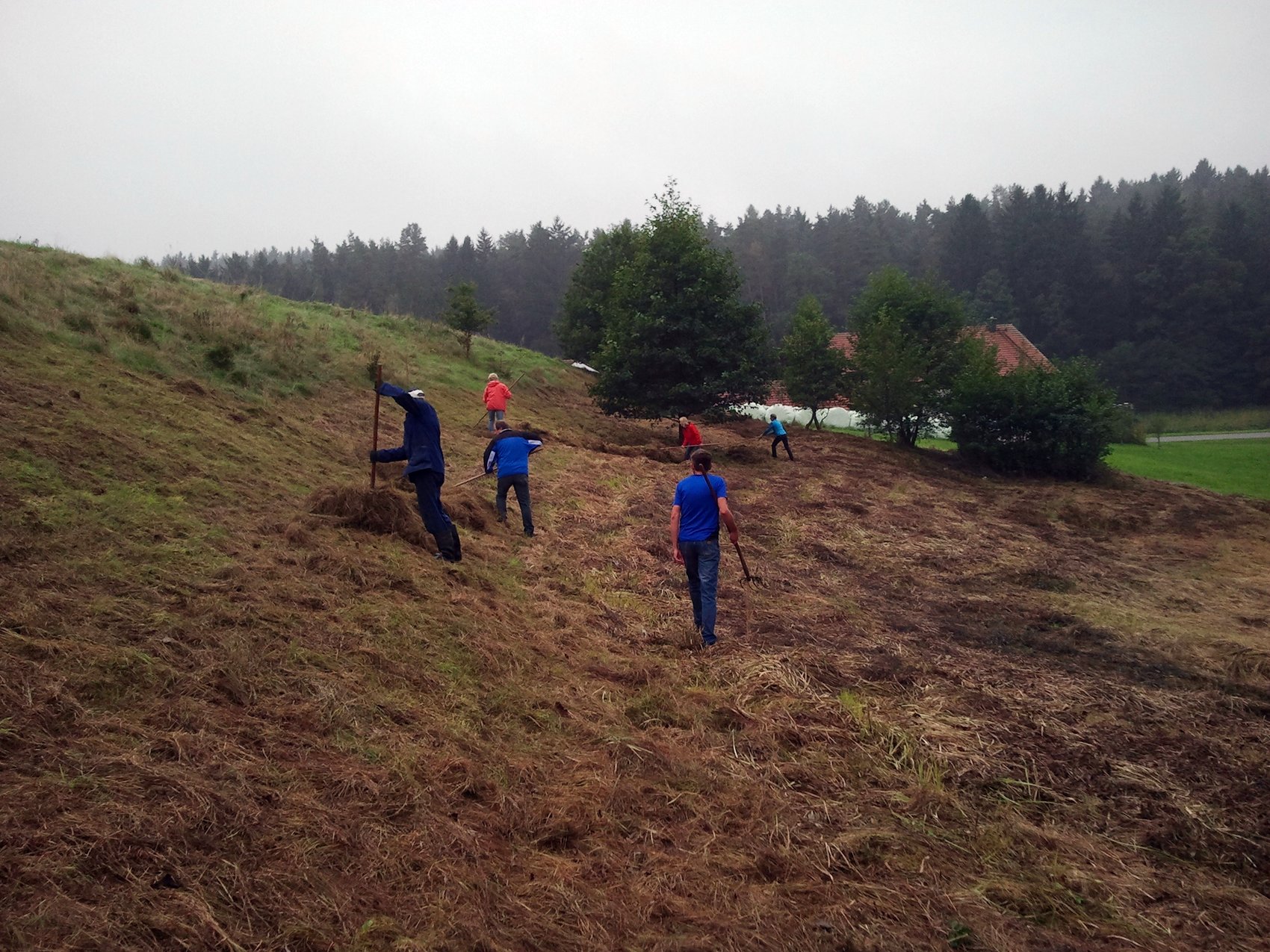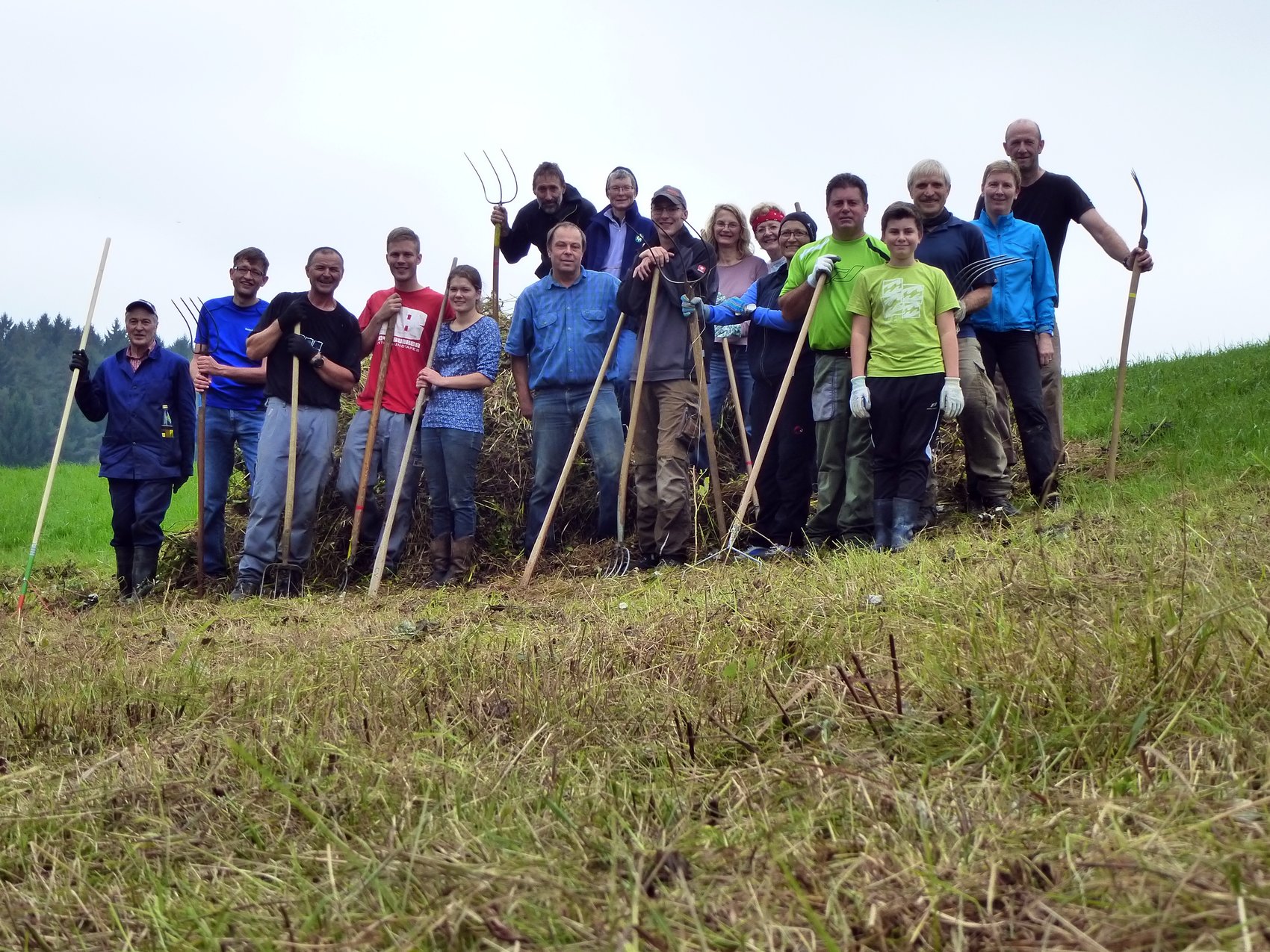 Die jährliche Mahd und der Abtransport des Schnittgutes ist erforderlich, damit ein Zuwachsen durch Sträucher und Bäume verhindert wird. Diese Arbeit ist nur von Hand möglich, da die Wiese sumpfig und von vielen Gräben durchzogen ist. Über mehrere Tage hinweg wurde mit Balkenmäher und Motorsense vorab gemäht. Am Samstag, den 27. September, wurde von zahlreichen freiwilligen Helfern das Schnittgut mit Rechen und Gabeln an den Rand der Feuchtfläche getragen und zum Abtransport gelagert.