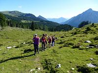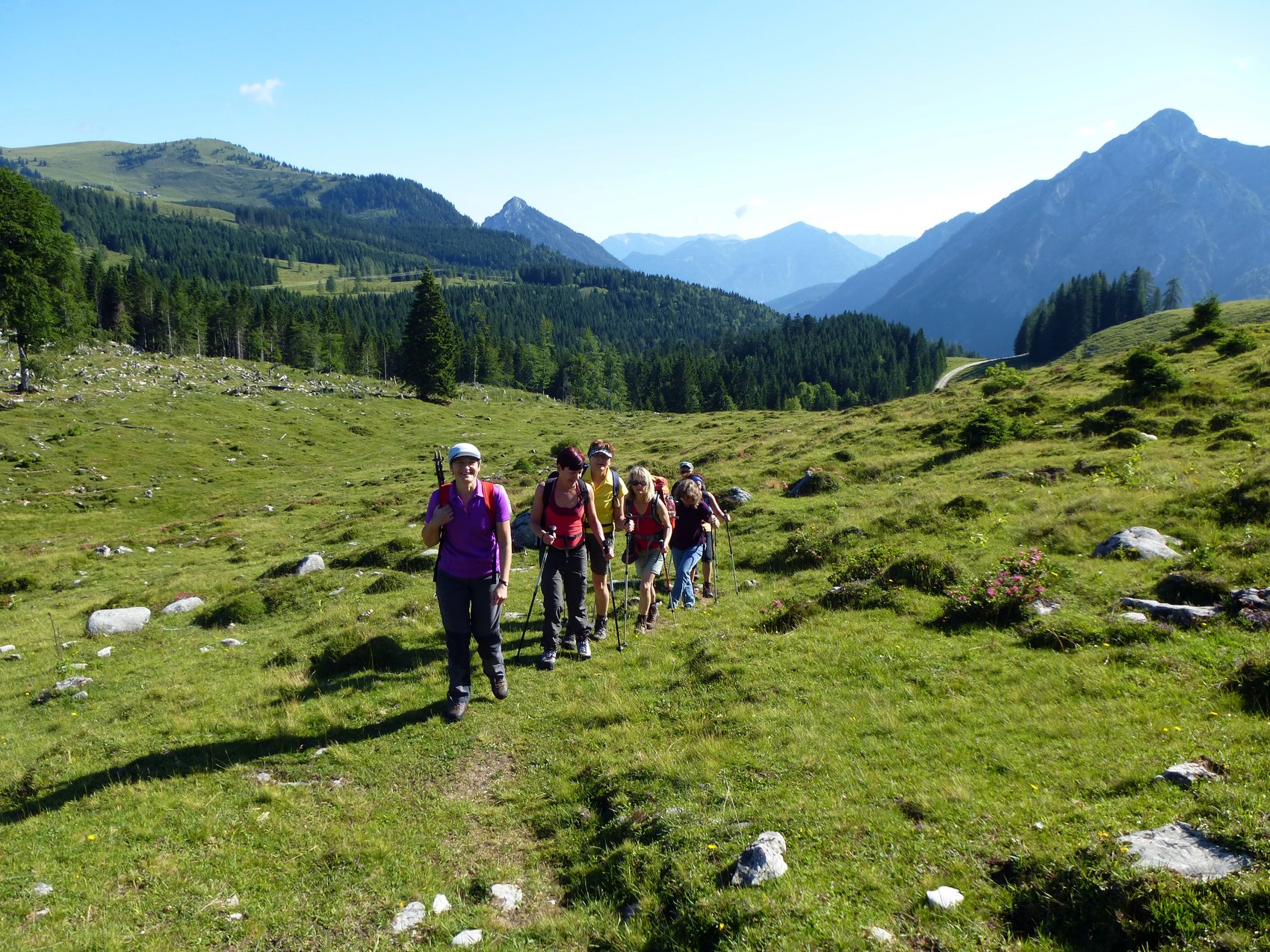 Vom Parkplatz auf der Steinplatte machten wir uns über das Almgebiet der Durchkaseralmen zum Straubinger Haus auf der Eggenalm auf. Unser Pflanzenexperte Willi Harreiter erklärte uns immer wieder die verschiedensten Kräuter und Almblumen. Der Enzian blühte auf dem ganzen Weg so zahlreich, dass die Wiesen blau leuchteten. Als wir an einem Tümpel vorbeikamen, gab es auch noch Lurche zu sehen. Auf dem Rückweg gab es noch eine Rast in der urigen Brennhütte.