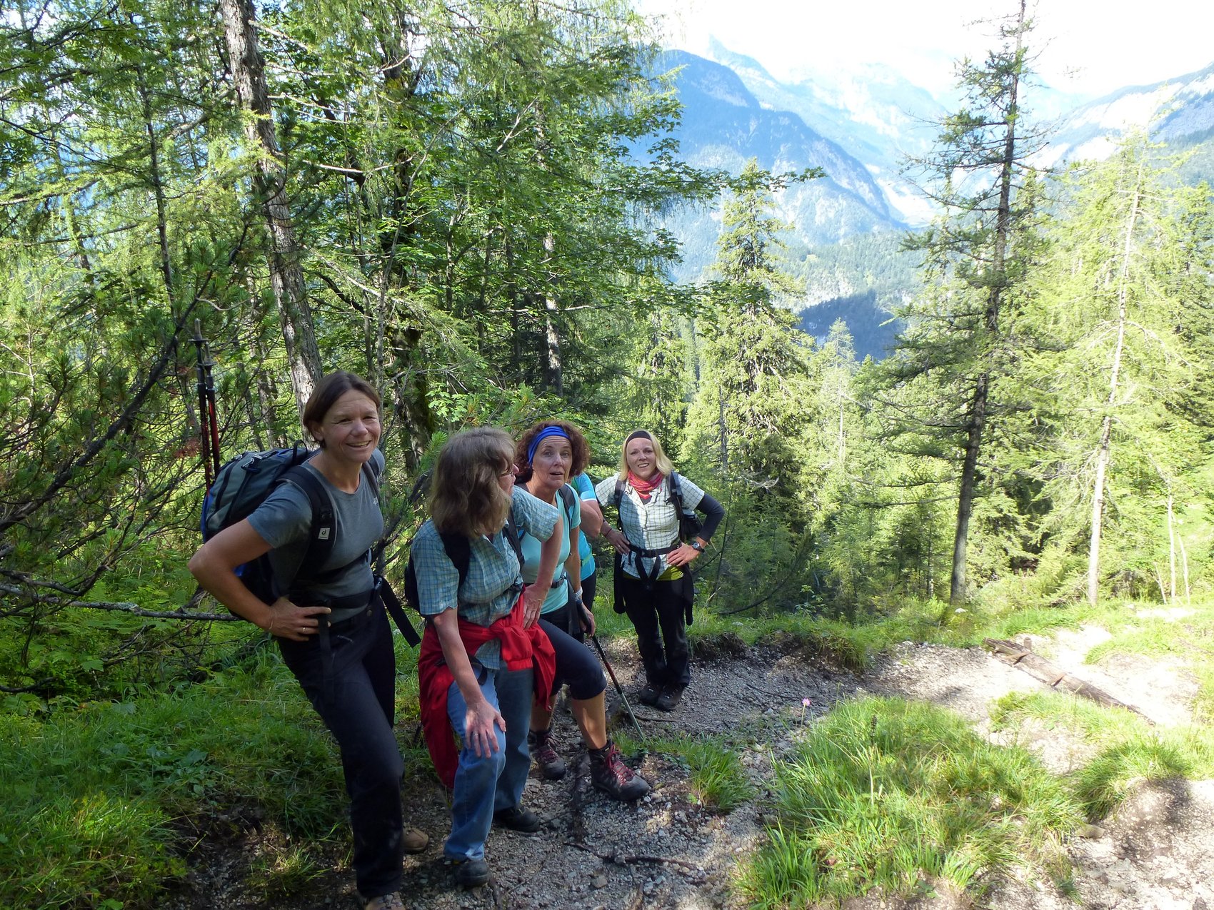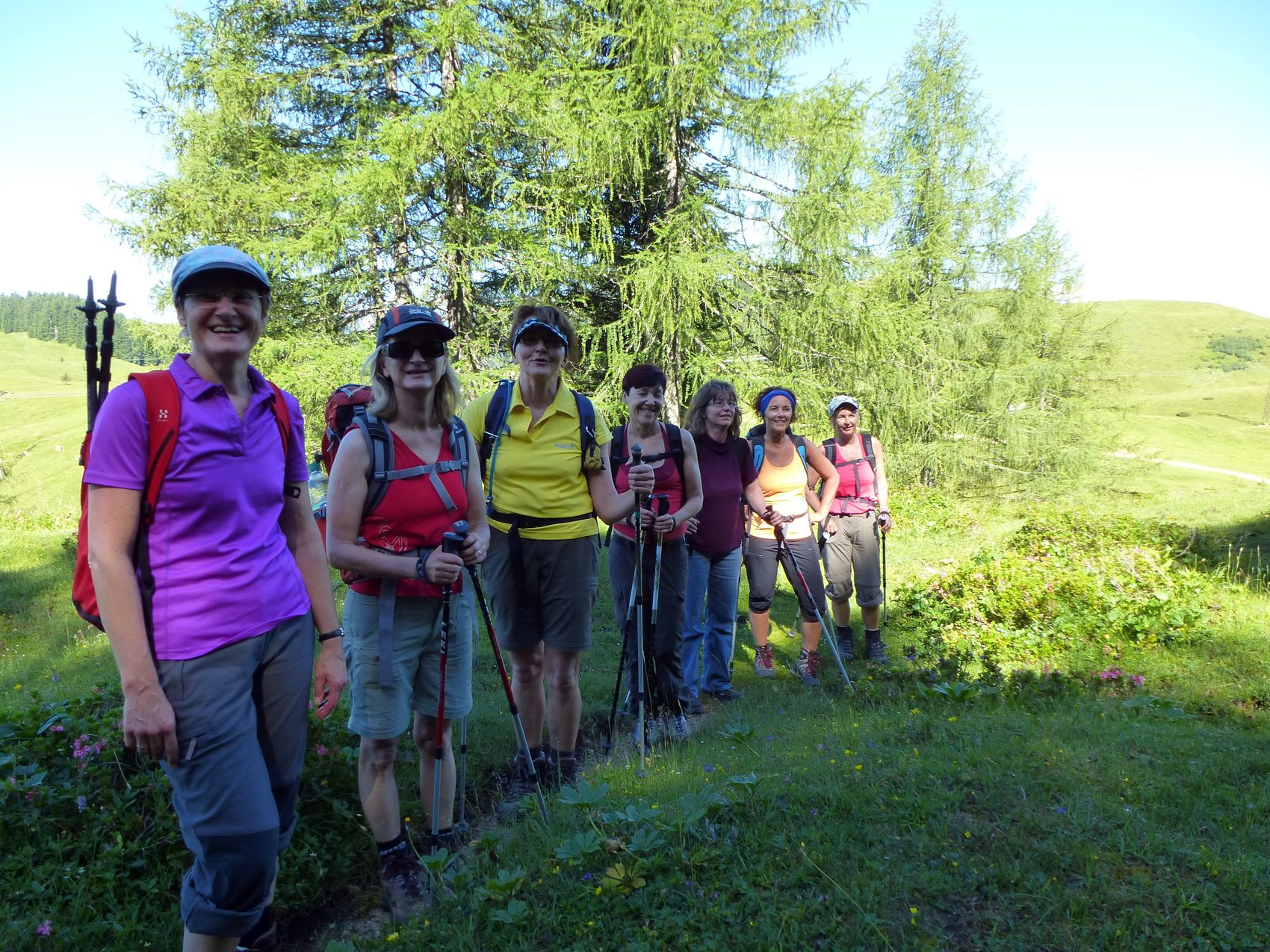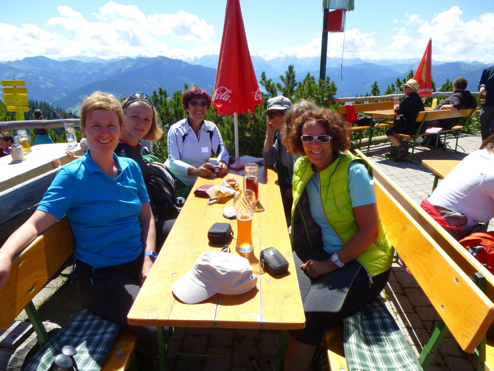 Auf die spontane Rundmail meldeten sich fünf Frauen an und wir konnten zu sechst starten. Wir änderten aber kurzfristig unser Ziel und gingen zur Peter-Wiechenthaler-Hütte, weil es wieder mal lange geregnet hatte und der Gipfelanstieg zu rutschig gewesen wäre. Schon am Parkplatz war zu erkennen, dass wir nicht die einzigen mit dieser Idee waren. In angenehmer Steigung folgten wir dem Weg Richtung Hütte, um nach ca. 1½ Stunden zum Schattseitenweg, einer etwas längeren Variante, abzuzweigen. Erst galt es ein gutes Stück wieder abzusteigen, bevor wir dann – immer schön im Schatten – nun doch etwas steiler bis zur Hütte wanderten, die wir nach gut 2½ Stunden erreichten. Wie bereits erwartet, war die Sonnenterrasse ziemlich voll, aber nach kurzer Zeit konnten wir doch einen Tisch für uns ergattern. Bei wohliger Wärme saßen wir fast zwei Stunden im Sonnenschein und genossen das wundervolle Panorama auf Schober-, Glockner- und Venedigergruppe, Kitzbüheler Alpen, Leoganger und Loferer Steinberge, die südlichen Randberge des Steinernen Meeres und zu guter Letzt natürlich auf das imposante Persailhorn. Auf dem kürzesten Weg stiegen wir dann gemütlich wieder zum Parkplatz Bachwinkl, unserem Ausgangspunkt, ab.