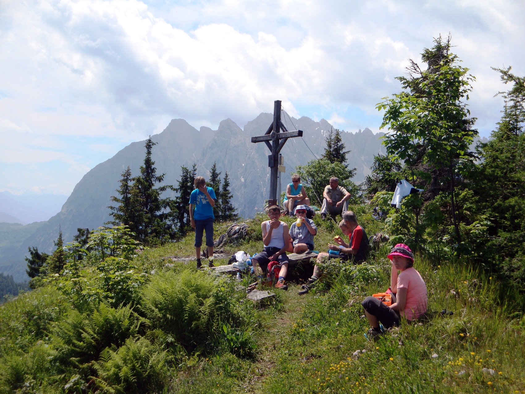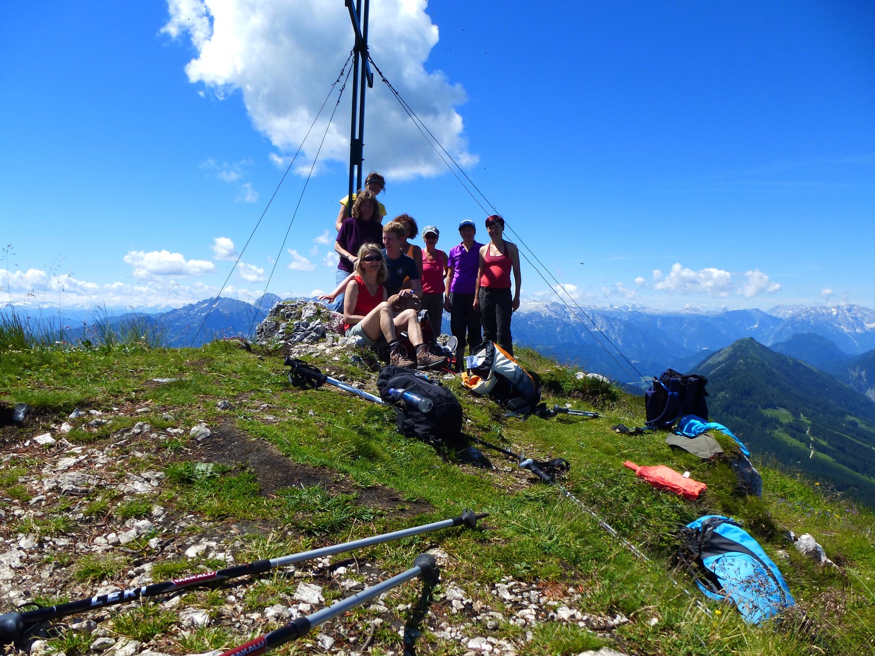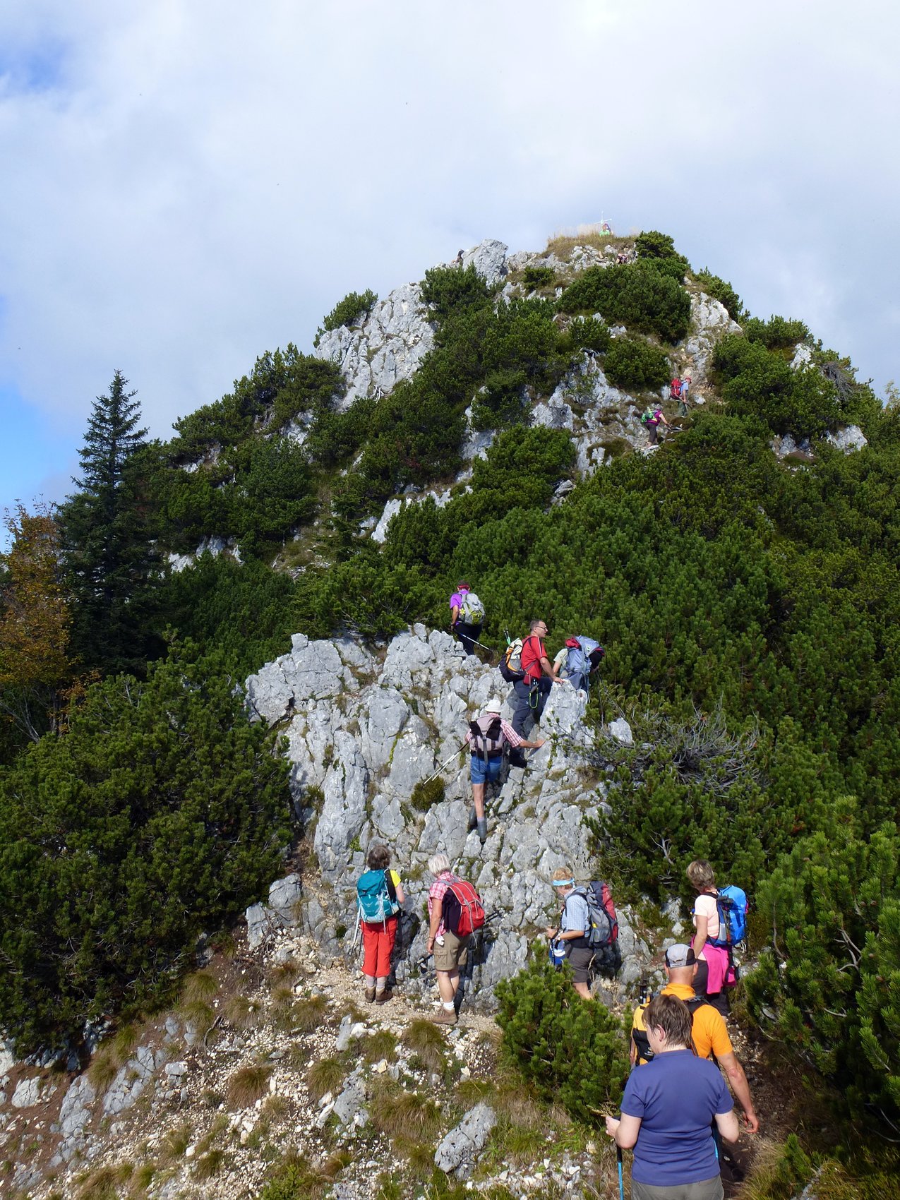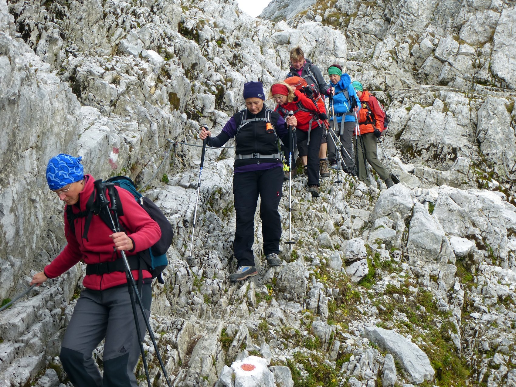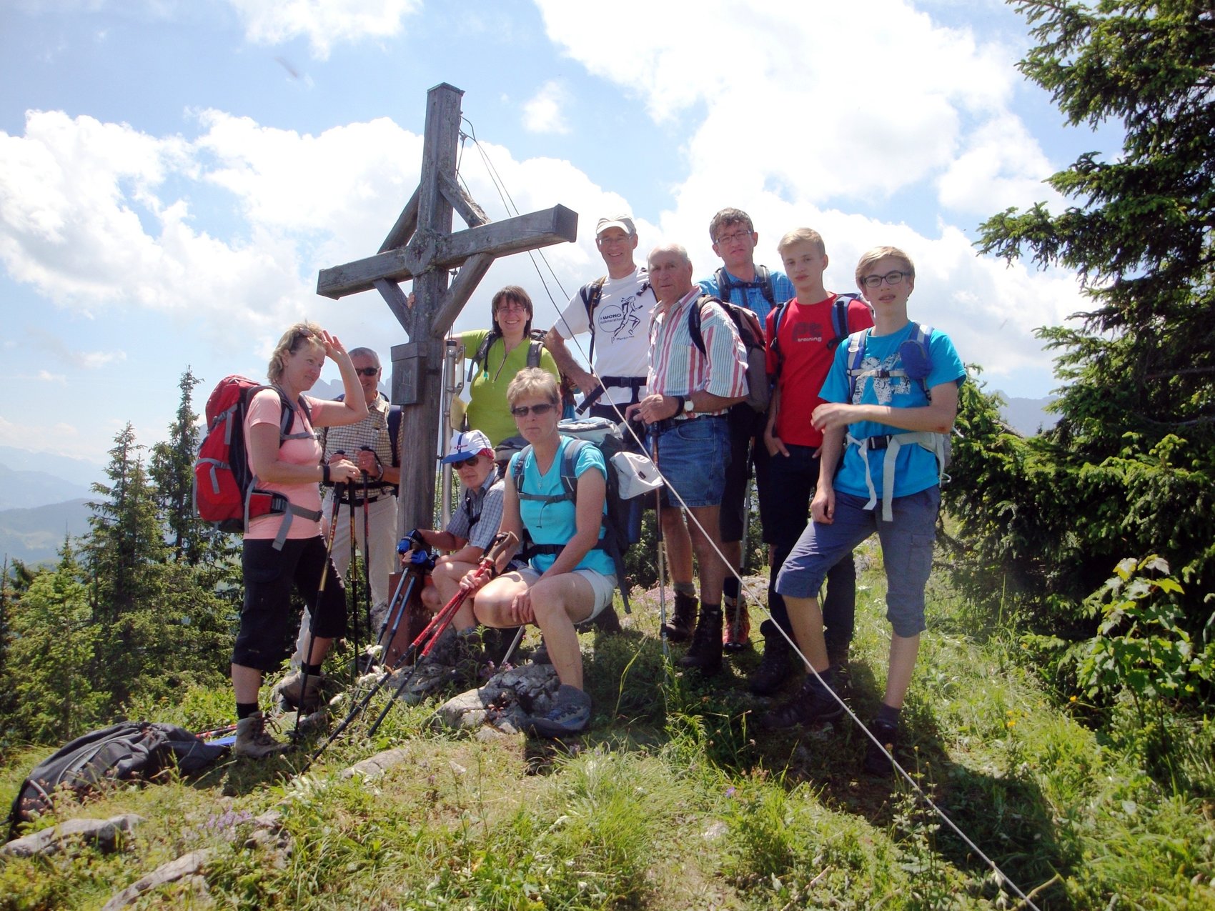 Bei bestem Wetter machten wir uns am Samstag auf den Weg über den Alpasteig vorbei an der alten Traunsteiner Hütte auf den Großen Bruder (1 867 m). Der Anstieg war wegen der Hitze ganz schön Kräfte zehrend, so dass alle froh waren, als wir am Gipfel ankamen. Der etwas ausgesetzte Gipfel bot eine herrliche Sicht auf die Loferer Steinberge und ins Salachtal Richtung Bad Reichenhall.