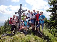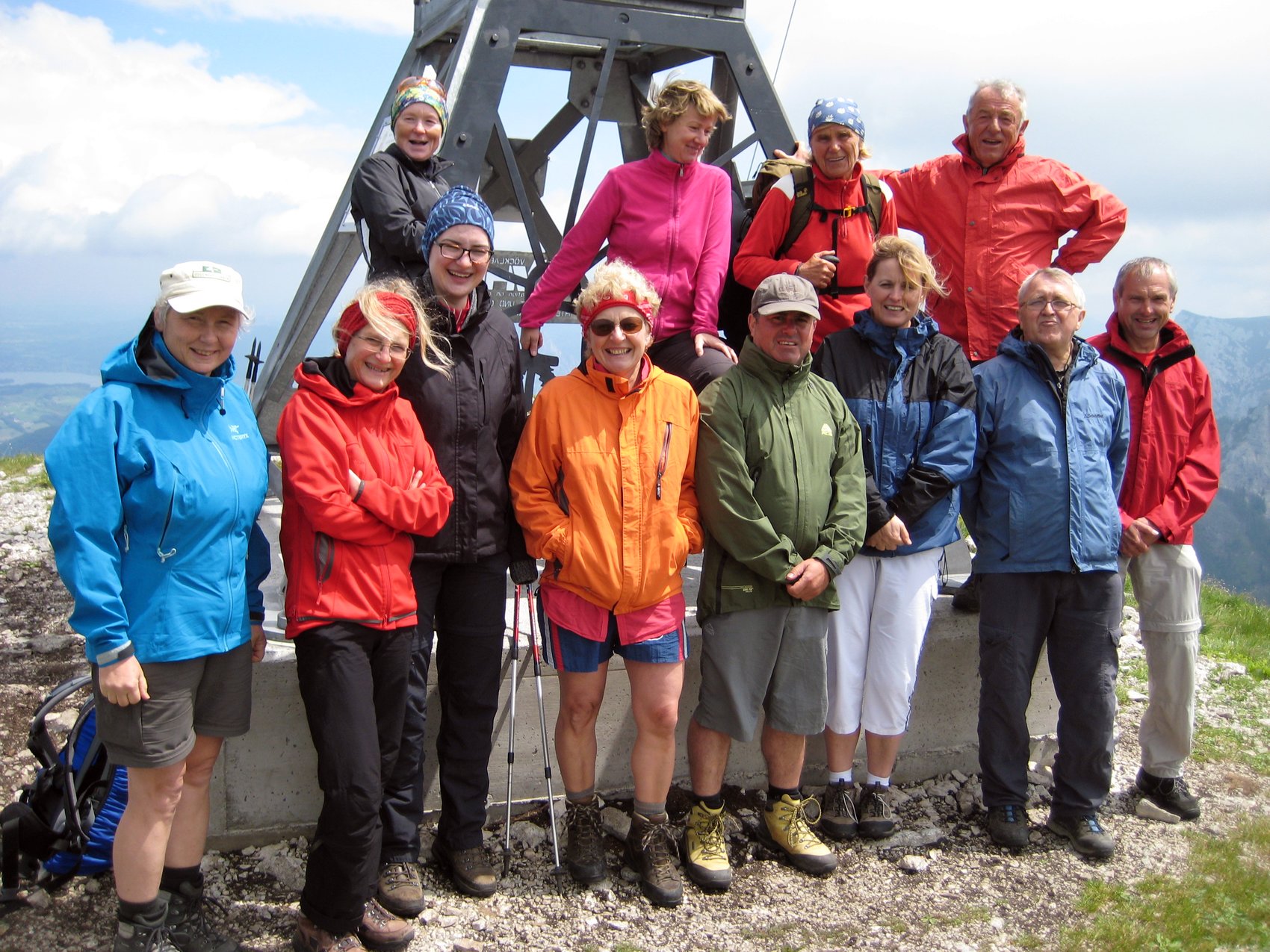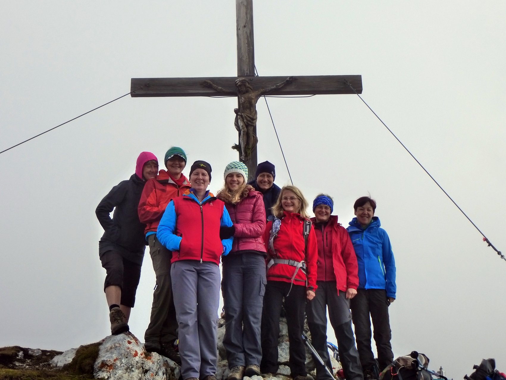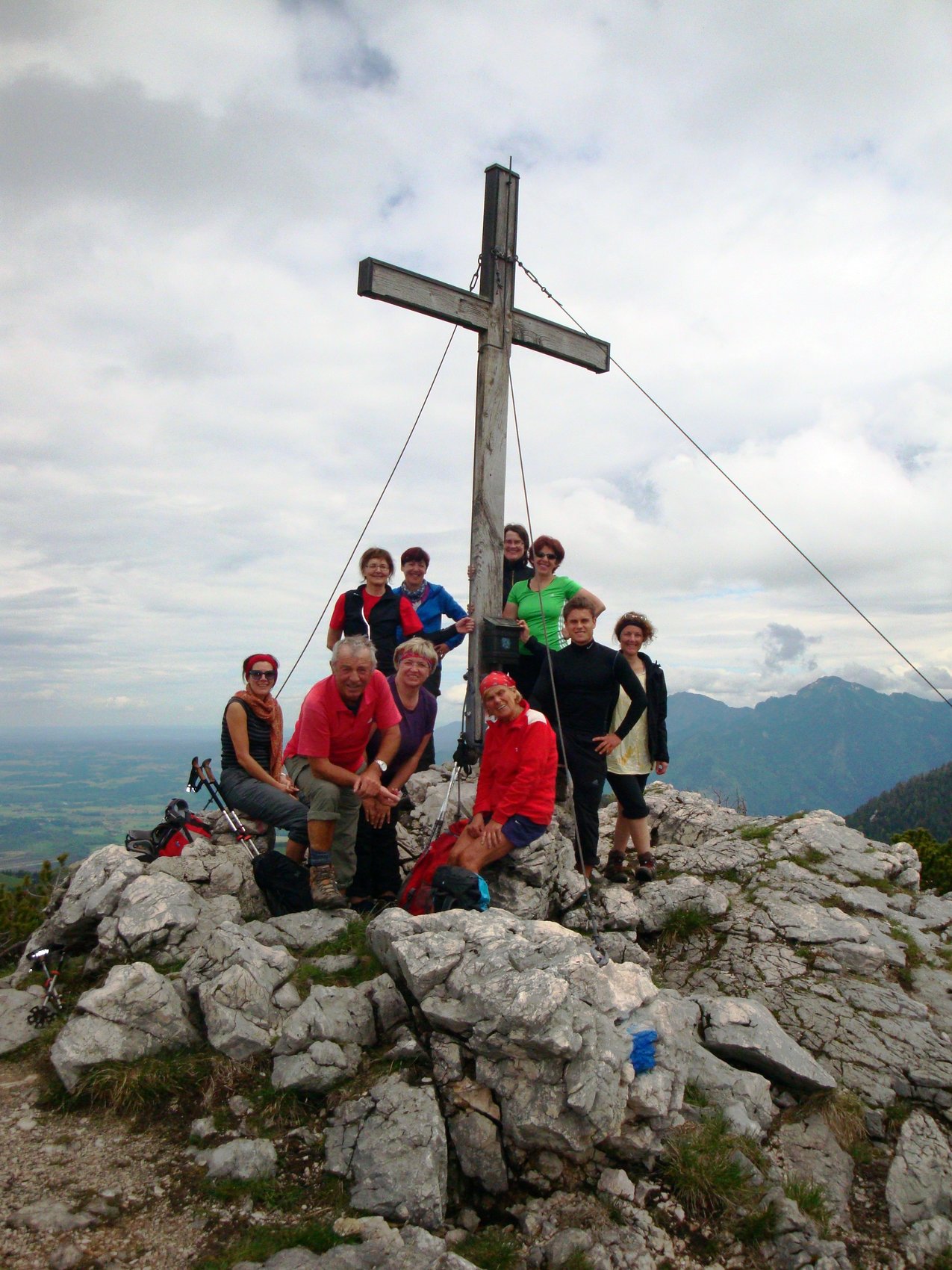 Im Programmheft stand, daß das ein einsamer Gipfel ist. Reinhard Zelger sagte das mit einem Grinsen. Da hatte er recht, denn mit uns waren 12 Bergwanderer am Gipfel. Aber wir hatten an diesem Tag das Glück, daß der Wetterdienst zwei Tage vorher schlechtes Wetter gemeldet hat. Ausgangspunkt war ein Parkplatz im Wald bei Mühlau bei Schleching. Über eine Forststraße ging es an der vorderen und hinteren Dalsenalm vorbei. Jetzt kam ein steiler Aufstieg über Almwiesen mit sehr vielen Schlüsselblumen in einen Wald mit steilen Kehren. Die letzten 100 Höhenmeter ging es noch mit Hilfe eines Stahlseils auf den Gipfel. Die Aussicht war etwas mit Wolken verdeckt, was aber unserer guten Laune keinen Abbruch tat. Nach einer Gipfelrast mit Brotzeit ging es dann auf der Südseite des Berges an der Haidenholzenalm vorbei wieder ins Tal. Wir machten an diesem Tag eine Gipfelüberschreitung. Im Ortsteil Mühlau kehrten wir dann in einem Biergarten ein.