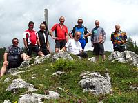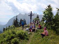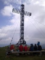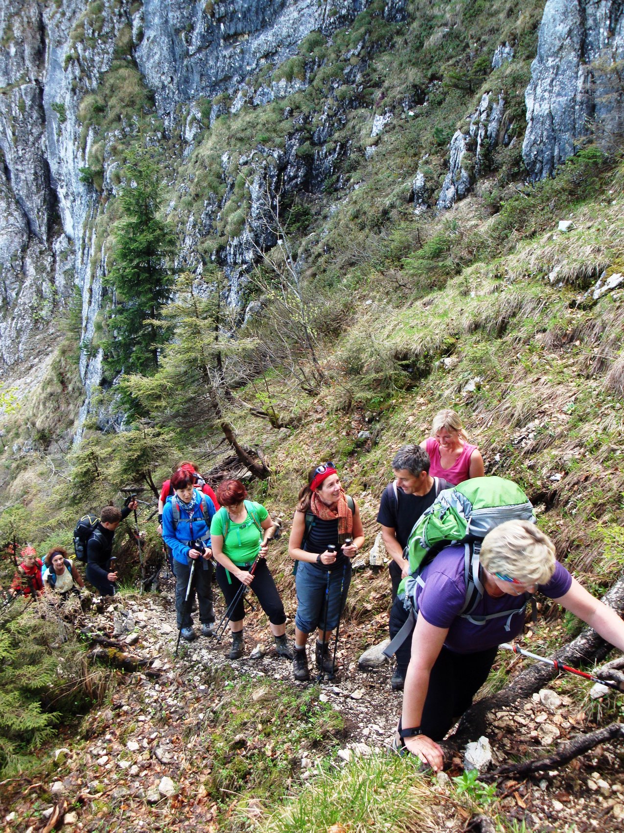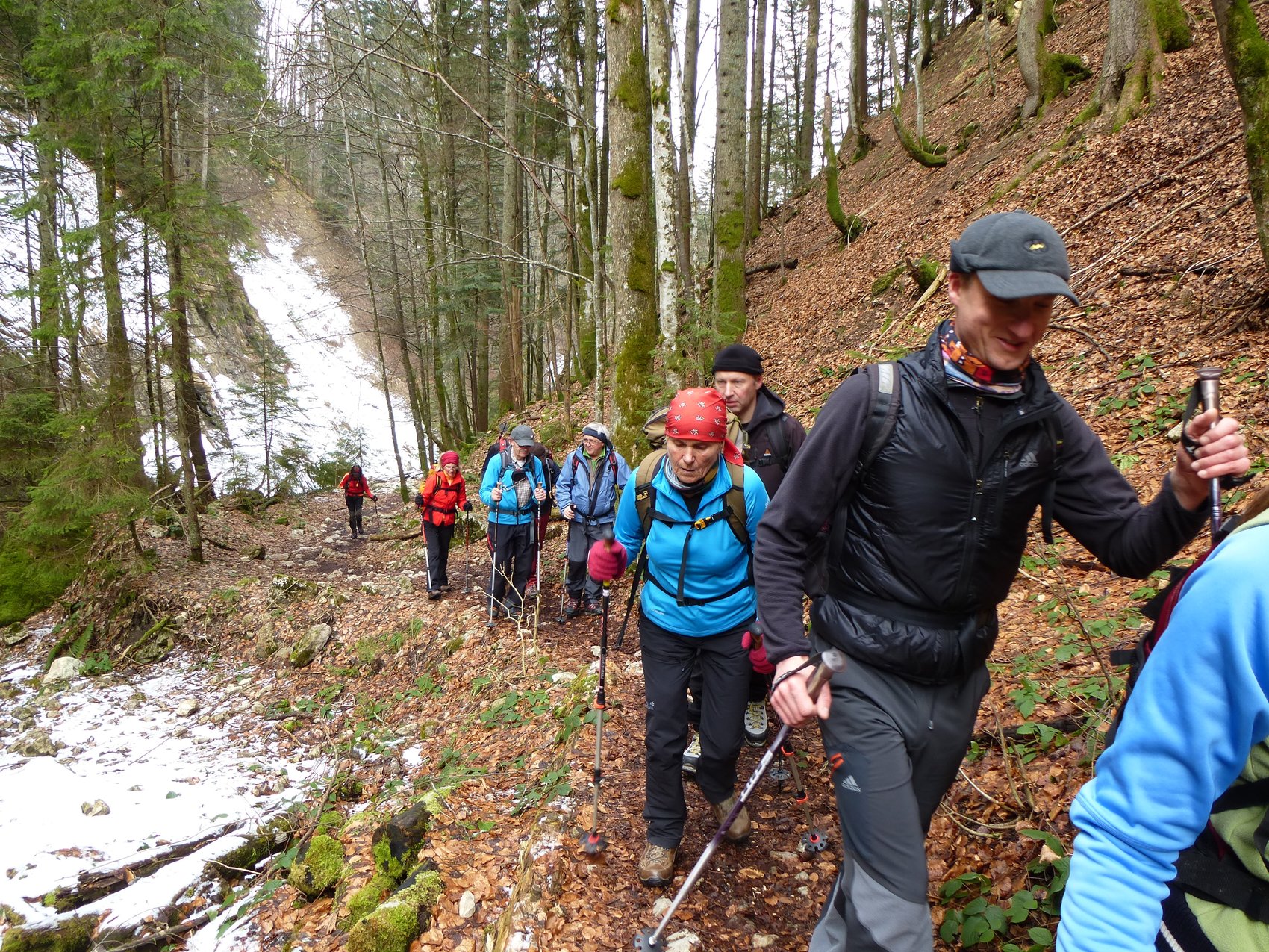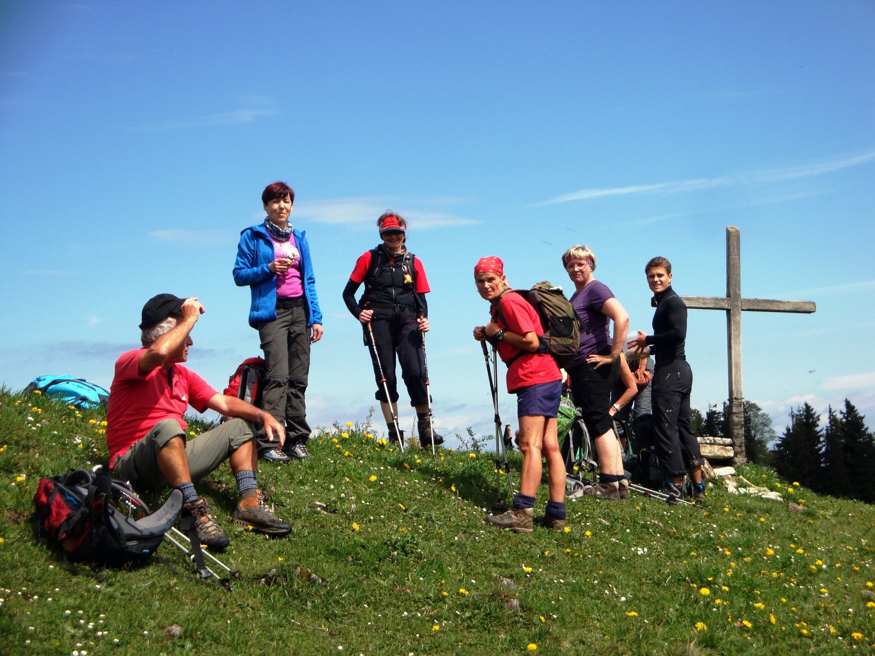 Im Programmheft stand, daß das ein einsamer Gipfel ist. Reinhard Zelger sagte das mit einem Grinsen. Da hatte er recht, denn mit uns waren 12 Bergwanderer am Gipfel. Aber wir hatten an diesem Tag das Glück, daß der Wetterdienst zwei Tage vorher schlechtes Wetter gemeldet hat. Ausgangspunkt war ein Parkplatz im Wald bei Mühlau bei Schleching. Über eine Forststraße ging es an der vorderen und hinteren Dalsenalm vorbei. Jetzt kam ein steiler Aufstieg über Almwiesen mit sehr vielen Schlüsselblumen in einen Wald mit steilen Kehren. Die letzten 100 Höhenmeter ging es noch mit Hilfe eines Stahlseils auf den Gipfel. Die Aussicht war etwas mit Wolken verdeckt, was aber unserer guten Laune keinen Abbruch tat. Nach einer Gipfelrast mit Brotzeit ging es dann auf der Südseite des Berges an der Haidenholzenalm vorbei wieder ins Tal. Wir machten an diesem Tag eine Gipfelüberschreitung. Im Ortsteil Mühlau kehrten wir dann in einem Biergarten ein.