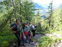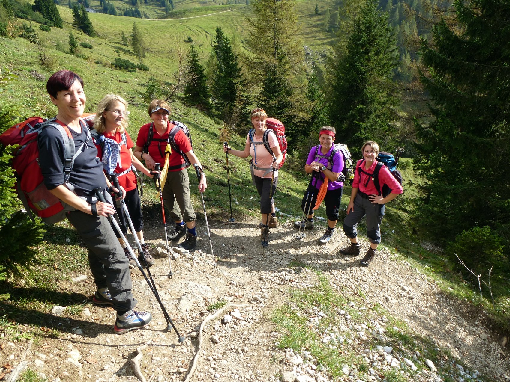 Der Abstieg erfolgte auf gerölligem Steig durch Latschen bis zu einem Kamm, auf dem man – stets die beeindruckenden Steilwände des Scharfen im Blick – in die Sill (bewaldetes Kar zwischen Braunedlkogel und dem Scharfen) abstieg. Schon bald hatten die Damen die wohlverdiente Rettenegghütte mit ihren Schmankerln erreicht. Von hier galt es nun noch die letzten 20 Minuten auf breitem Forstweg zum Auto zurückzukehren.