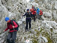 Der sonnige Platz auf der Terrasse mit Blick ins Salzburger Land lud förmlich zu einem gemütlichen Tagesausklang ein. Wie auf vielen Hütten gibt es auch dort mittlerweile einen nepalesischen Mitarbeiter, der uns am Abend mit einem Reiscurry verwöhnte. Am nächsten Morgen startete die Gruppe zur Besteigung des Großen Eiskogels (2 321 m). Zuerst steil durch Latschen, dann durch das weite, zur Tauernscharte hinaufziehende Kar stiegen wir zur riesigen Plateauhochfläche des südlichen Tennengebirges hinauf. Von dort mussten wir noch ca. 35 Hm zur Eiskogelgrube absteigen, bevor der Gipfelendspurt begann. Dort angekommen präsentiert sich dem Bergsteiger ein unvergleichlicher Ausblick auf die Karstwüste des Tennengebirgsplateaus. Nach einer Gipfelrast führte der Aufstiegsweg auch wieder zurück zur Hütte mit Blicken auf Gosaukamm, Werfener Hochthron und Hochkönig und anschließend zum Ausgangspunkt.
