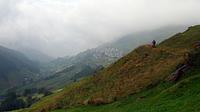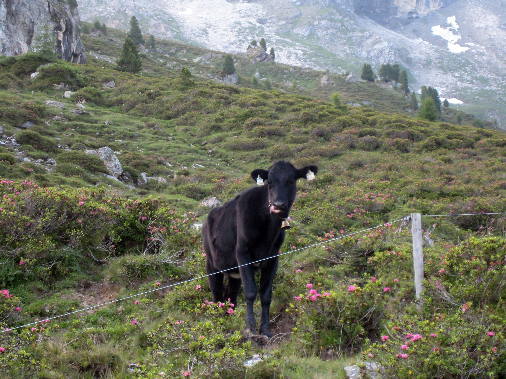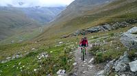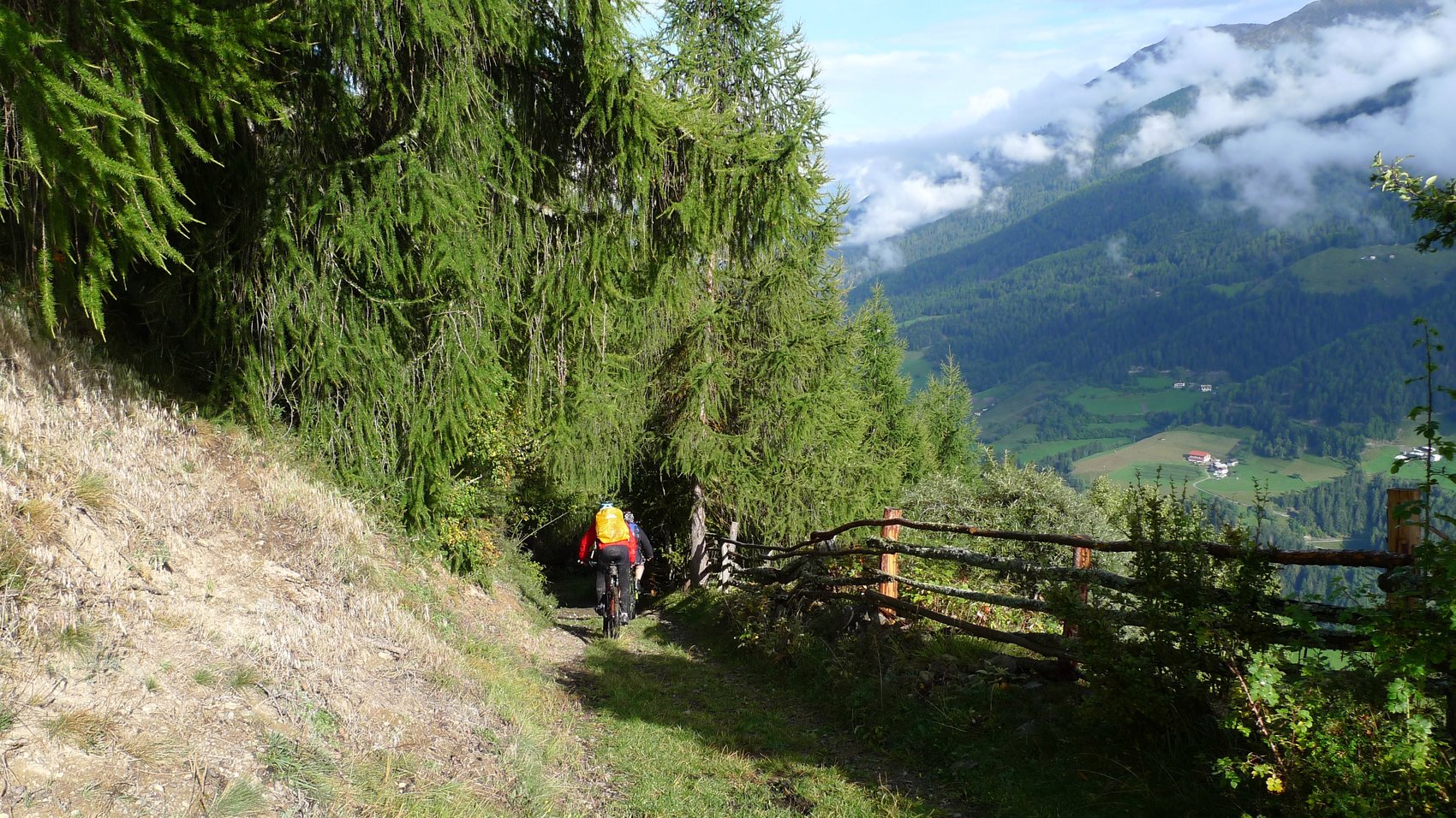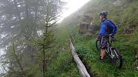Was für ein Wochenende! Schon die Anfahrt. Nach krankheitsbedingtem Ausfall waren wir zu viert, also ein Pkw. Das zweite Dachträgerpaar paßt nicht, also andere besorgen, mit dem Lupo zu dritt nach Rosenheim, umladen, umbauen, zu viert weiter. Alles klappt und wir können etwas spät um halb zwölf bei Latsch im Vinschgau starten. Das Wetter hätte besser nicht sein können – daheim in Bayern. Hier war’s neblig, frisch und regnerisch, drei Tage lang. Aber bei den steilen Anstiegen wurde es keinem kalt. Bei den Abfahrten auch nicht. Durch wochenlangen Regen batziger Boden und wohl dutzende Kuhherden mit ihren Hinterlassenschaften haben dafür gesorgt, daß auch bergab sehr zurückhaltend gefahren wurde.