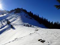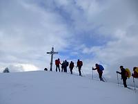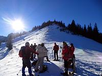 Auch diese Tour mussten wir witterungsbedingt um einen Tag vorziehen, was sich letztlich als vollkommen richtig herausstellte. Obwohl sich nach wie vor keine zufriedenstellende Schneedecke gebildet hatte, konnten wir nach kurzer Zeit unsere Schneeschuhe anziehen und bis zum Gipfel auch anbehalten. Bei frühlingshaften Temperaturen forderte der Steilhang unter der „Schneid“ den einen oder anderen Schweißtropfen. Diese wurden bei einer fast 1 ½-stündigen Gipfelrast mit edlen Getränken wieder ersetzt. Nach dem Abstieg über die Nordseite leisteten wir uns in Ruhpolding bei der „Windbeutelgräfin“ einen Kaffee bzw. ein Bier.