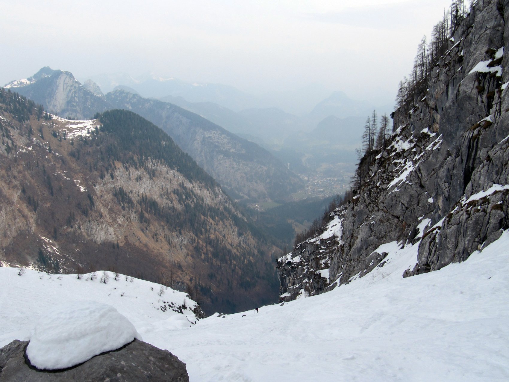 So machten wir uns über das Aschbachtal und die Grasingalm auf zum Schatzberg. Der Schnee reichte hier im unteren Teil knapp für den Aufstieg. Nach einer Gipfelrast bei traumhaft schönem Wetter am Hahnkopf 1 902 m machten wir uns an die Abfahrt über die Skipiste des Schatzbergskigebietes. Doch auch hier war der Schnee selbst auf der Piste im unteren Teil knapp. Wer hätte da gedacht, dass uns den ganzen Winter im Nordalpenbereich dieser Schneemangel begleiten würde.