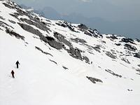 Wenn die Voralpen und die Täler schon grün sind, dann ist’s die richtige Zeit für das Loferer Skihörndl. Die ersten 20 Minuten mußten wir zwar die Ski tragen, aber danach hatten wir gute Verhältnisse. Bis in die kleine Wehrgrube unterm Gipfel stiegen wir ohne Schwierigkeiten im nicht zu harten Schnee. Die letzten paar Hundert Höhenmeter waren dafür, dank dünner, rutschiger Schneeauflage auf beinhartem Harsch, anspruchsvoll. Mit guter Steigtechnik war auch dieser Abschnitt gemeistert und um halb zwölf standen wir am Gipfel, noch bevor das angekündigte Schlechtwetter reinzog. Da es recht frisch und ungemütlich war, machten wir uns nach kurzer Pause auf die 1500-Hm-Abfahrt zurück ins Tal.