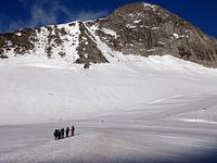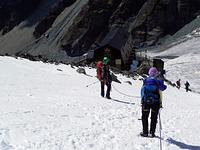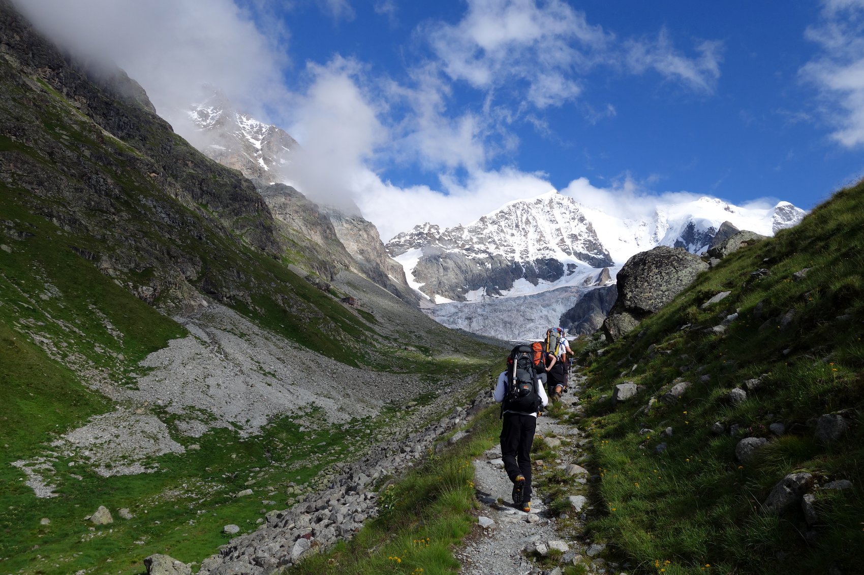 Von Pontresina fuhren wir mit unseren Mountainbikes ins Val Roseg. Kurz nach dem Hotel Roseg ging es dann zu Fuß weiter auf die Tschierva-Hütte. Nach einer kurzen Nacht stiegen wir am frühen Morgen mit unseren Stirnlampen über den Tschirvagletscher auf zum Einstieg des Eselsgrats.