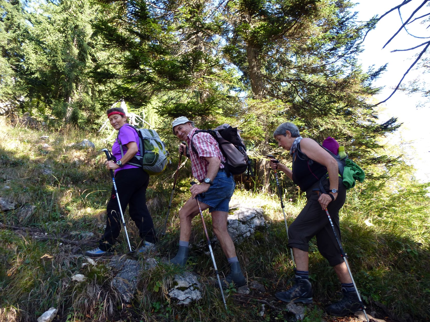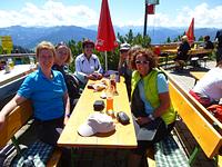 Bei uns Sonne, am Ziel leichter Regen, so marschierten wir mit Regenbekleidung los. Doch schon nach 20 Minuten hörte der Regen auf und es wurde stündlich schöner. Franz bannte die Gruppe mit Bild und Ton auf seine Kamera, was wir beim Rückblick der etwas anderen Art in der Bacchus-Stubn sehen werden. Auf der Hörndlwand machten wir Brotzeit, am Gurnwandkopf reichte eine Trinkpause. Auf dem Rückweg kehrten wir gutgelaunt auf der Hörndlalm ein, hier suchten die meisten schon den Schatten, wie auch der Hund von Beatrice.