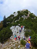 Die Wanderung auf den Rauhenkopf gehört noch zu den einsamen Touren, die man im Berchtesgadener Wanderland unternehmen kann. Gestartet sind wir am Aschauer Weiher. Nach wenigen Minuten erreichten wir den Maximilians-Reitweg. Bald ging es dann aber in nördlicher Richtung auf gutem, wenn auch steilem Weg durch den Wald bergauf. Bei dem Blauen Kastl wechselten wir vom guten Weg auf den ebenfalls steilen Steig. Ein Felsaufschwung und eine sehr ausgesetzte Stelle forderte die ganze Aufmerksamkeit. Doch bald darauf standen alle 13 Teilnehmer auf dem Gipfel vom Großen Rauhenkopf. Leider war die Aussicht auf den nahen Untersberg und Watzmann nicht ungehindert möglich. Die heiklen Stellen wurden beim Abstieg ebenfalls gemeistert, bevor wir auf dem weiteren Rückweg der Kastensteinerwandalm unseren Besuch abstatteten. Nach einer ausgiebigen, sonnigen Terrassenrast war der Rückweg zum Aschauer Weiher nur noch ein Klacks.