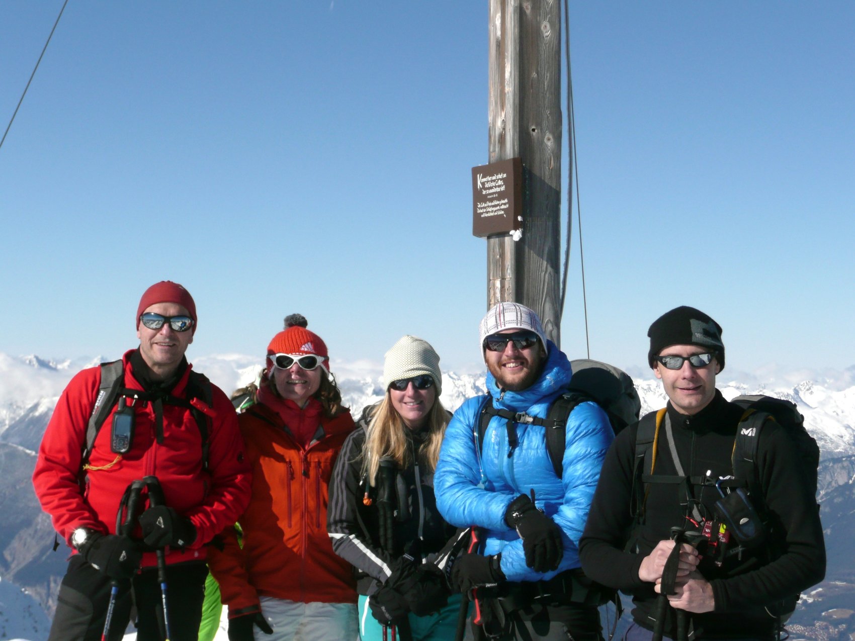 Mit vollgepacktem DAV-Bus fuhren wir am frühen Samstagmorgen ins Sellraintal. Puren Skigenuß hatten wir bei der Abfahrt von der Schöntalspitze. Ein Hang schöner als der andere, und das bis zu unserer Unterkunft, dem Alpengasthof Lüsens. Nach einem geselligen Hüttenabend machten wir uns am frühen Morgen auf zum Lisenser Fernerkogel. Knapp 1 600 Hm mit Fellen unter den Skiern zum Skidepot und weitere 100 Hm über einen leichten Felsgrat brachten uns bei bestem Bergwetter auf den Gipfel. Nach einer langen und rassigen Abfahrt genossen wir die Sonne und einen Kaffee auf der Terrasse des Alpengasthofs.