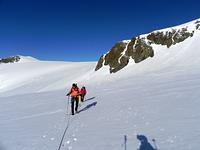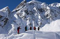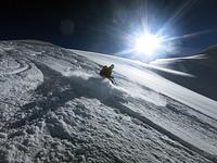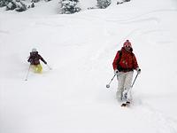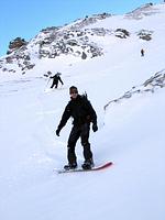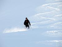 Die Schneeverhältnisse waren für eine Voralpentour wie das geplante Trainsjoch nicht ausreichend. Ein hoher und trotzdem mit dem Auto erreichbarer Ausgangspunkt mußte her. Ein Pistler wäre nach Hochfügen ins Zillertal gefahren, warum also nicht auch wir? Noch vor dem großen Andrang waren wir vor Ort und machten uns auf Richtung Roßkopf, unserem Ziel. Das Skigebiet war schnell verlassen und so konnten wir unsere eigene Spur in den noch unberührten Hang hinauf zum Sidanjoch und weiter auf den Grat (2 200 m) legen. Nach kurzer Rast machten wir uns auf die zweite Etappe zum Gipfel. Die Strecke über 2 km und 450 Hm mit teilweise anspruchsvollen vereisten Passagen war nicht zu unterschätzen. Für die Abfahrt wählten wir die direkte Variante über den Nordhang, wo wir teilweise noch alten unverspurten Pulver fanden.
