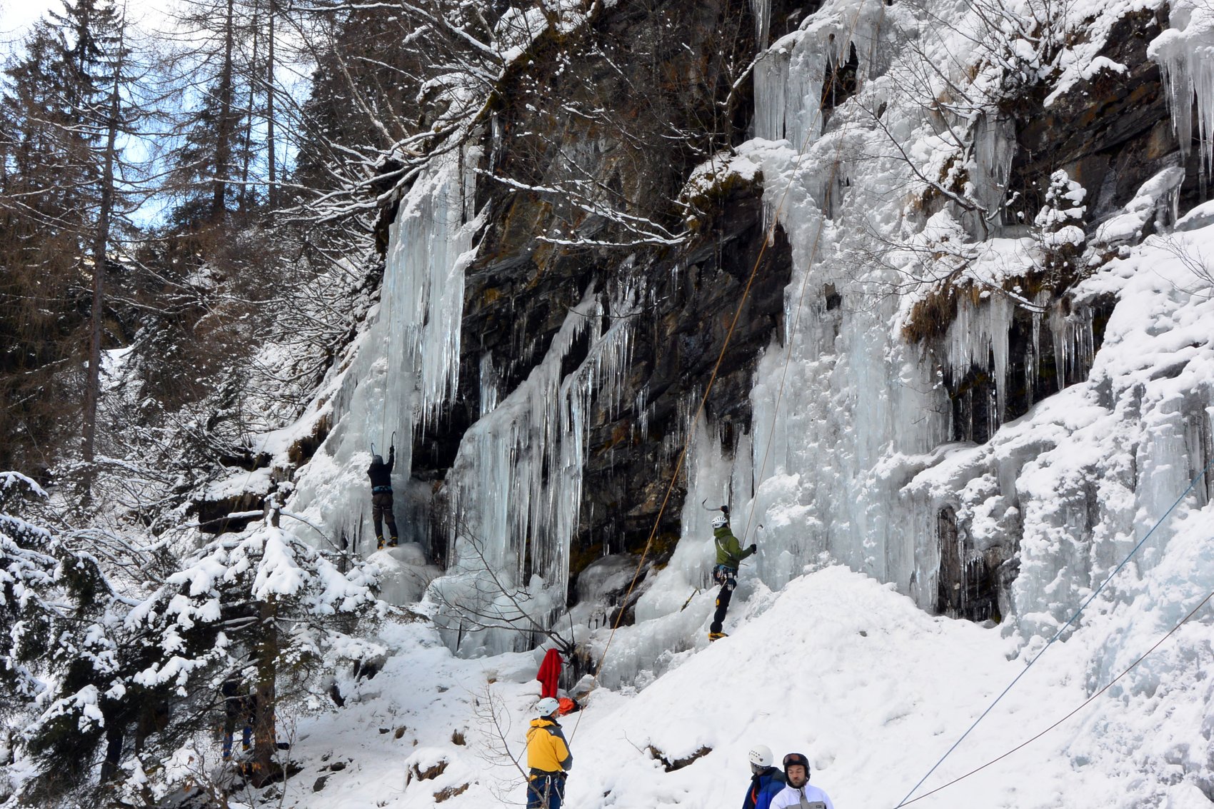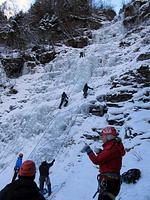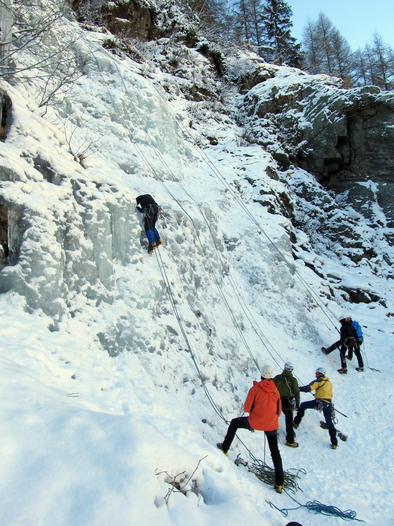 Trotz des schlechten Winters haben wir im Sellrain gut stehende Eisfälle vorgefunden. Die Eisklettergärten Gasthausfall und Bafflfall um Lüsens boten ideales Gelände für die ersten Schritte im Wasserfalleis. Nach einer Aufwärmrunde im Toprope an den geneigten Eisplatten haben wir uns voller Motivation an die Einführung in die Pickel- und Steigeisentechnik gemacht. Der ein oder andere hat schnell bemerkt, dass noch kein Meister vom Himmel gefallen ist und das Beherrschen der Techniken, wie das Einschlagen des Eisgeräts ins Eis, mit etwas Übung verbunden ist.