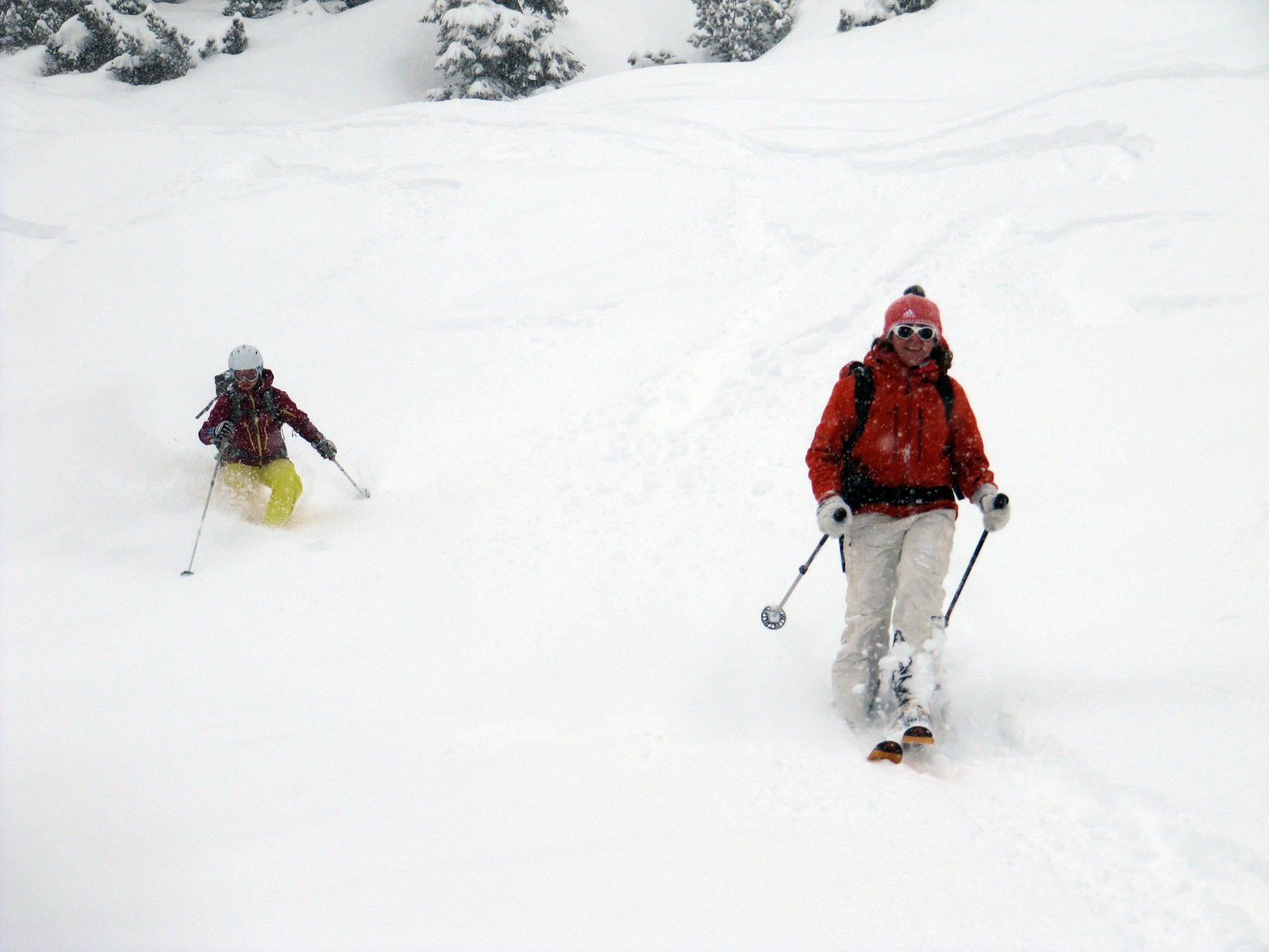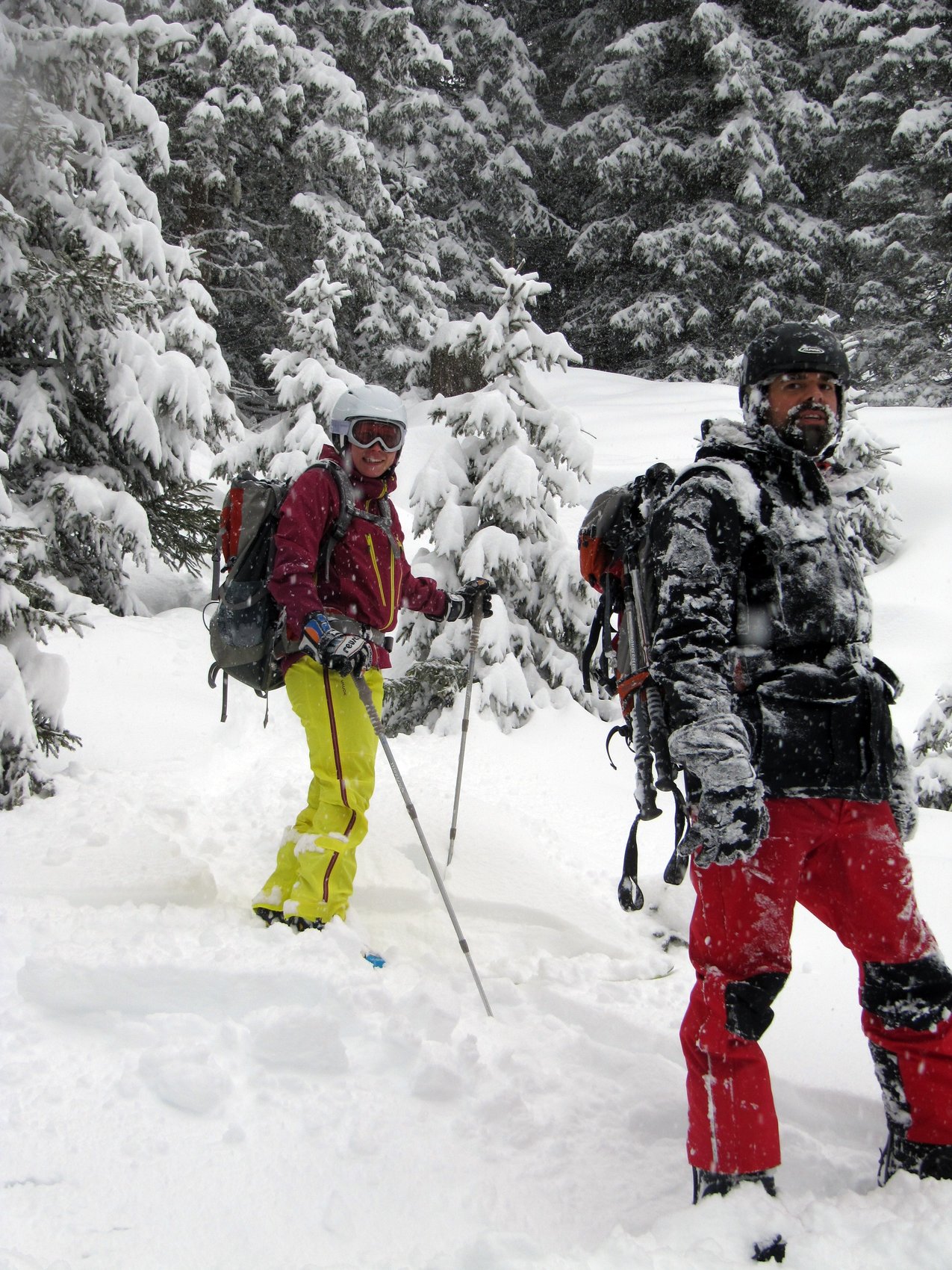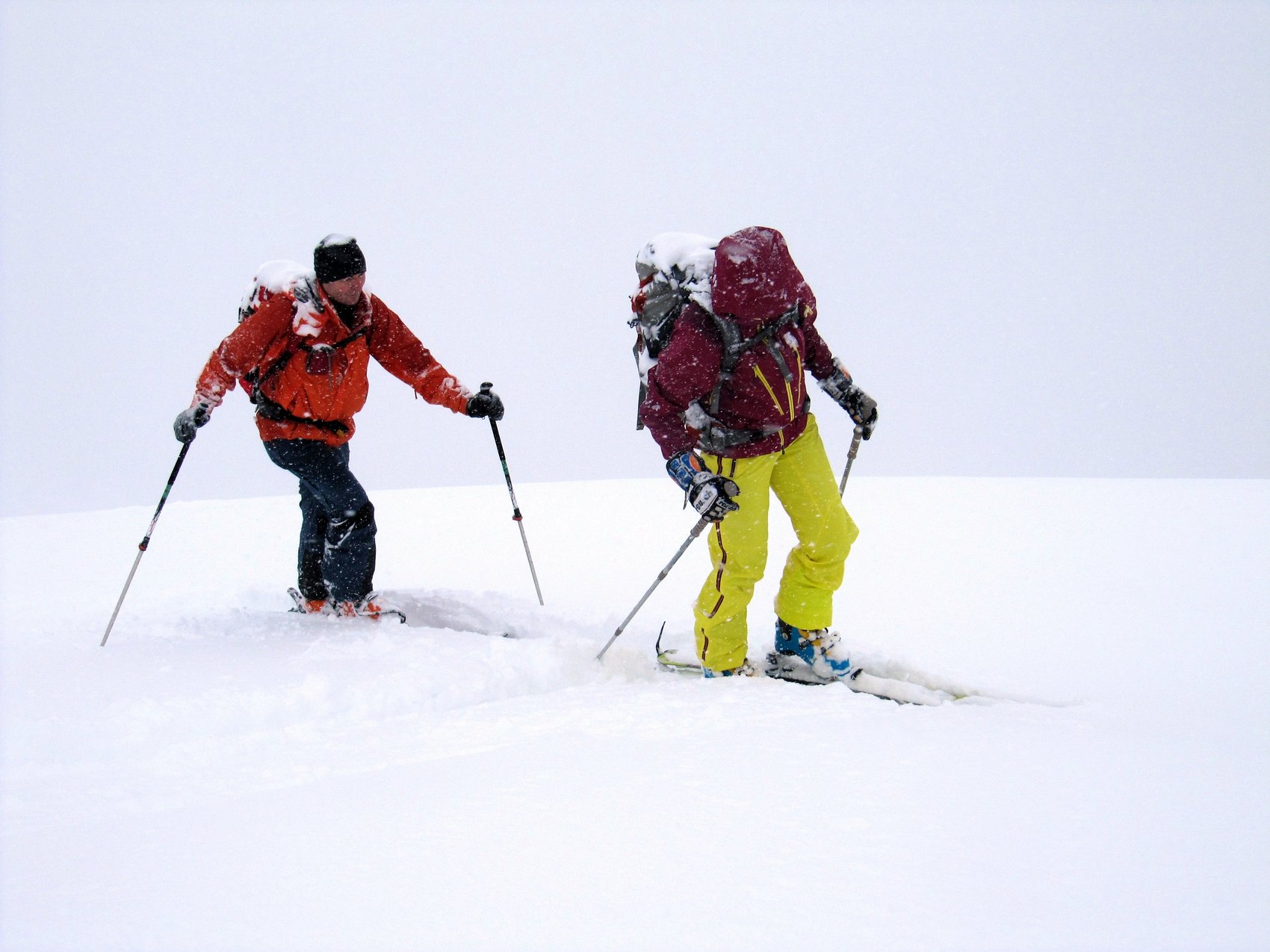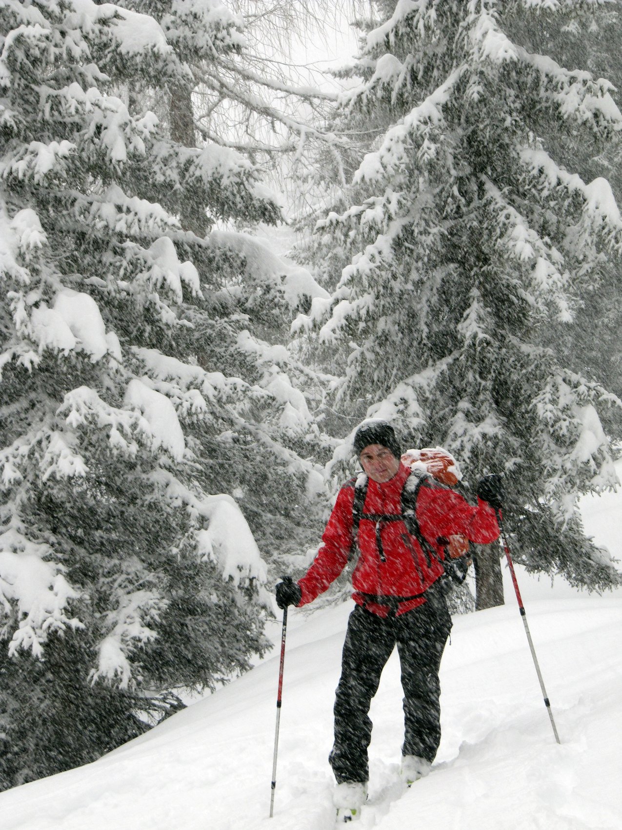 Auf der Suche nach ausreichend Schnee sind wir nach Zauchensee gefahren. Schon auf den ersten Metern des Anstiegs war klar: Schnee gibt’s mehr als genug – auch von oben. Und da es auch nicht aufhörte zu schneien, blieben wir die einzigen, die die 800 Hm zum Gipfel des Strimskogels spurten. So richtig gemütlich war es am Gipfel nicht, daher rasteten wir nur kurz und machten uns auf die staubende Abfahrt. Ein paar flache Passagen kosteten viel Schwung und dem Snowboarder wohl ein paar Nerven. Viel Spaß machte die Abfahrt trotzdem allen.