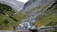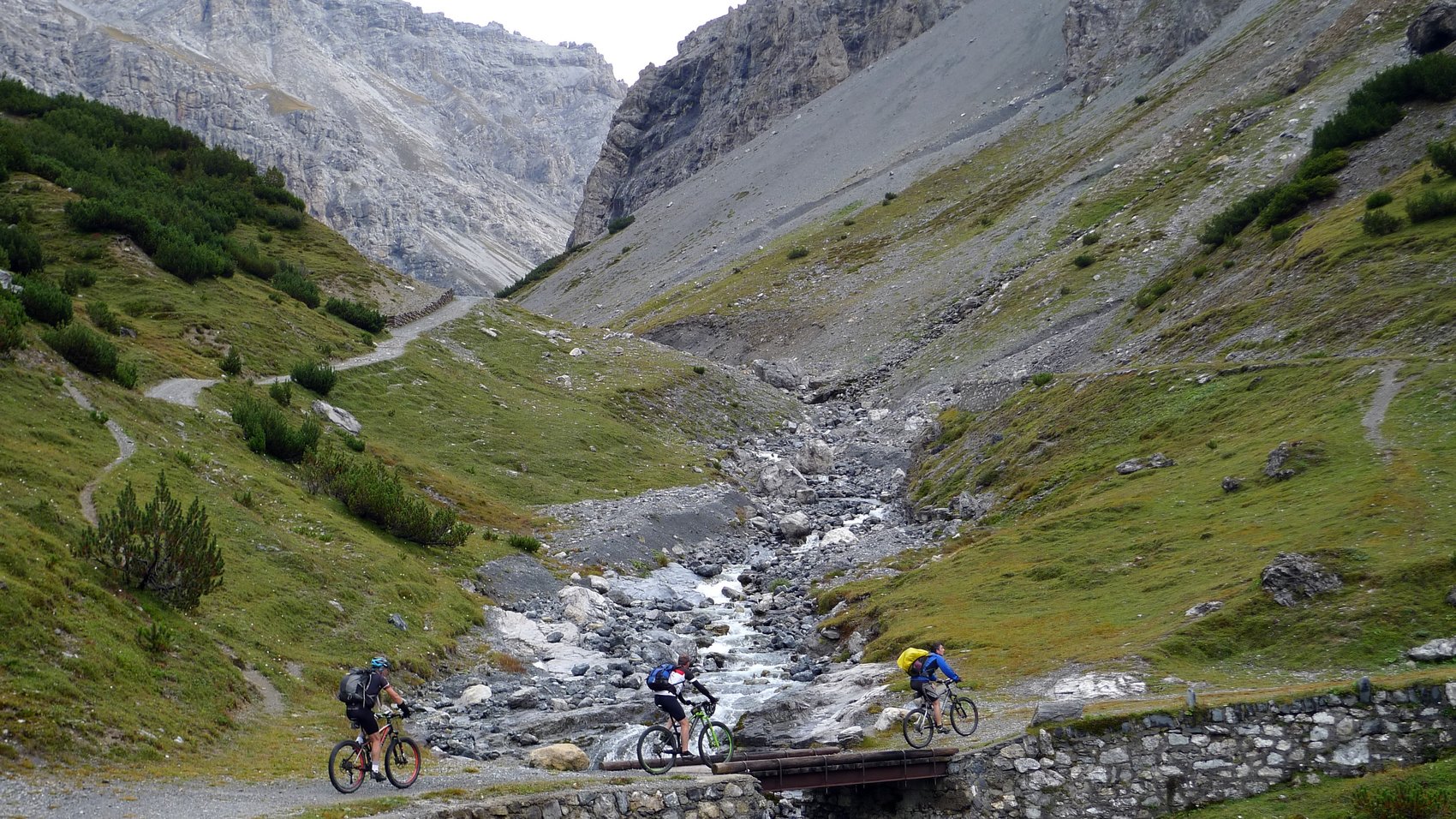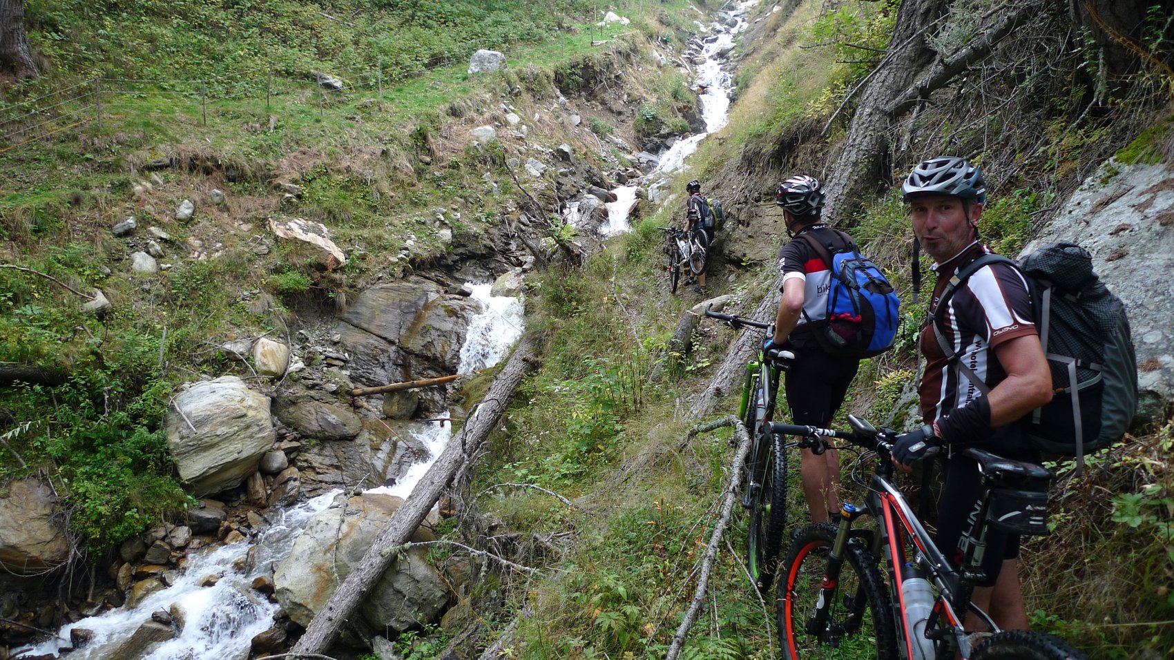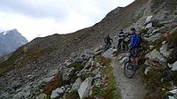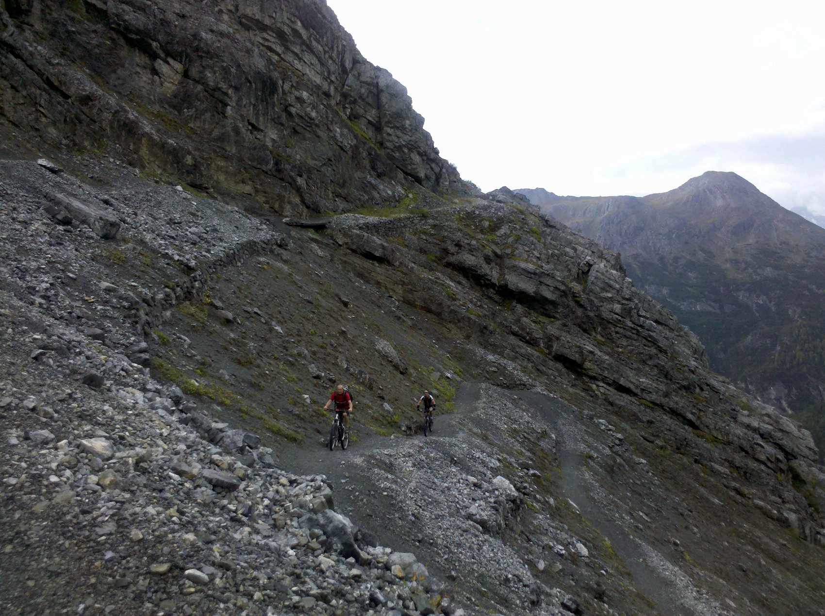 Am dritten Tag stand der berüchtigte Goldseetrail auf dem Programm. Doch schon der Weg dahin, über Bocchetta di Pedenolo (2 704 m), Bocchetta die Forcola (2 768 m), Umrailpaß und hinauf auf’s Stilfersjoch (2 838 m) über spitzen Singletrails war’s wert. Nach der ausgesetzten, sehr anspruchsvollen und gelegentlich mit Trage- und Schiebepassagen unterbrochenen Abfahrt hinunter nach Prad am Stilfserjoch rollten wir gemütlich durch Obstplantagen nach Laas.