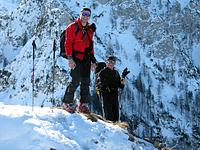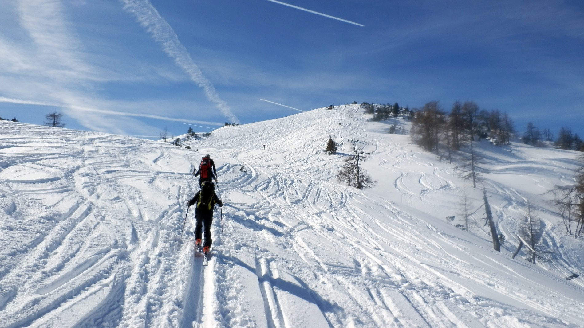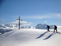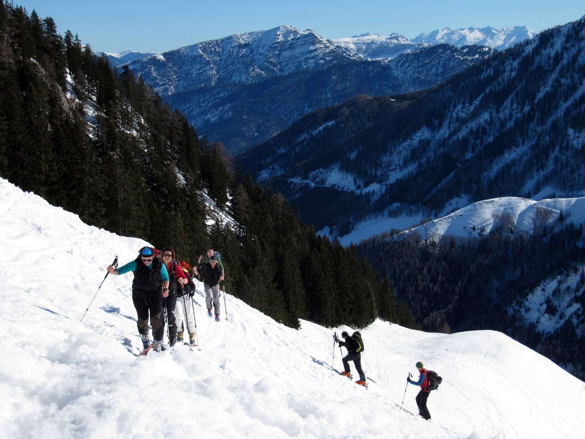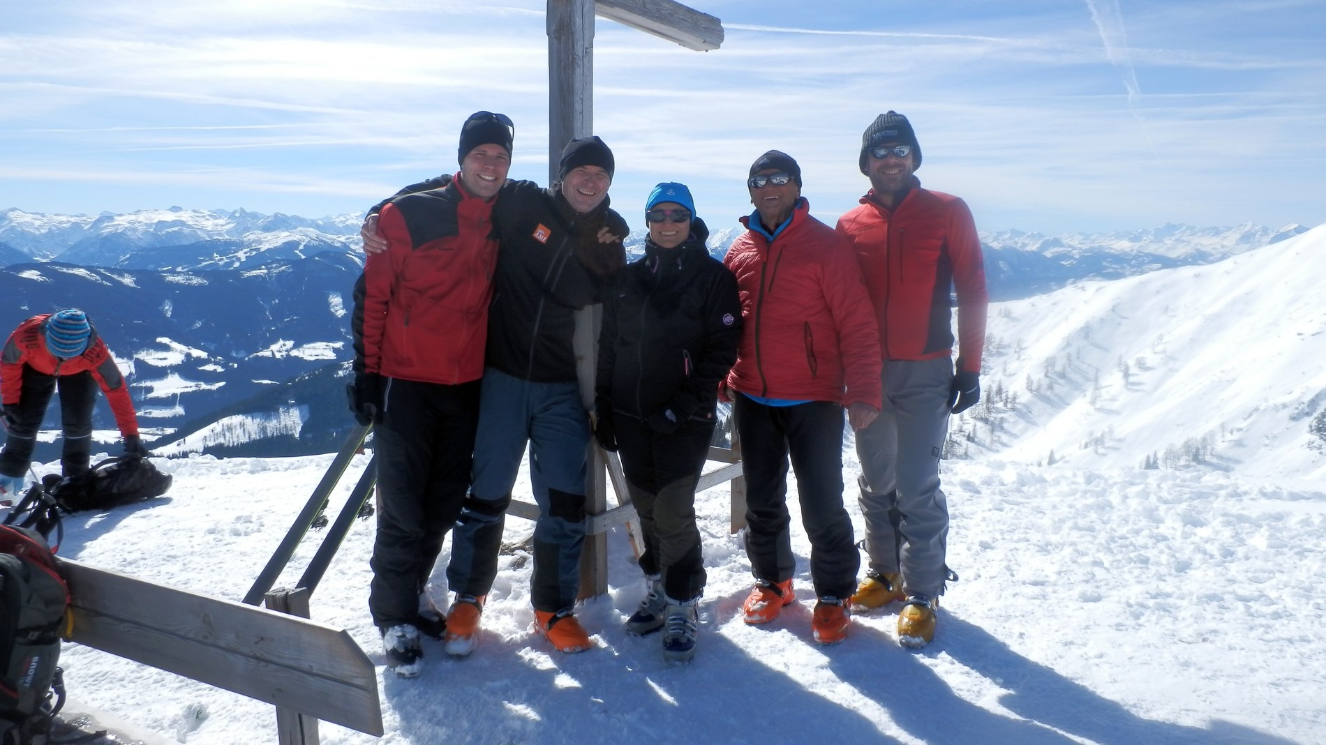 Bei schönstem Wetter starteten wir oberhalb des Walchsees. Über größtenteils freies Gelände, unterbrochen von kurzen Waldpassagen mit einzelnen steileren Abschnitten, führt die Route zur Hageralm, von wo aus der Gipfel bereits zu sehen ist. Die letzen Abschnitte, zunächst in den Sattel und dann über den Rücken zum Gipfel, gestalteten sich wegen der harten und eisigen Spur schwieriger, wurden aber trotzdem von allen gut gemeistert.