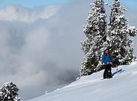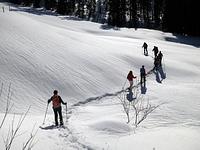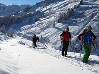 Daß das Seehorn ein beliebter Skiberg ist, merkt man spätestens dann, wenn man für den Bus einen noch freien Stellplatz auf dem nicht zu kleinen Parkplatz sucht. Zunächst führt die Route vermeintlich gemächlich auf der Forststraße nach Kallbrunn. Allerdings sind bis hierher bereits 500 Hm zu gehen. Über die Westhänge, anfangs noch durch lichten Wald, später über coupiertes Gelände stiegen wir zum Gipfel. Für die Abfahrt wählten wir die etwas nördlich gelegenen Rinnen, wo der Schnee nicht so stark zusammengefahren war und wir noch Tiefschnee fanden.