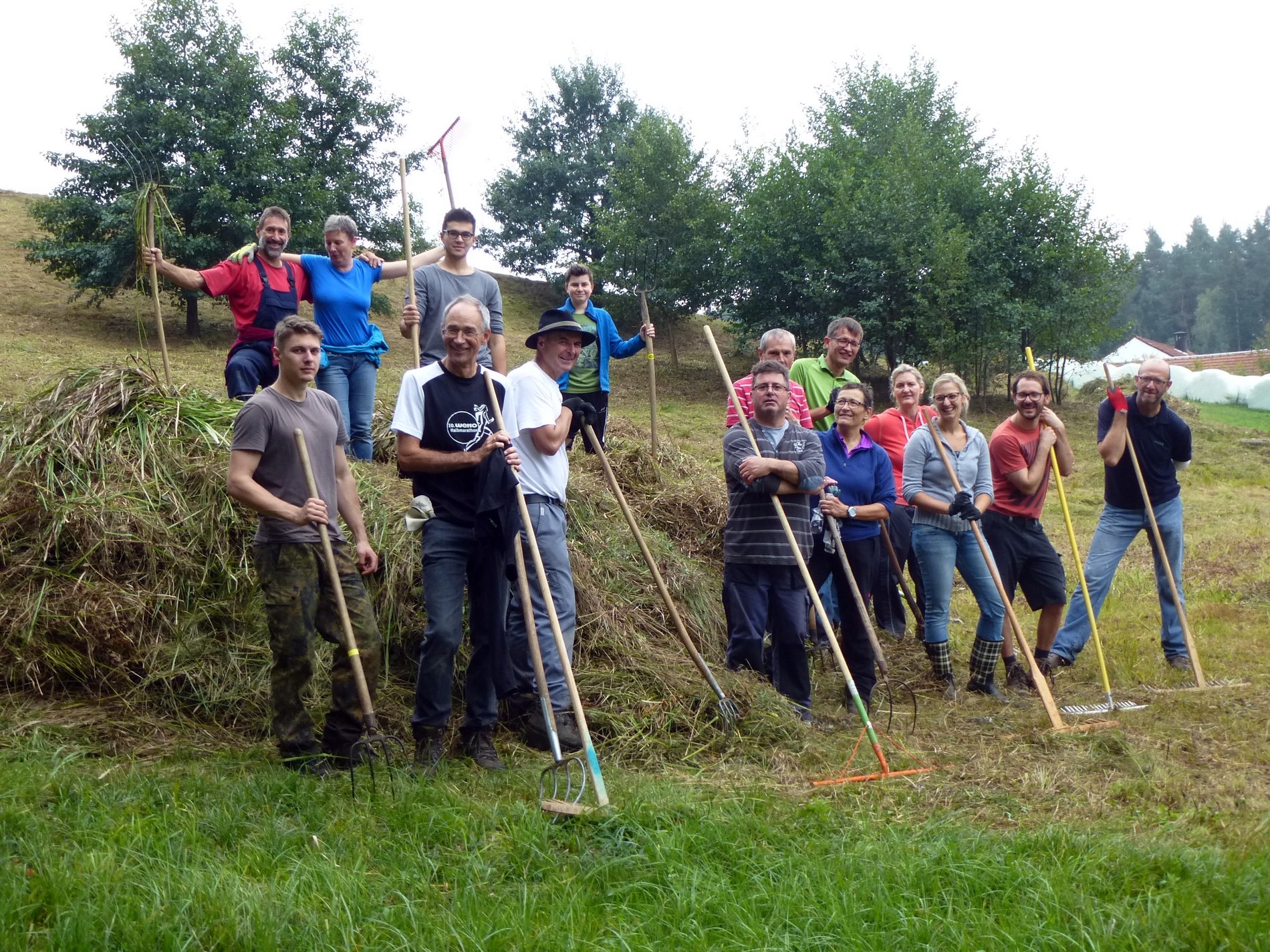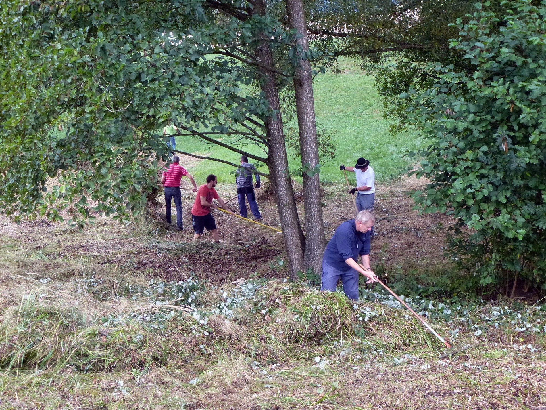 Über mehrere Tage hinweg wurde mit Balkenmäher und Motorsense vorab gemäht. Am Samstag, den 26. September wurde von zahlreichen freiwilligen Helfern das Schnittgut mit Rechen und Gabeln an den Rand der Feuchtfläche getragen und zum Abtransport gelagert.