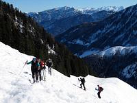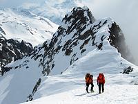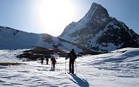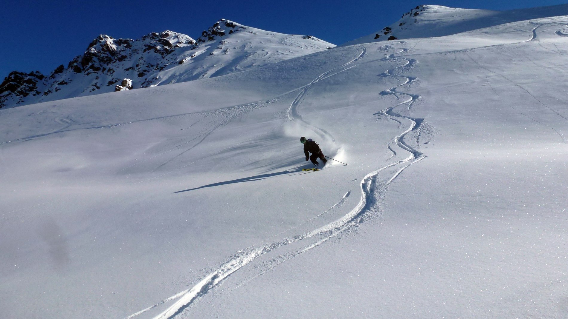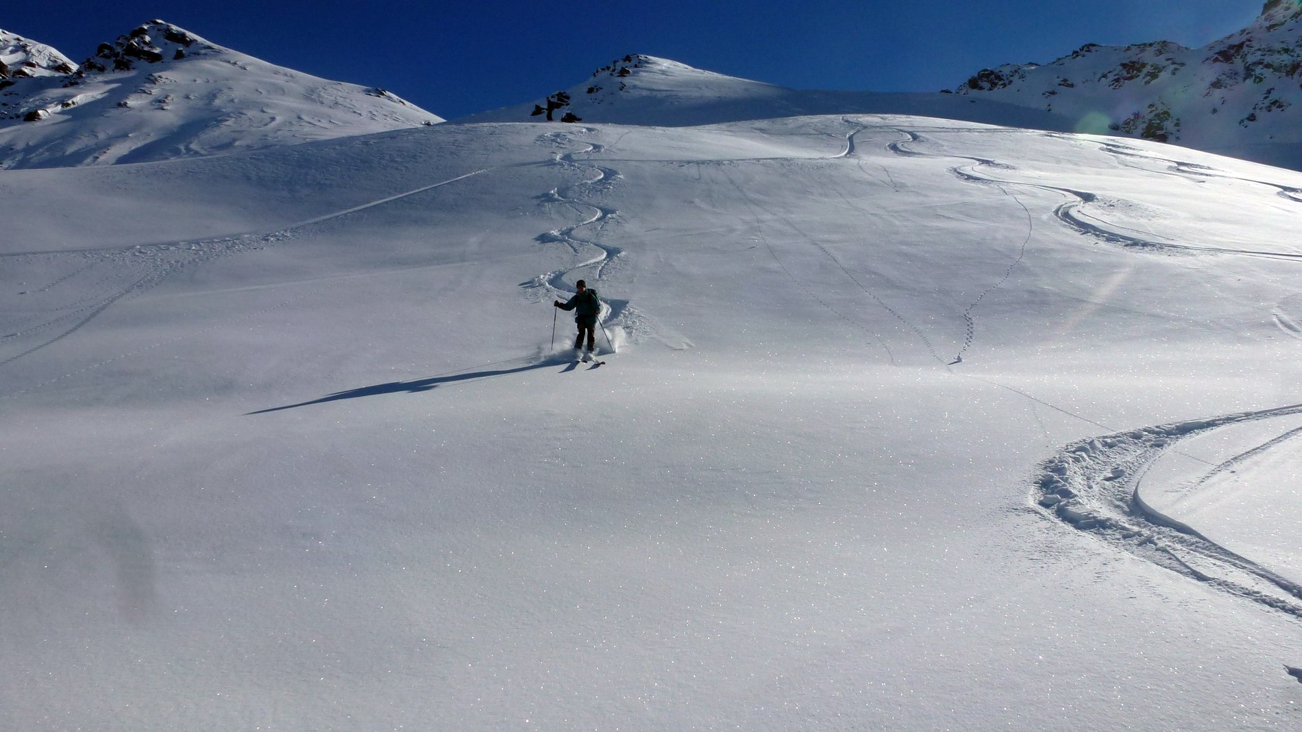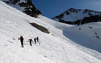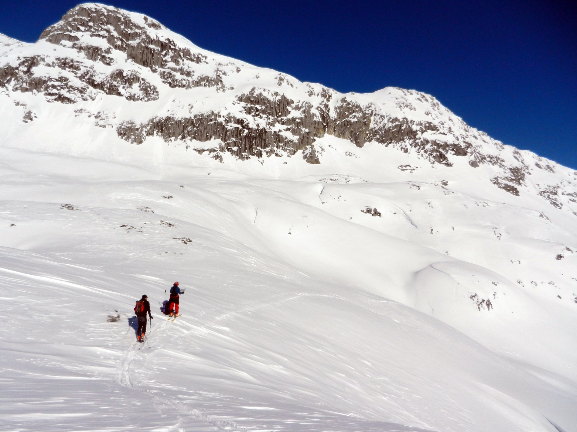In diesem Jahr haben wir uns ein ganz besonderes Tourengebiet südlich des Berninapasses ausgesucht. Von unserem Stützpunkt aus, dem Refugio Saoseo, führte uns der erste Tourentag auf den Gipfel des Corn da Camp (3 232 m). Nach einem traumhaften Aufstieg über das Val Mera und die Reste des Gletschers Vedreit da Camp zum Skidepot kletterten wir mit Steigeisen und Pickel auf den Gipfel des Klassikers. Für die Abfahrt wählten wir das Scispadus Tal, in das wir durch eine Anfangs steile Rinne einfuhren. Die weiten Hänge boten uns einen wahren Abfahrtsgenuß.
