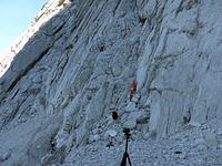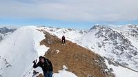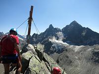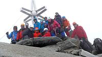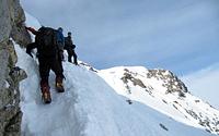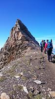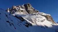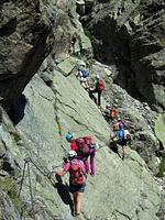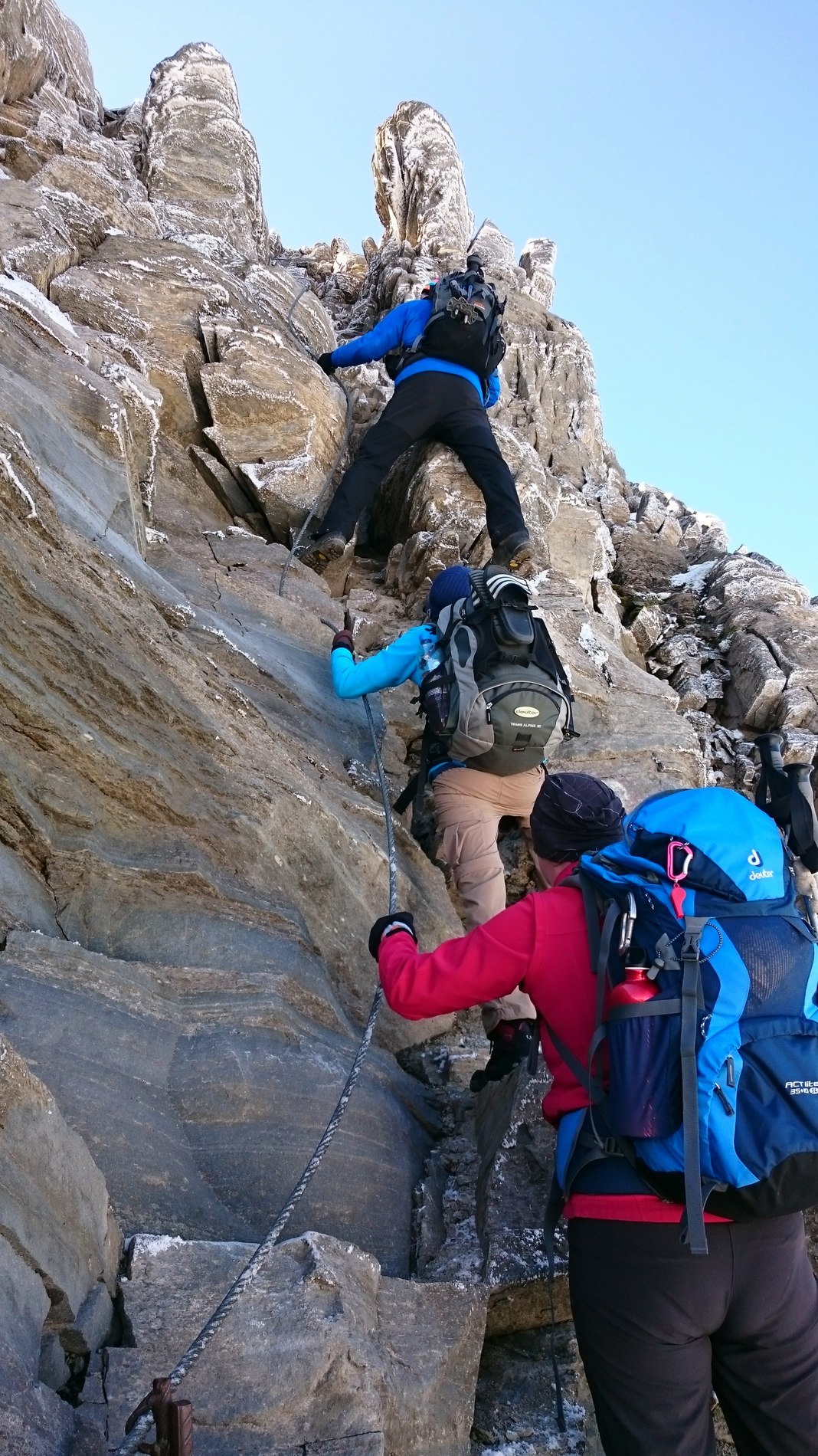 Der weitere Weg ging teilweise am Grat entlang zum Kleinen Muntanitz (3 192 m). Der Abstieg dahinter war die Schlüsselstelle. Eine fast senkrechte Blockkletterei (II) mit Seilversicherung war auf der Nordseite abzuklettern und dies noch leicht angefroren. Hier war jeder gefordert und voll konzentriert bei der Sache. Alles Weitere war wieder eine schöne Bergwanderung auf den Großen Muntanitz (3 232 m). Begleitet wurden wir im Osten vom Großglockner und im Westen vom Großvenediger. Im Süden waren die Lienzer Dolomiten erkennbar. Ein Aussichtsplatz vom Feinsten.
