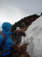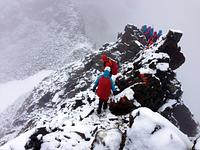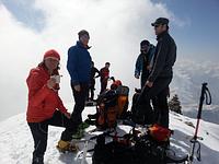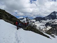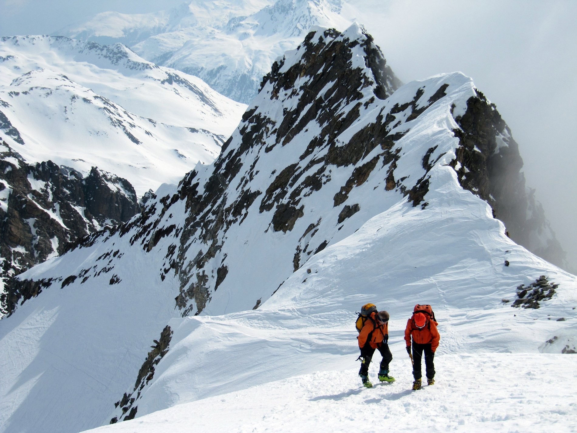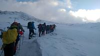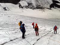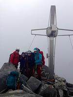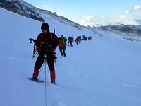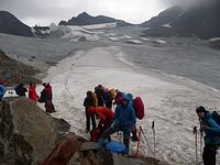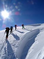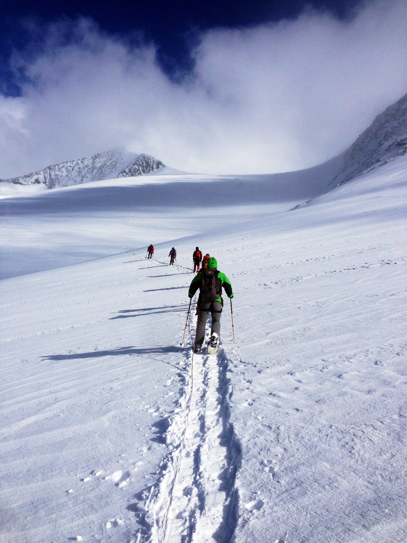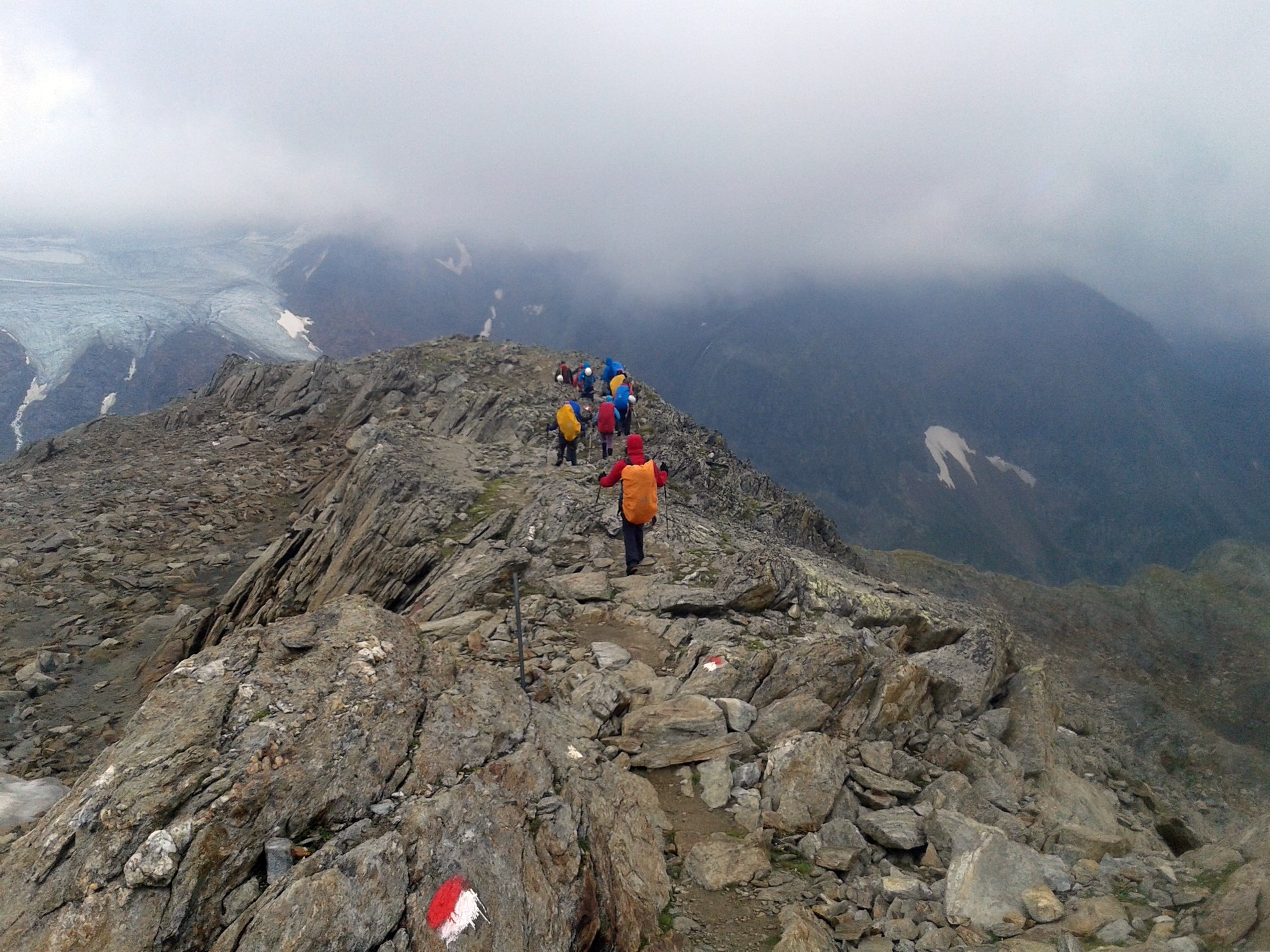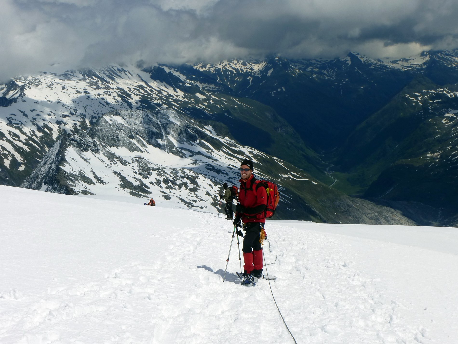 Zudem hatten wir die ganze Nacht einen Höhensturm, der genügend Neuschnee ablud und wir am nächsten Tag auf der Sommerroute nicht auf das Innere Mulwitzkees absteigen konnten. Somit sind wir der Skitourenroute gefolgt. Der Höhensturm brachte immer noch Schnee, der uns wie Nadeln im Gesicht traf. Vorbei am „Rainerhorn“ und „Hohes Aderl“ erreichten wir um die Mittagszeit mit Sonne und Nebel das Ziel „Großvenediger“ (3 660 m). Der Abstieg der vier Seilschaften führte am Rande des Schlatenkees zur Neuen Prager Hütte. Ab hier konnten wir, zurückschauend auf den Gipfel, die Hochtourenaspiranten beglückwünschen.