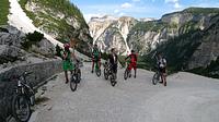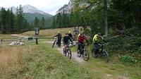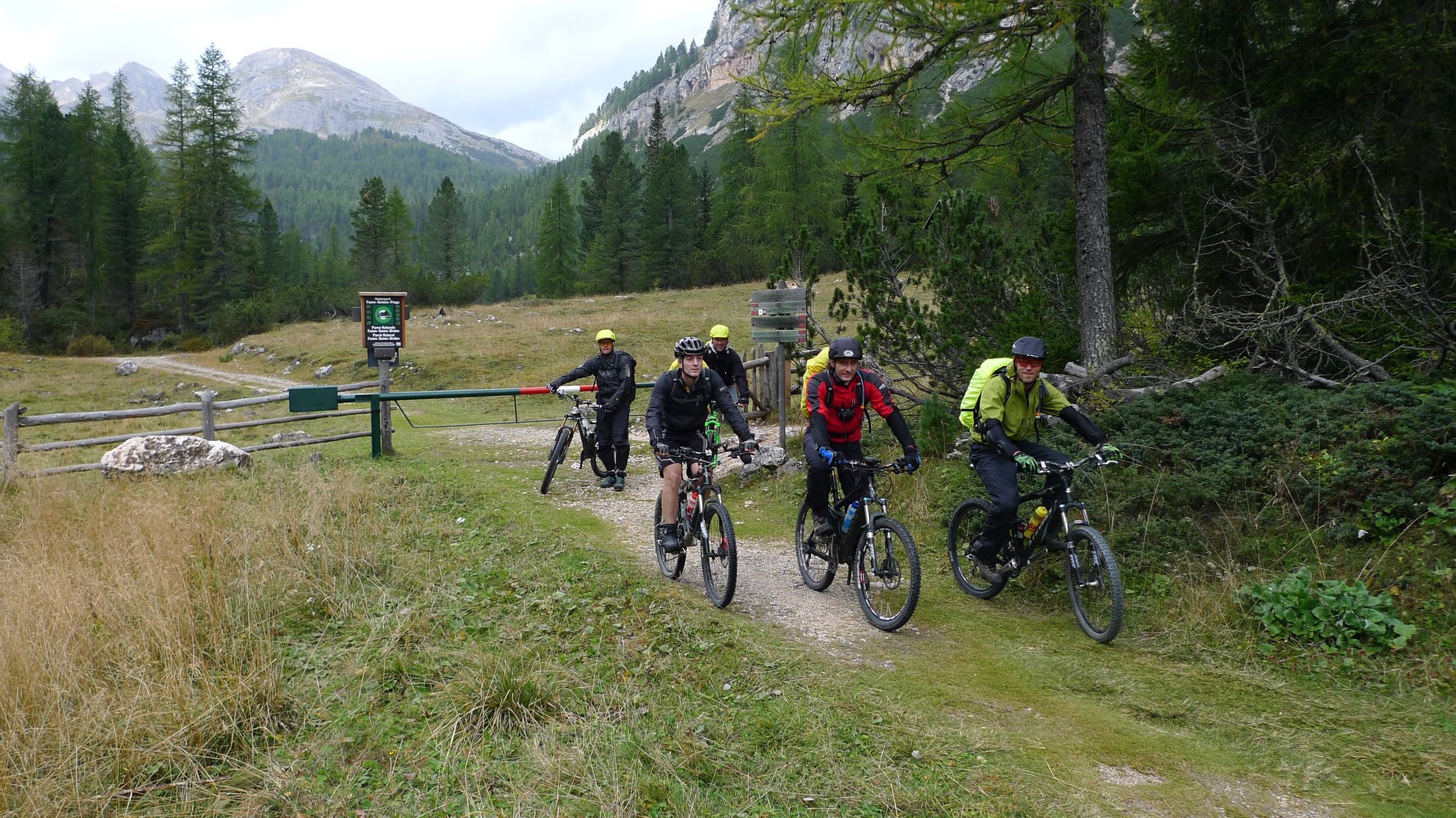 Am letzten Tag stand zunächst der Anstieg auf die Pralongia (2 139 m) auf dem Programm. Die anschließende Abfahrt nach St. Kassian haben wir uns redlich verdient, im Gegensatz zu einer Horde Seilbahn-Radler. Für die Mittagsrast war das Heiligkreuz-Schutzhaus anvisiert. Auf dem 550 Hm langen Anstieg ist man zwar nicht ohne schieben ausgekommen, er ist es aber auf alle Fälle wert gewesen. Nach der Mittagspause auf der Hütte machten wir uns auf den Weiterweg über schöne aber leider teilweise recht nasse und schlammige Wege, zuerst ins Wengental und dann weiter über eine sich hinziehende Forststraße das letzte Mal bis auf 2 100 m. Und das letzte Mal über knackige Trails wieder hinunter ins Rautal, wo wir gestartet waren, vor drei Tagen, 184 km und 7 700 Hm.