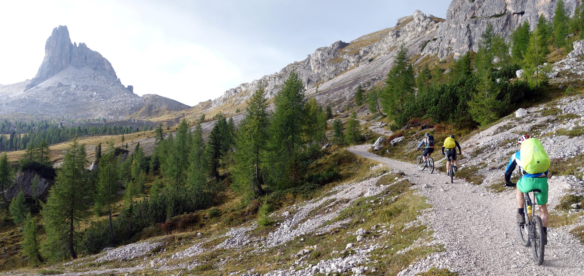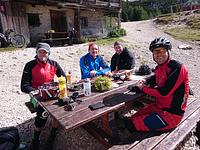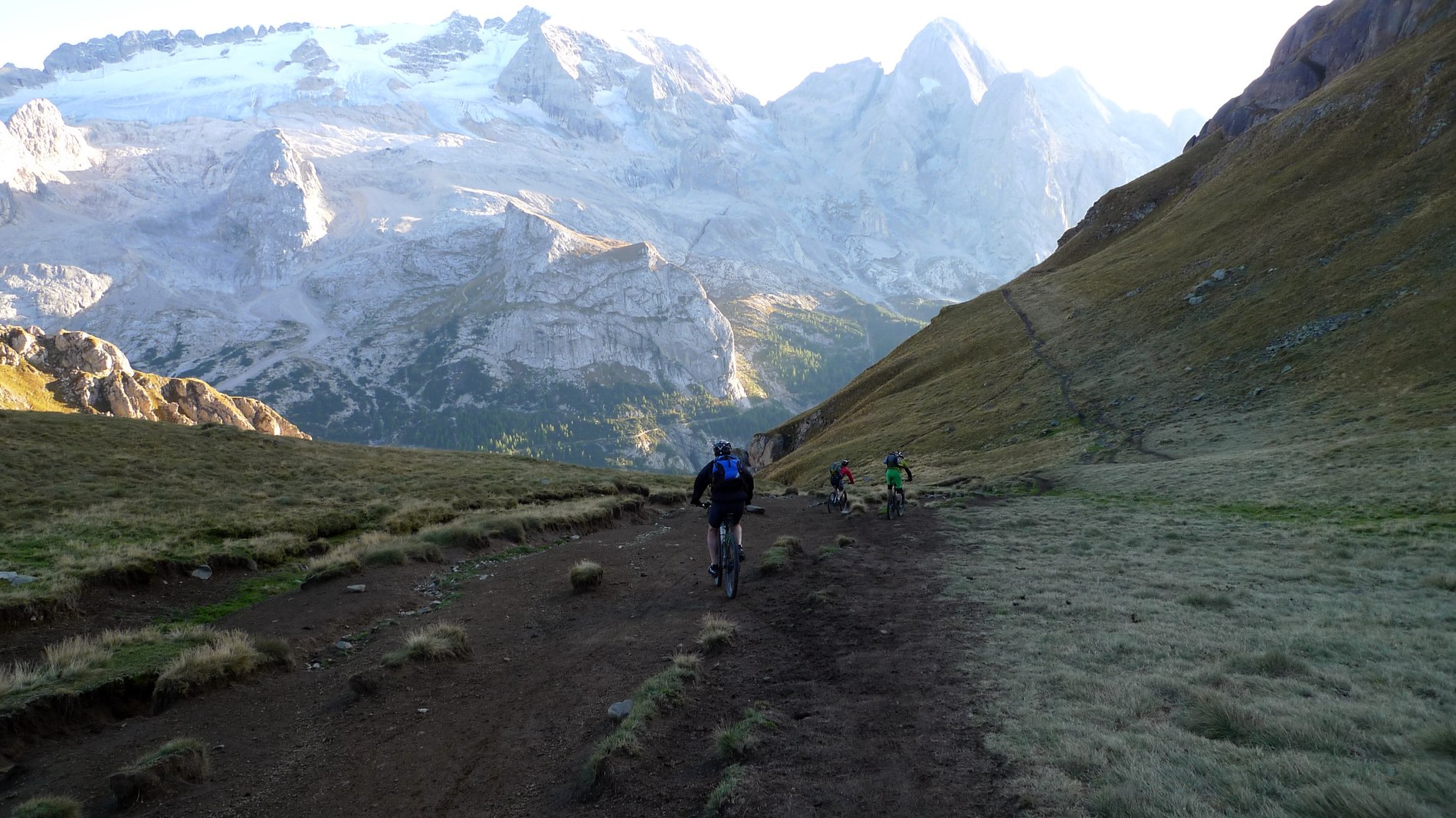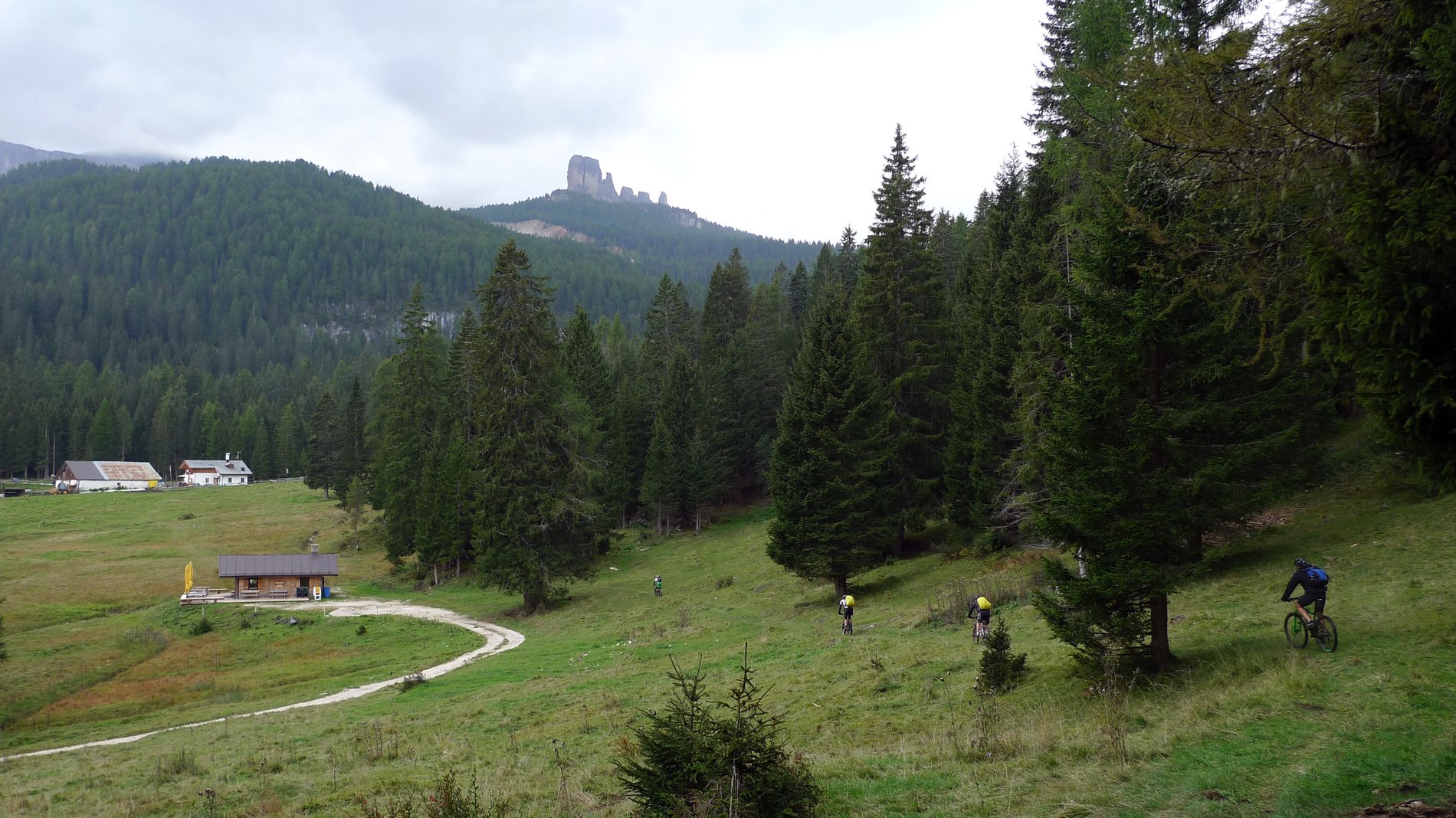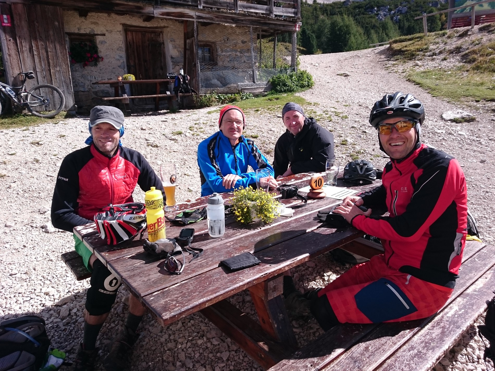 Die Forcella Ambrizola (2 277 m) war am Freitag schnell erreicht, keine 200 Hm unterm zweiten Quartier. Aber zunächst stand die lange, technisch und konditionell anspruchsvolle Abfahrt bis nach Alleghe auf dem Programm. Die Sonne kam zweitweise zum Vorschein, also machten wir es uns zum Mittagessen bei Lasagne & Co. auf einer Terrasse am See gemütlich. Gemächlich fuhren wir zunächst 15 km auf der asphaltierten Straße weiter, bevor es anfangs über unfahrbar steile Fahrwege und später durchs Skigebiet auf die Porta Vescovo (2 470 m) hinaufging, wo uns ein eisiger Wind gleich weitertrieb. Über den Bindelweg mit herrlichen Ausblicken hinüber zur Marmolada konnten wir fast durchgehend bis zur Bindelweghütte, unserem Quartier, fahren.
