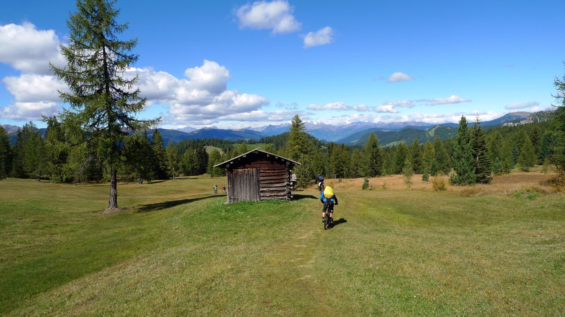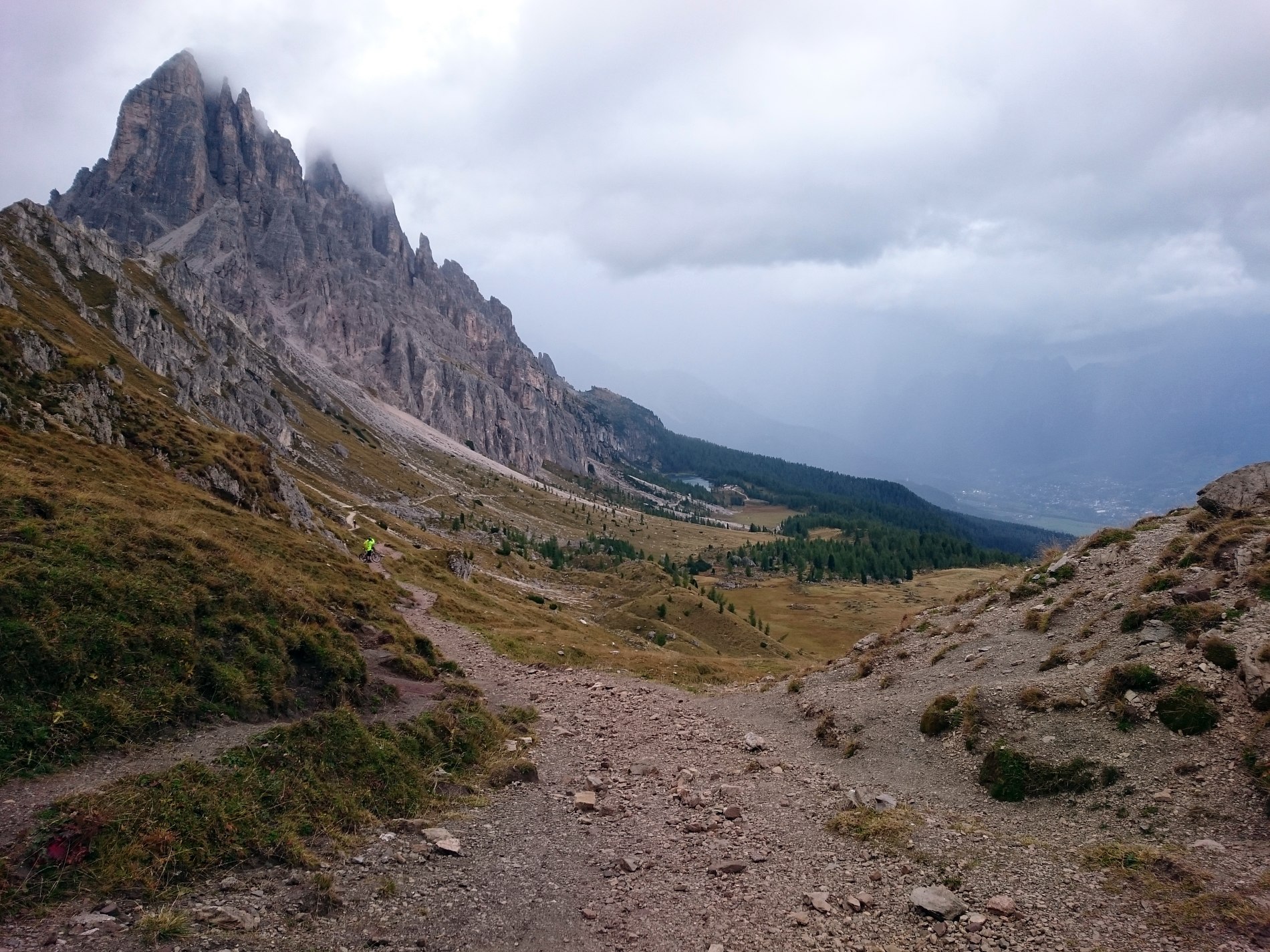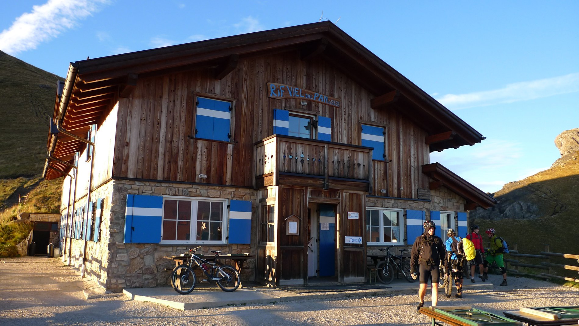 Die Forcella Ambrizola (2 277 m) war am Freitag schnell erreicht, keine 200 Hm unterm zweiten Quartier. Aber zunächst stand die lange, technisch und konditionell anspruchsvolle Abfahrt bis nach Alleghe auf dem Programm. Die Sonne kam zweitweise zum Vorschein, also machten wir es uns zum Mittagessen bei Lasagne & Co. auf einer Terrasse am See gemütlich. Gemächlich fuhren wir zunächst 15 km auf der asphaltierten Straße weiter, bevor es anfangs über unfahrbar steile Fahrwege und später durchs Skigebiet auf die Porta Vescovo (2 470 m) hinaufging, wo uns ein eisiger Wind gleich weitertrieb. Über den Bindelweg mit herrlichen Ausblicken hinüber zur Marmolada konnten wir fast durchgehend bis zur Bindelweghütte, unserem Quartier, fahren.