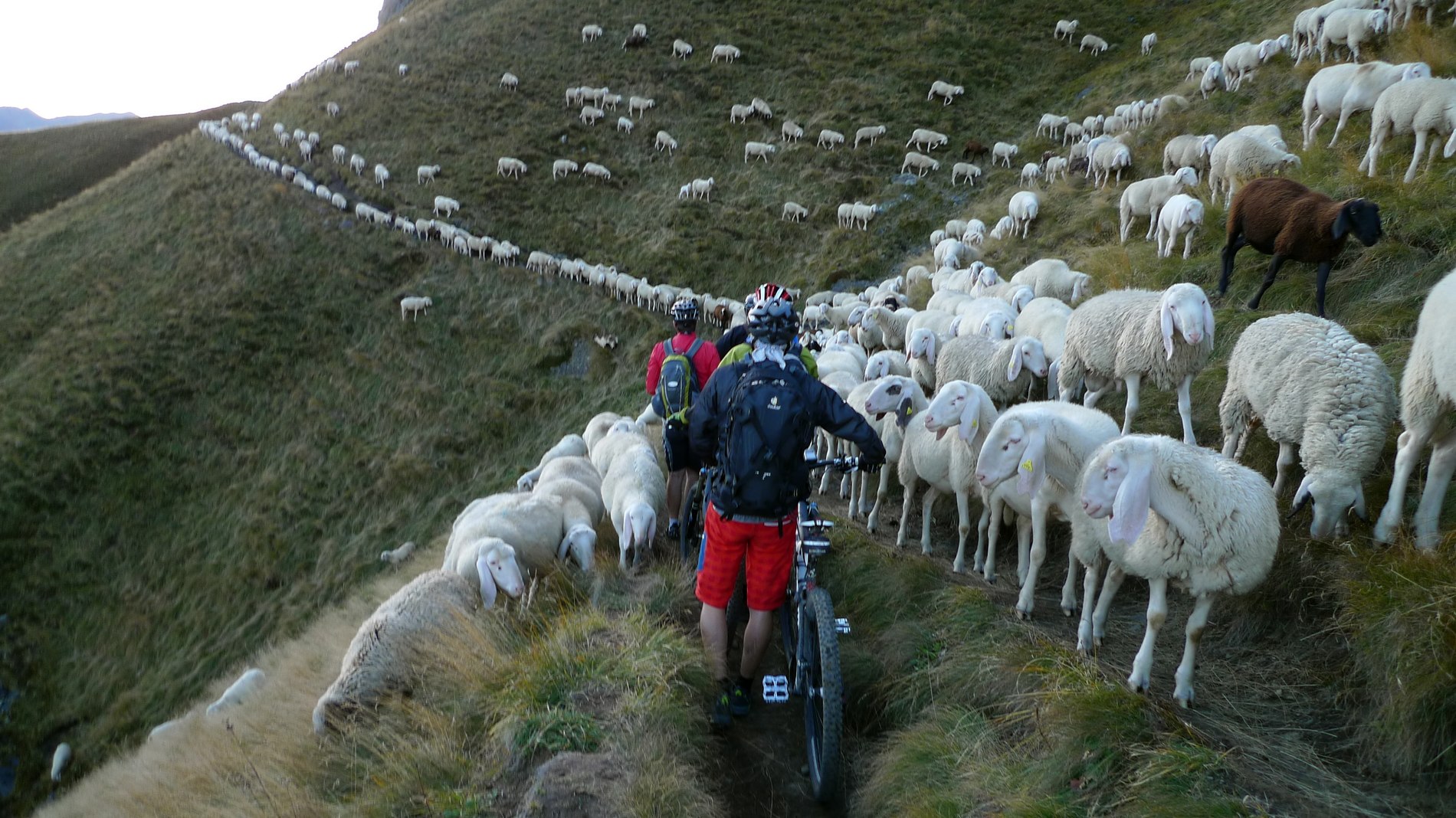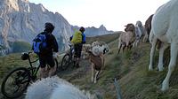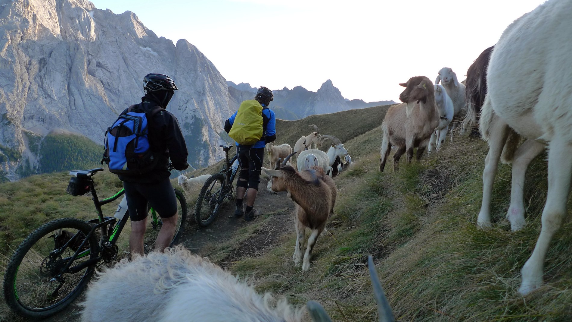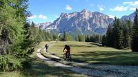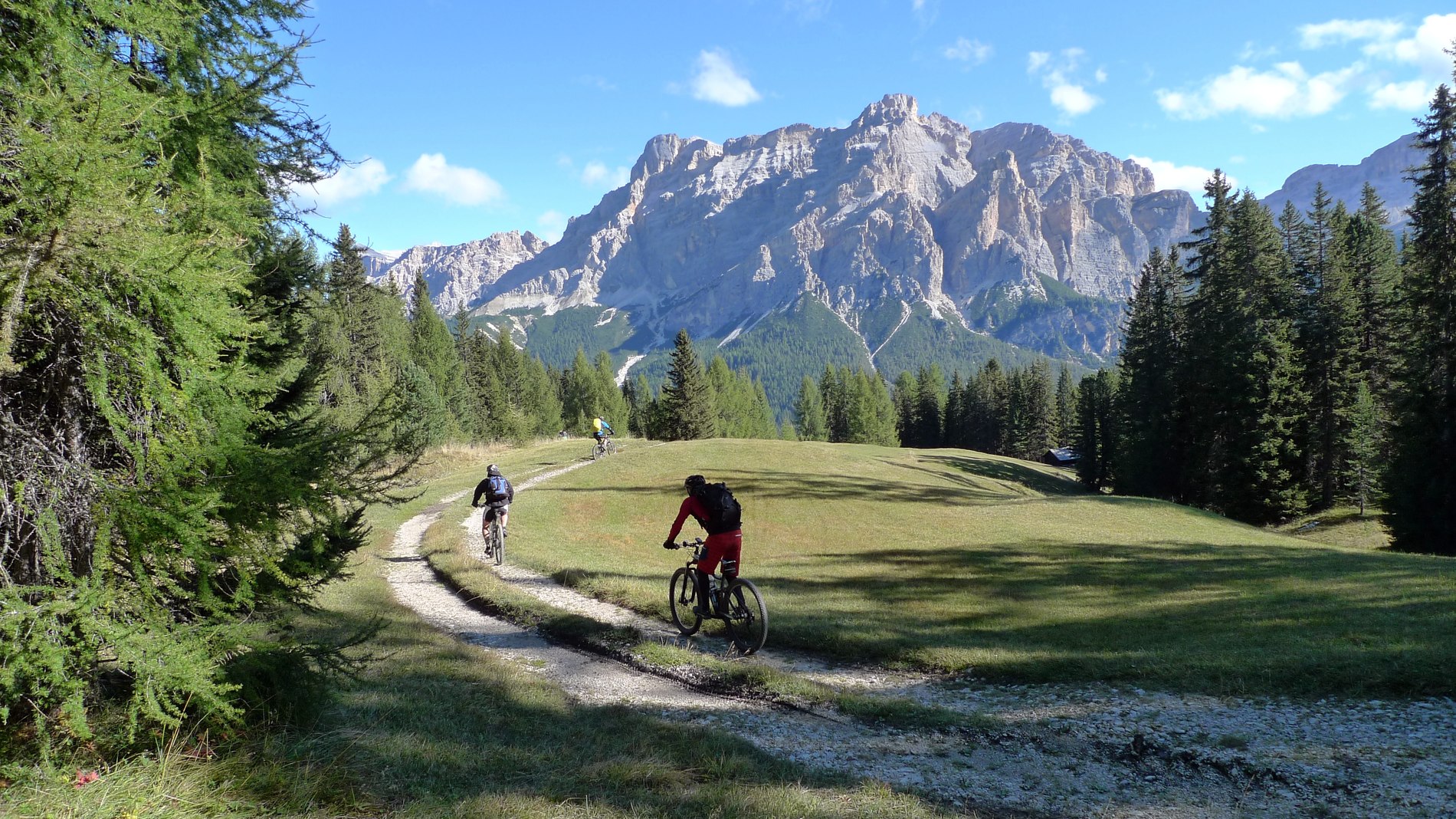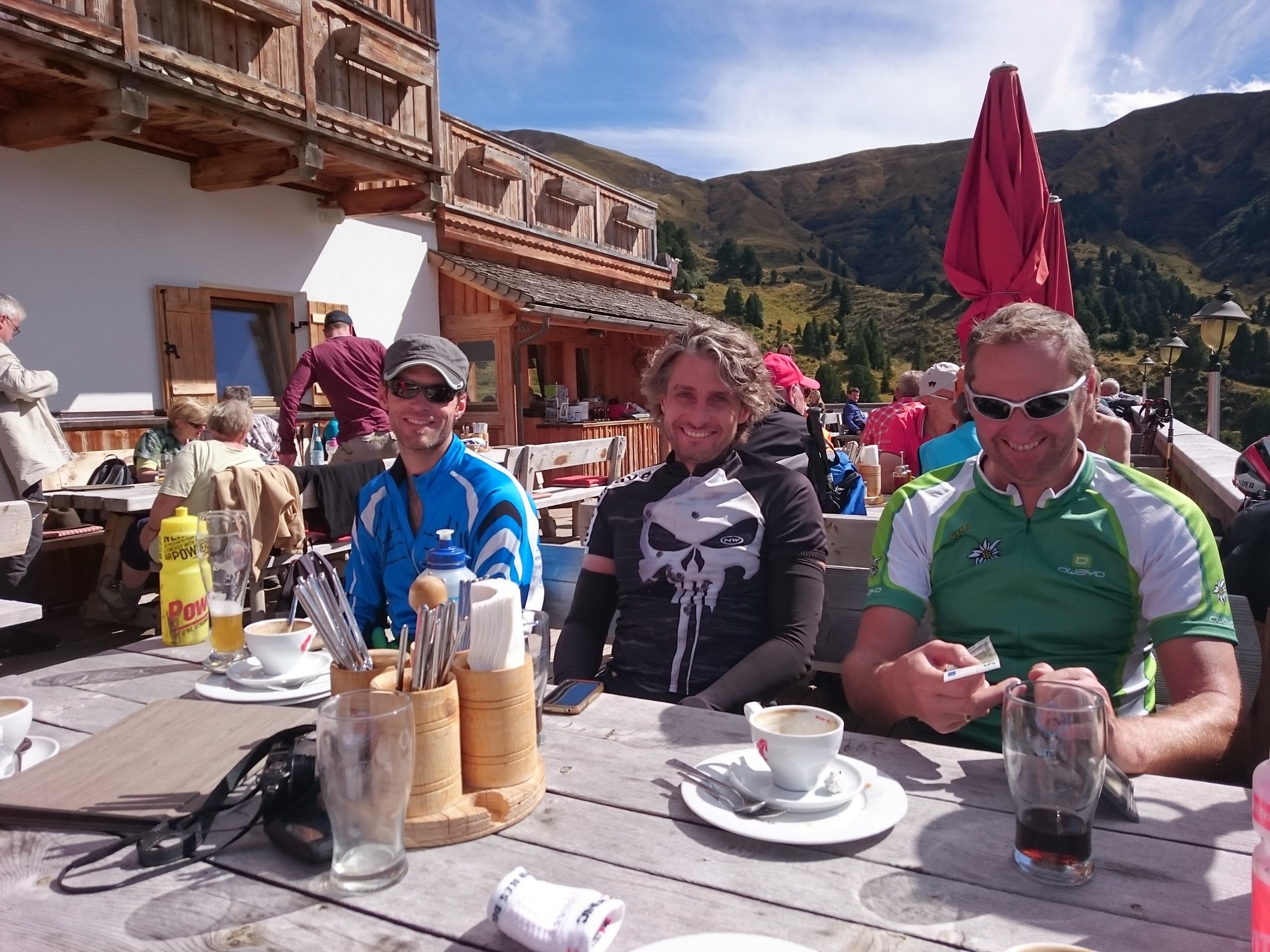Die Forcella Ambrizola (2 277 m) war am Freitag schnell erreicht, keine 200 Hm unterm zweiten Quartier. Aber zunächst stand die lange, technisch und konditionell anspruchsvolle Abfahrt bis nach Alleghe auf dem Programm. Die Sonne kam zweitweise zum Vorschein, also machten wir es uns zum Mittagessen bei Lasagne & Co. auf einer Terrasse am See gemütlich. Gemächlich fuhren wir zunächst 15 km auf der asphaltierten Straße weiter, bevor es anfangs über unfahrbar steile Fahrwege und später durchs Skigebiet auf die Porta Vescovo (2 470 m) hinaufging, wo uns ein eisiger Wind gleich weitertrieb. Über den Bindelweg mit herrlichen Ausblicken hinüber zur Marmolada konnten wir fast durchgehend bis zur Bindelweghütte, unserem Quartier, fahren.