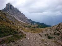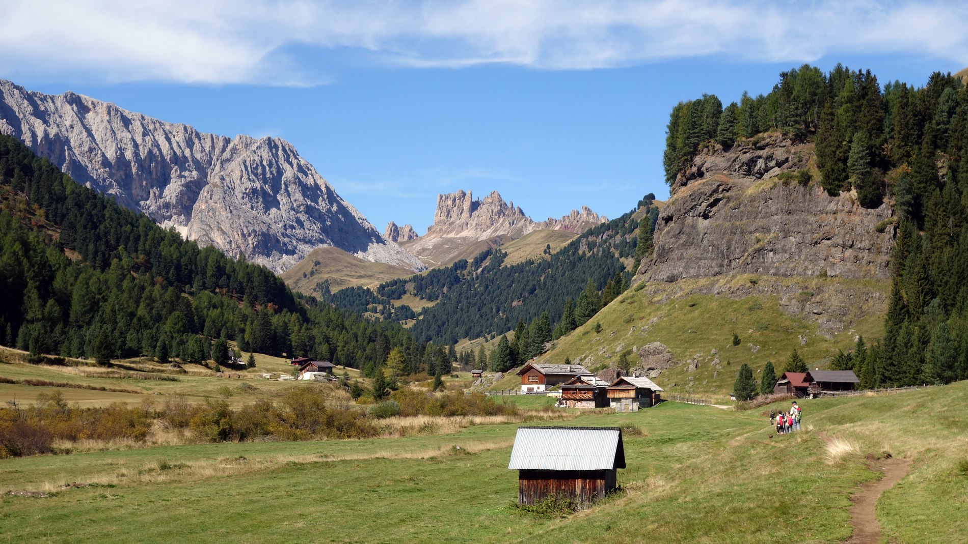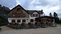 Am ersten Tag stand zunächst die Durchquerung der Fanesgruppe auf dem Programm. Beim Start hatten wir noch auf schönes und trockenes Wetter gehofft, aber die Wolken wurden immer dichter und kurz vor dem Limojoch auf 2 170 m begann es zu nieseln, zwar anhaltend, aber nie wirklich stark. Mit teilweise heftigen Anstiegen ging’s weiter hoch oben an Cortina vorbei und wieder hinunter bis auf 1 500 m. Nach einer kleinen Brotzeit und etwas Wegsuchen machten wir uns auf zur Rifugio Croda da Lago am Lago di Fedara (2 046 m), wo wir rechtzeitig ankamen, um vor dem Abendessen noch kurz in den See zu springen oder auch warm zu duschen.