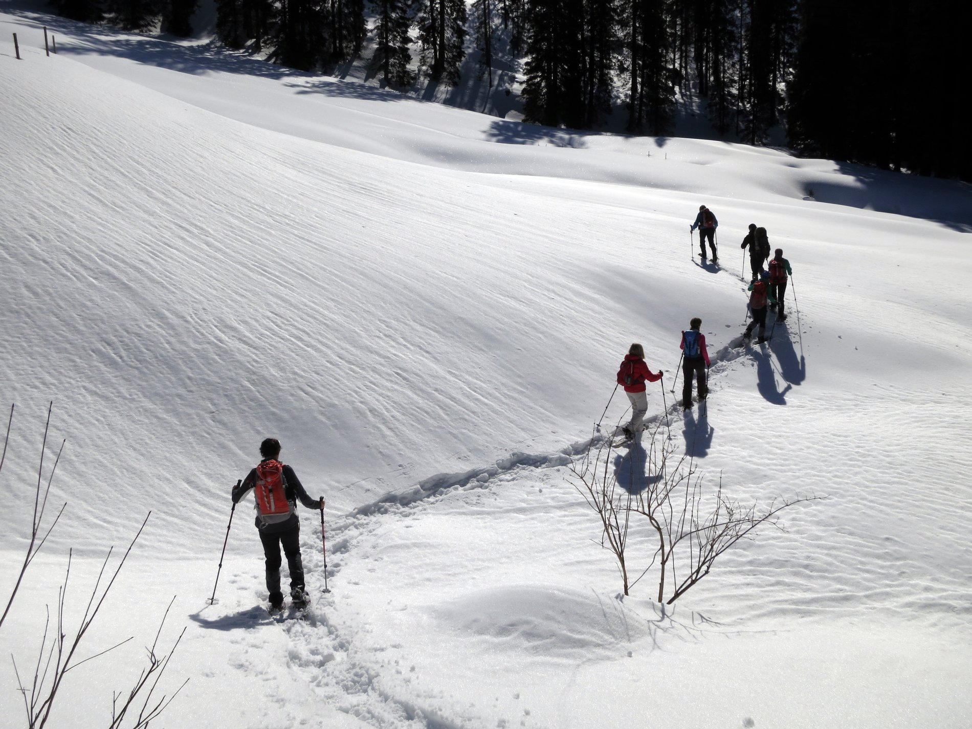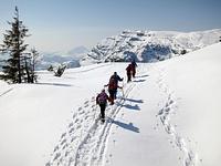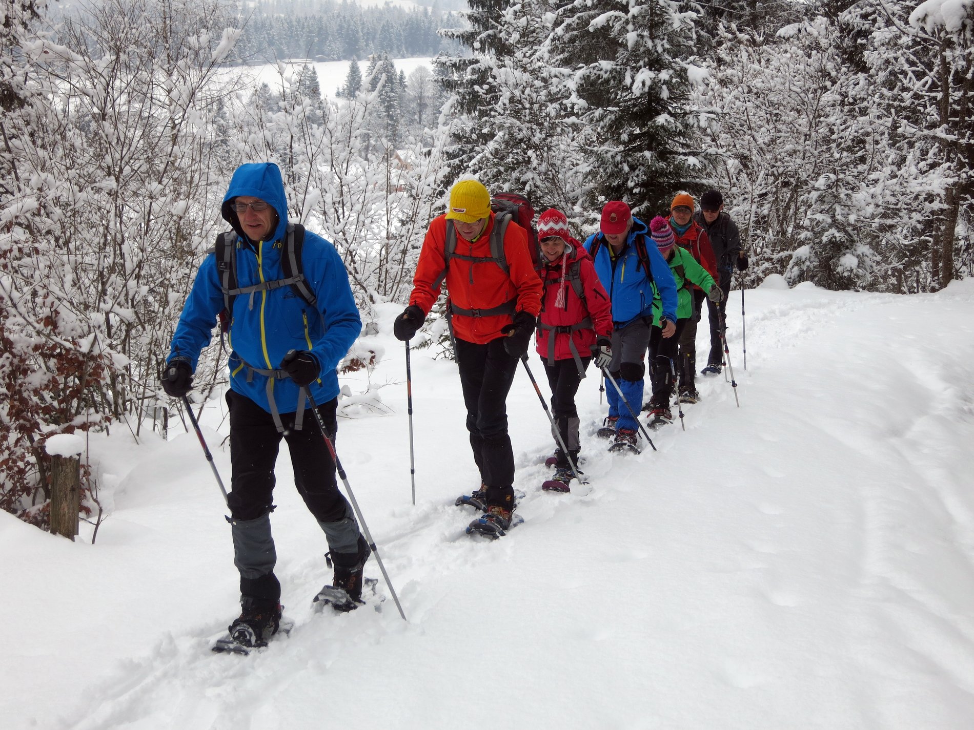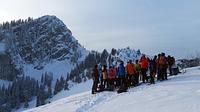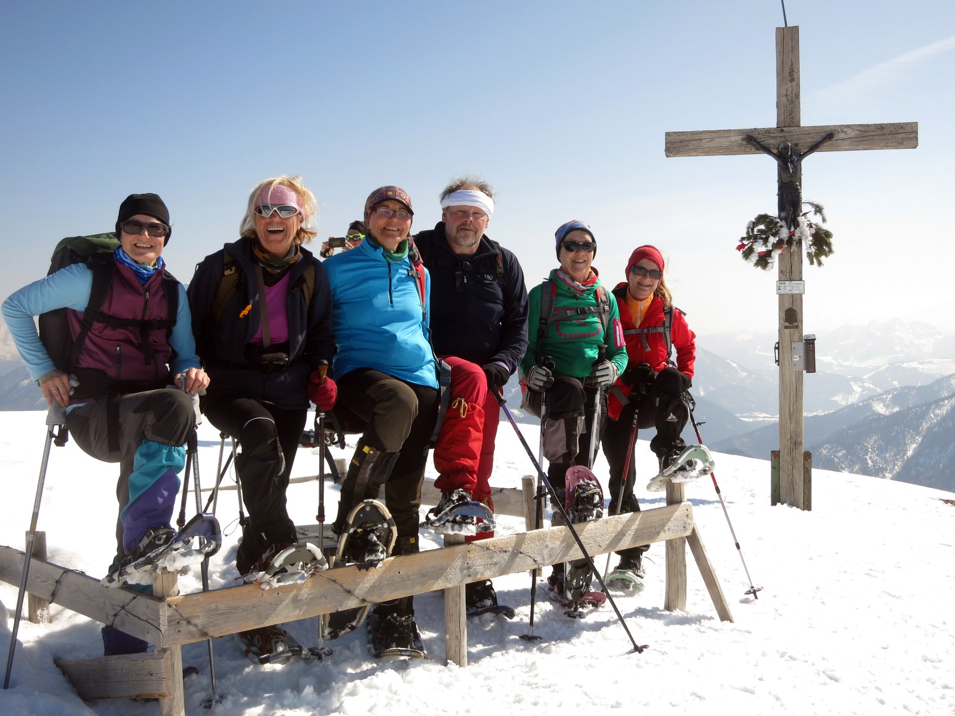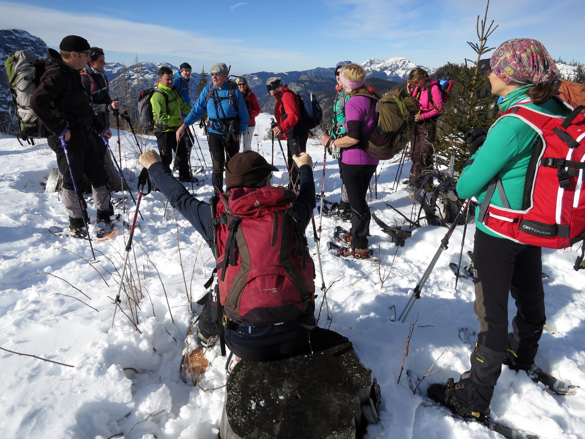 Diese vielleicht ein wenig andere Schneeschuhtour konnten wir bei besten Witterungsbedingungen durchführen. Eine Querung auf schmalem Band unter einer Felswand verlangte den sicheren Geher. Danach genossen wir einsames und unschwieriges Almgelände. Über einen etwas steileren Hang erreichten wir den Feuerspitz (1 575 m). Nach einem kurzen Anstieg ging es zum unscheinbaren Wachterlhorn (1 475 m), von wo aus wir einen herrlichen Blick zum Hochkalter hatten. Eine Einkehr im Gasthaus Schneizlreuth rundete den schönen Bergtag ab.