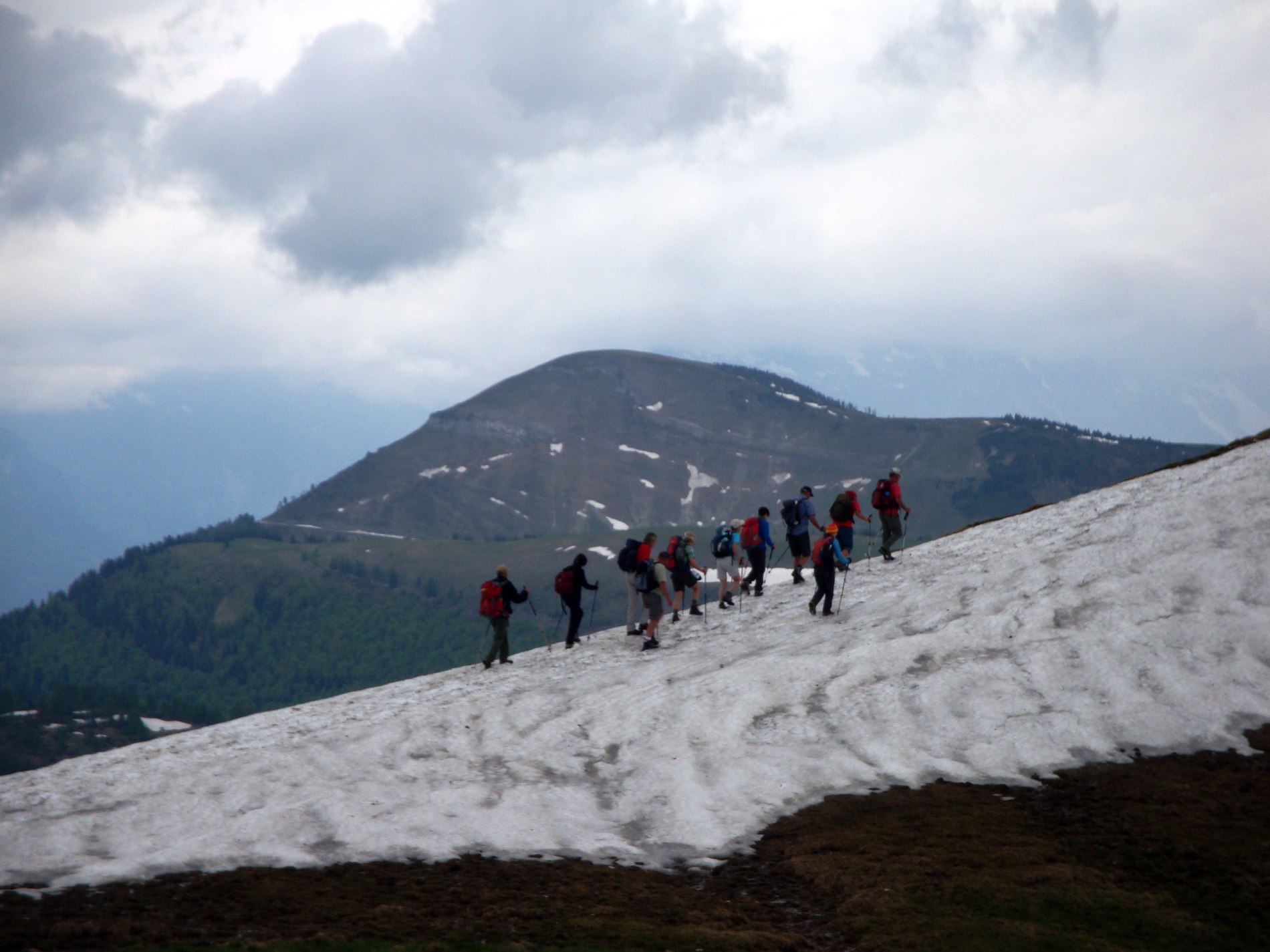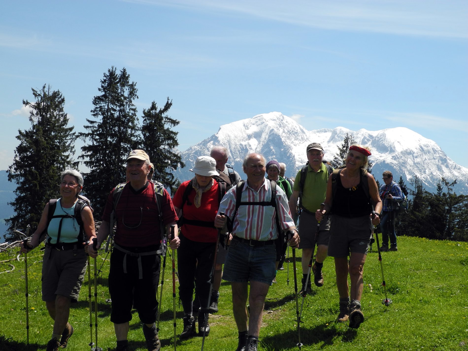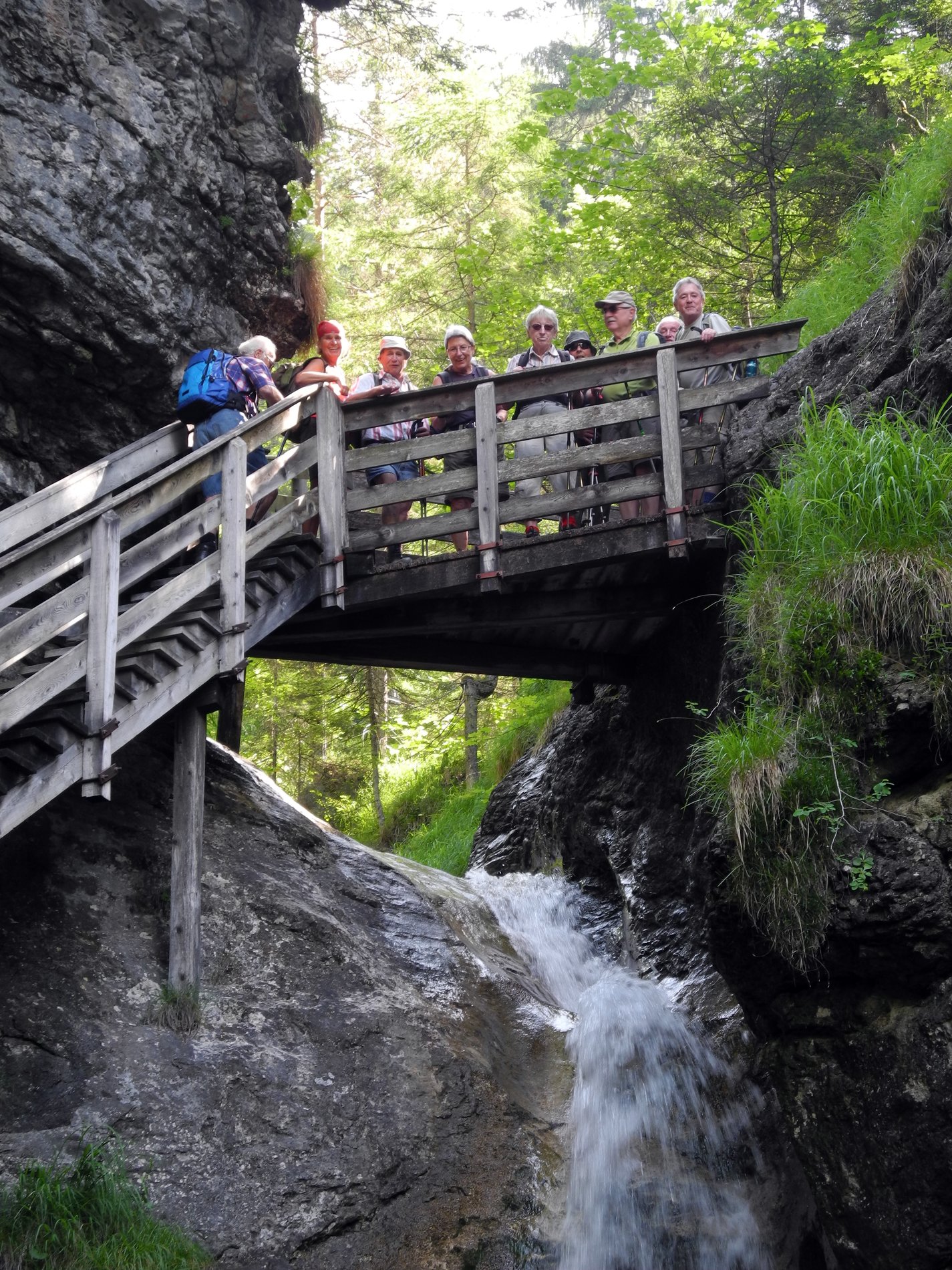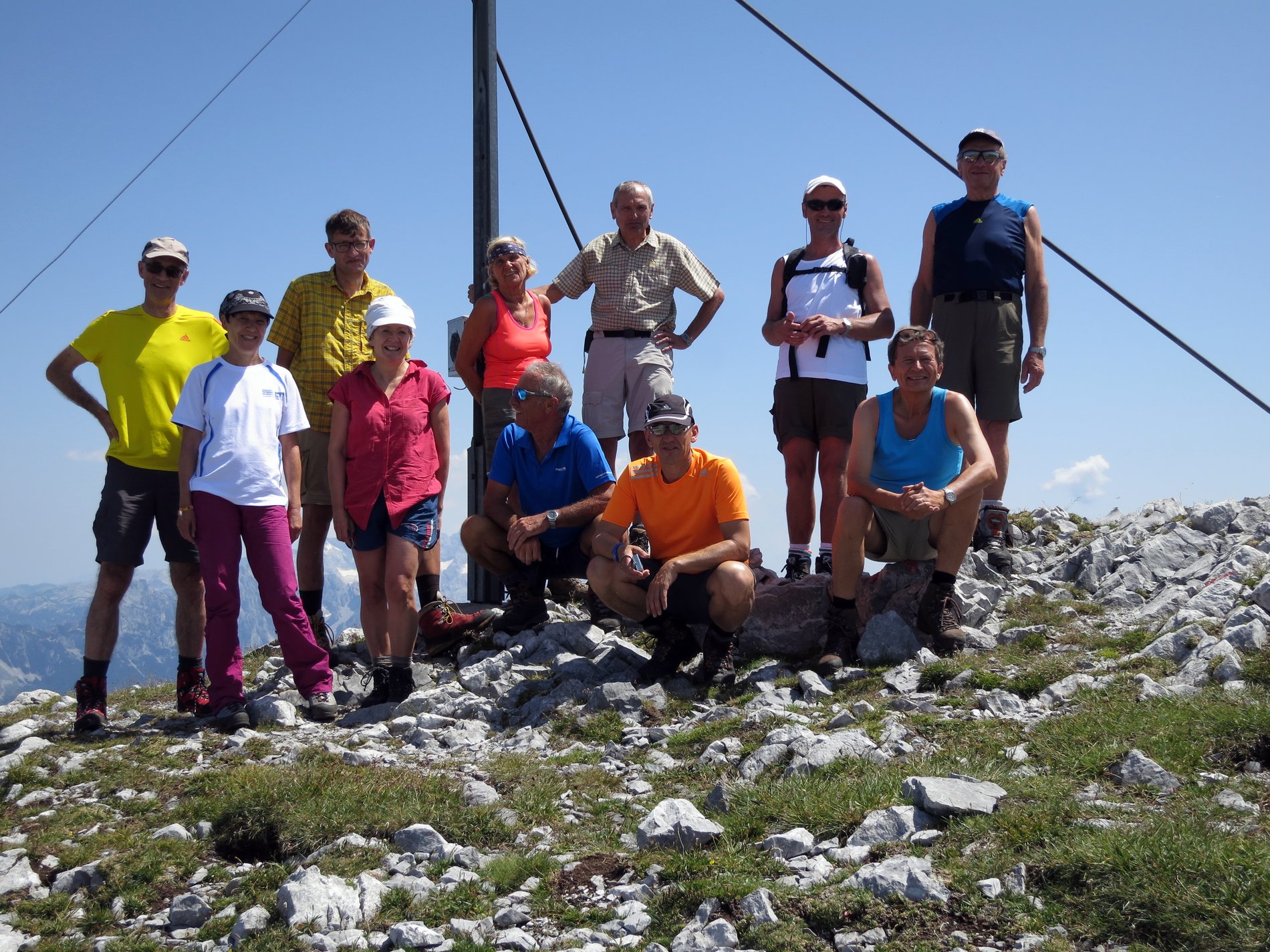 Über die Strohwollner-Schlucht, die uns angenehmen Schatten spendete, ging’s über den Ötscher zur Scheffsnothalm, wo wir Rast machten. Über den Hundsattel und einem kurzen Abstieg ging’s zum Großen Hundhorn hinauf. Bei der Gipfelbrotzeit wurde die Aussicht auf die Reiteralpe und die Loferer Steinberge genossen. Zurück über Hundsattel und Hundalm zum Pechtelhof waren alle froh, dass wir morgens hier ein Auto abgestellt hatten. So blieben uns bei der großen Hitze einige Kilometer Rückweg über die Wildenbachschlucht erspart. Eine Einkehr vor der Heimfahrt war bei diesen Temperaturen selbstverständlich.