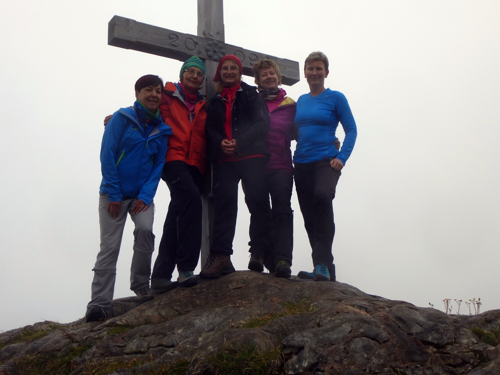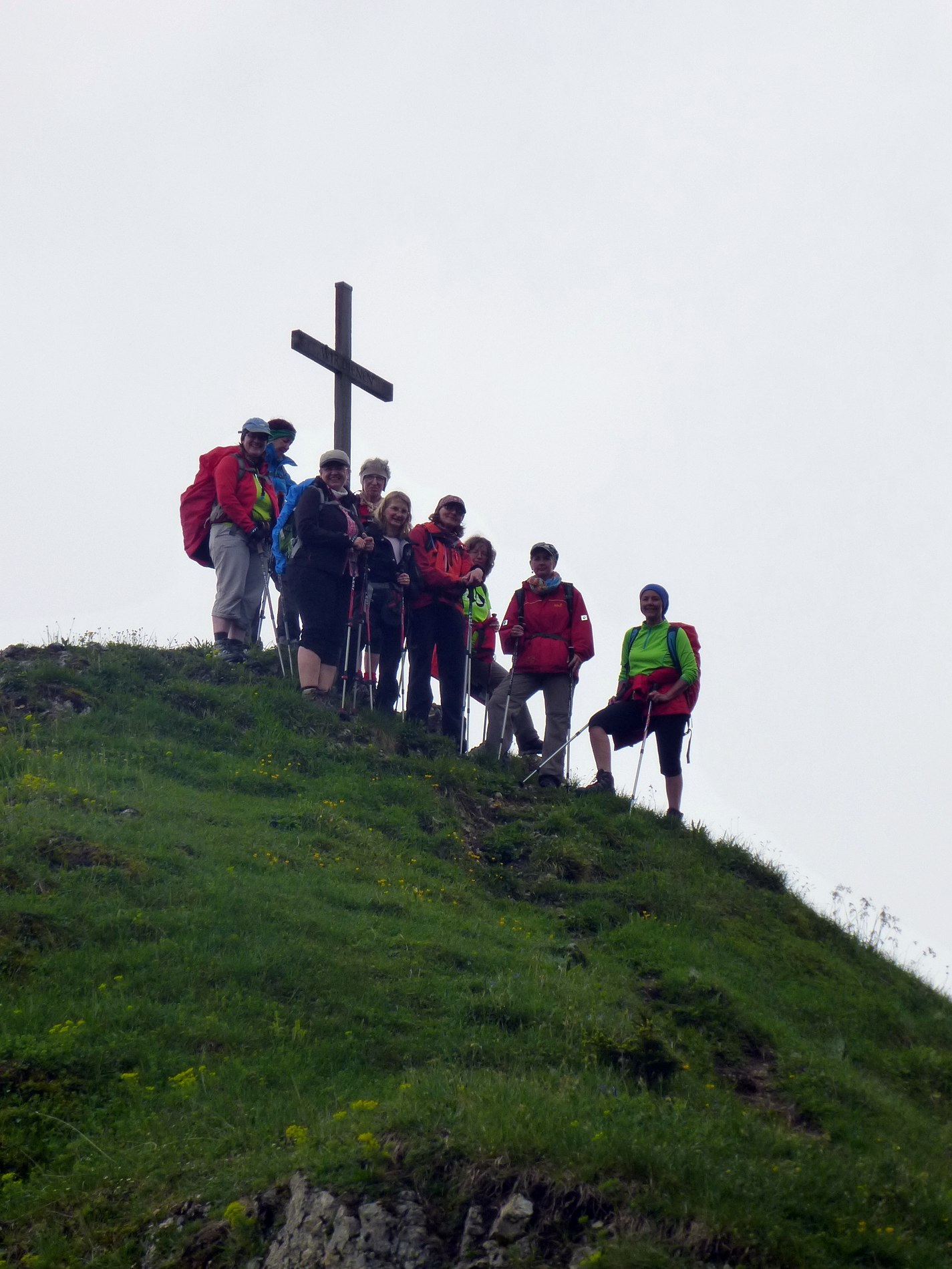 Am grauen Sonntagmorgen machten wir uns auf nach Flintsbach bei Brannenburg. Der Wanderparkplatz bei der Burgruine Falkenstein war bereits überraschend stark besucht und bei teilweise Regen und dichten Wolken wanderten wir zunächst bis zum Gasthof Hohe Asten, wo gerade eine Messe an der Kapelle gefeiert wurde. Dank dem mutigen Einsatz von Renate konnten wir dann unbeschadet ein Weidegatter passieren, das von einer kompletten Herde Kühe versperrt war. Über Almwiesen ging es bei stark eingeschränkter Sicht weiter, bis wir das kecke Felsköpferl des Großen Rehleitenkopfs erreichten. Die Wolken hatten sich inzwischen ein wenig gelichtet und ermöglichten uns eine ausgiebige Rast unweit des Gipfels. Im Abstieg gönnten wir uns im Gasthof eine schöne Pause und machten dann noch einen Abstecher zum Petersberg mit seiner hübschen romanischen Kirche.