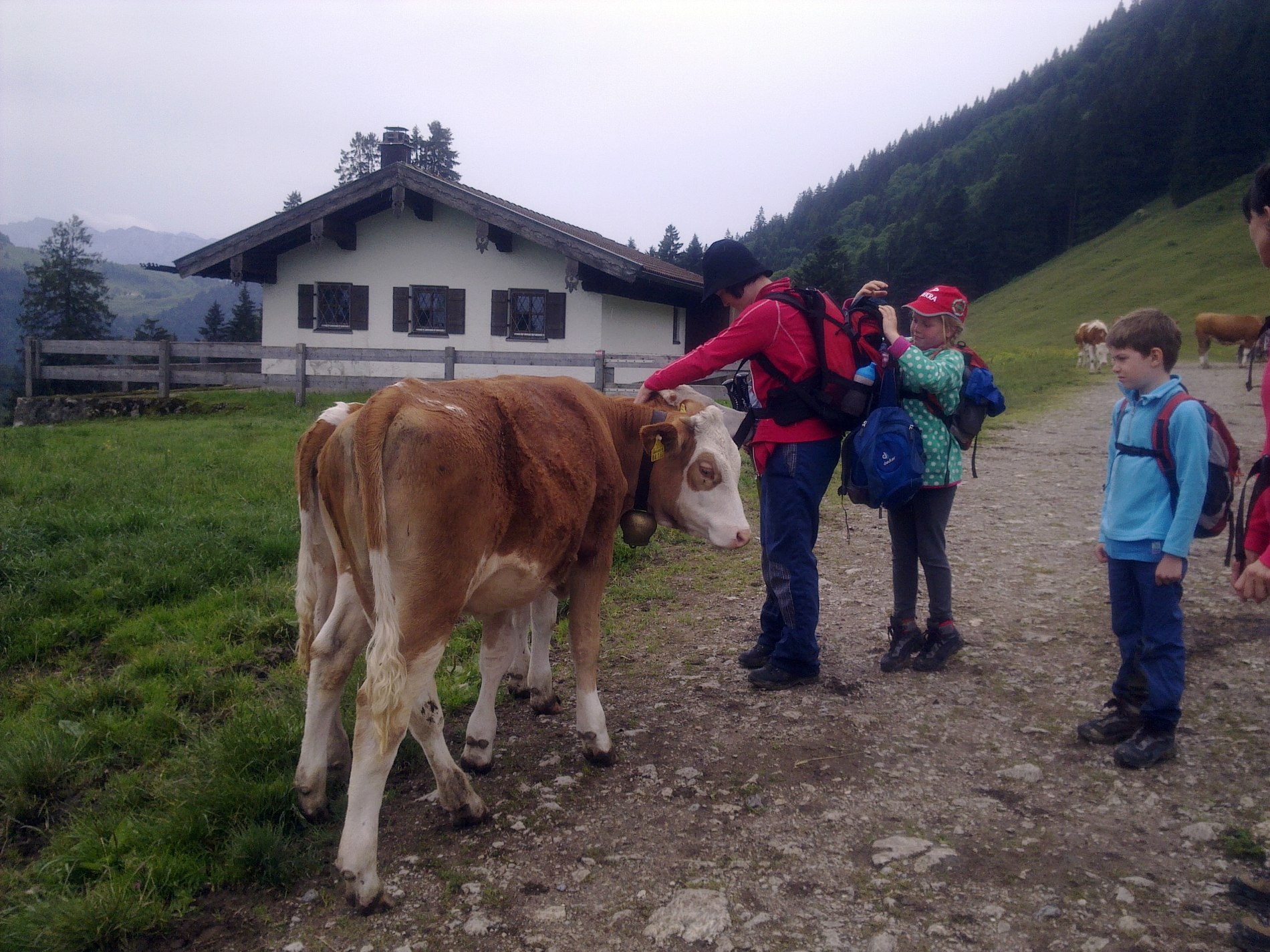 Der Inntaler Heuberg war an diesem Tag unser Ziel. Wir entschieden uns für einen Rundweg von Schweibern über Mailach auf die Aussichtskanzel. Der Blick in das Inntal war super. Nach einer kurzen Pause konnten wir schon eine fette Regenwolke herankommen sehen und so „verzupften“ wir uns wieder vom Gipfel und steuerten die Daffneralm an. Stefan und Thomas wollten noch auf die Wasserwand klettern – mussten aber wegen der Nässe den Versuch abbrechen. In der Almhütte war schön eingeheizt und wir konnten unsere nassen Sachen trocknen. Die Stärkung tat uns gut und der Regen hörte auf. Danach stiefelten wir trockenen Fußes weiter ins Tal. Trotz bedecktem Wetter doch ein gelungener Bergtag mit toll motivierten Kindern! Respekt!