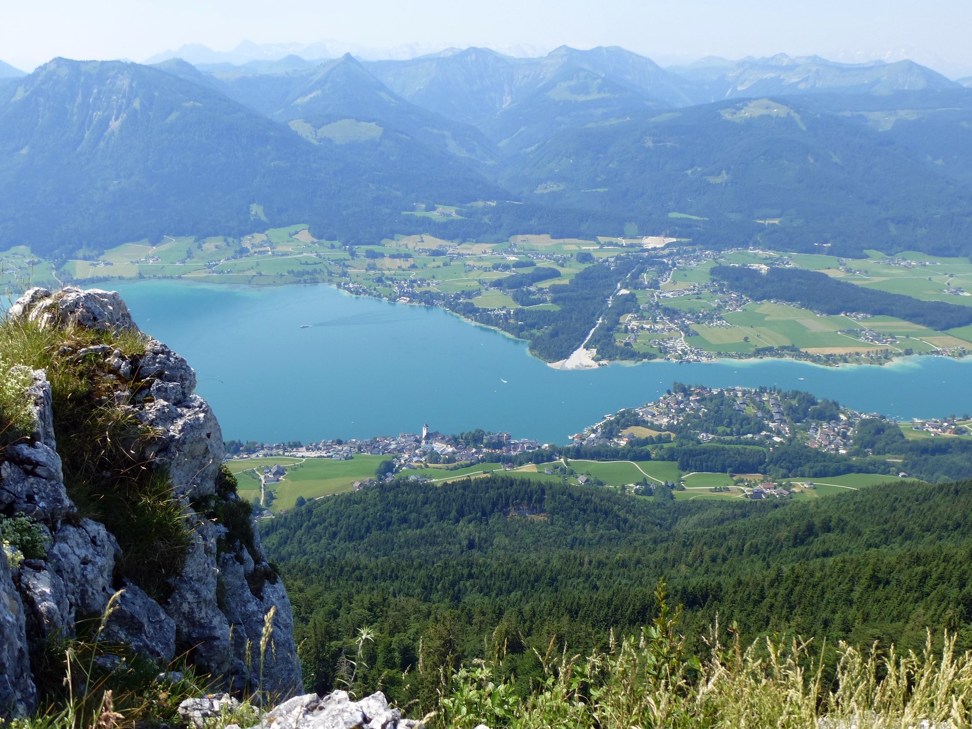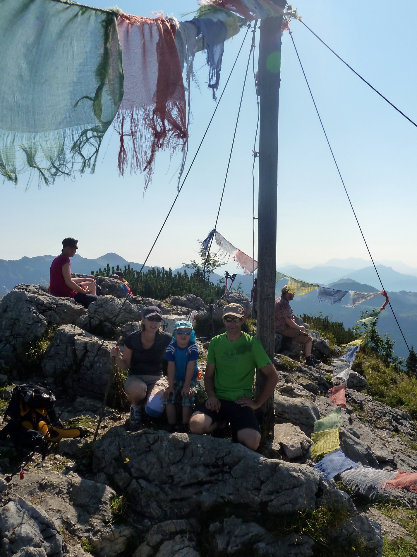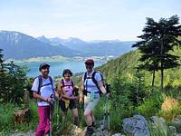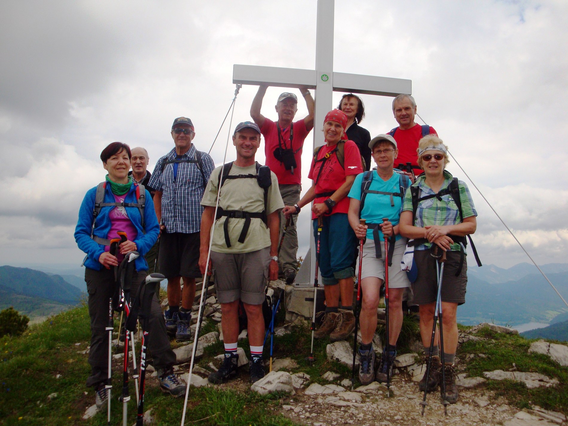 Einigermaßen kühl konnten wir dann im Schatten des Waldes an den bekannten Zwergerltafeln vorbei zur Vormaueralm aufsteigen, wo uns bis zum Gipfel noch ein sonniger Aufstieg erwartete. Nach ca. 2½ Stunden und einfacher Kraxelei zum Gipfel genossen wir die herrliche Aussicht über das Salzkammergut mit seinen Seen und ganz besonders den tollen Tiefblick zum Wolfgangssee. Nach der Gipfelbrotzeit wählten wir als Abstieg unseren Aufstiegsweg, weil dieser größtenteils schön schattig im Wald verläuft. Beim Mostbauer gönnten wir uns noch Haussulz und Bier, bevor wir uns vor der Heimfahrt im türkisblauen See erfrischten.