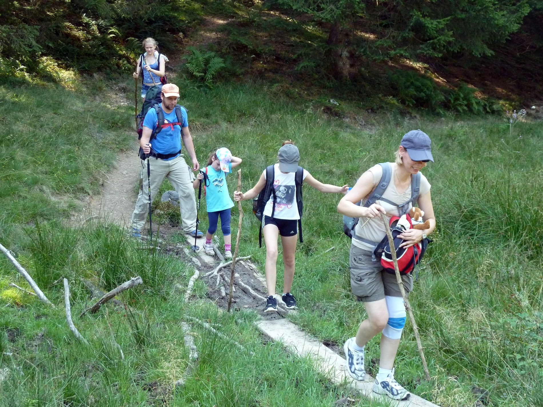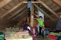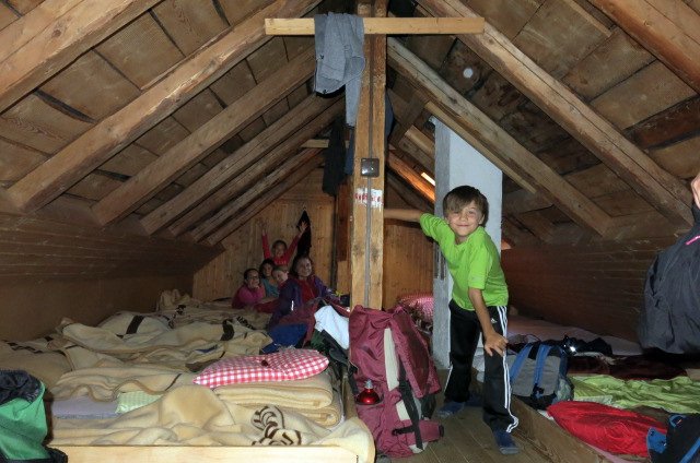 Unseren Aufstieg begannen wir von Sachrang aus über die Mesneralm (1 097 m) zum Spitzsteinaus. Neben dem für die Kinder beachtlichen Aufstieg von 600 Höhenmetern hatten wir mit Wespenstichen und vor allem mit der Hitze des Tages zu kämpfen. Kein Wunder, dass alle erschöpft (die Kinder vom Wandern und die Eltern vom Motivieren) das Tagesziel erreichten. Nur eine kurze Pause benötigen die Kinder und schon tobten sie durch die Gaststube und das Lager. Die Eltern benötigten schon eine längere Zeit der Erholung! Nach dem Abendessen, es wurde übrigens ein gigantisches Grillbuffet von den Hüttenleit veranstaltet, wurde die Zeit kurzweilig mit Karten und Brettspielen überbrückt, bis es zur Nachtruhe in das Lager ging.