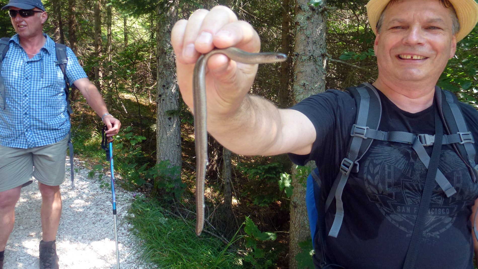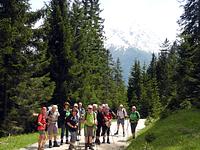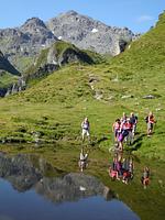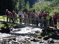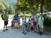 Direkt am Hintersee begann unsere diesjährige Kräuterwanderung. Entlang eines Baches marschierten wir an der Nationalpark-Info-Stelle mit dem Adler vorbei. Dies sollte jedoch der einzige sein, den wir zu sehen bekamen. Willi Harreiter zeigte uns immer wieder die verschiedensten Pflanzen und erklärte uns auch deren oft schon längst vergessene Heilwirkung in der Volksmedizin. Durch schattigen Bergwald erreichten wir die freien Flächen der Halsalm, wo wir sofort die Sommerhitze spürten. Auf der einfach bewirtschafteten aber gemütlichen Halsalm genossen alle den herrlichen Blick auf den Hintersee. Dort angekommen stellte sich die Frage: Erst im See abkühlen oder im Wirtshaus bei einem kühlen Getränk?